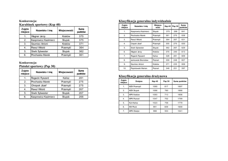 Konkurencja: Klasyfikacja generalna indywidualnie Karabinek sportowy (Ksp 40) Zajęte miejsce Nazwisko i imę Miejscowość Suma punktów Zajęte miejsce Nazwisko i imię Miejscowość Ksp 40 Psp 30 Suma punktów 1. Kasprowicz Kazimierz Słupsk 375 266 641 1. Wagner Jerzy Kraków 375 2. Prochaska Marek Przemyśl 361 275 636 2. Kasprowicz Kazimierz Słupsk 375 3. Pawul Witold Przemyśl 364 267 631 Kraków 371 4. Crapek Józef Przemyśl 355 275 630 Przemyśl 364 5. Siwik Sylwester Słupsk 362 267 629 Słupsk 362 6. Wagner Jerzy Kraków 375 240 613 Przemyśl 361 7. Rogacki Ryszard Kalisz 328 281 609 8. Jankowiak Bronisław Poznań 359 248 607 9. Szumiec Antoni Kraków 371 235 606 Popielewski Marian Poznań 346 251 597 3. Szumiec Antoni 4. Pawul Witold 5. Siwik Sylwester 6. Prochaska Marek Konkurencja: Pistolet sportowy (Psp 30) Zajęte miejsce Nazwisko i imę 10. Miejscowość Suma punktów Klasyfikacja generalna drużynowa 1. Rogacki Ryszard Kalisz 281 2. Prochaska Marek Przemyśl 275 Zajęte miejsce 3. Chrapek Józef Przemyśl 275 1. 4. Pawul Witold Przemyśl 267 5. Siwik Sylwester Słupsk 267 6. Kasprowicz Kazimierz Słupsk 266 Drużyna Ksp 40 Psp 30 Suma punktów MZK Przemyśl 1080 817 1897 2. MZK Słupsk 1086 780 1866 3. MPK Kraków 1093 713 1806 4. MPK Poznań 1047 752 1799 5. KLA Kalisz 1023 756 1779 6. KM Płock 991 609 1600 7. MPK Olsztyn 988 553 1541