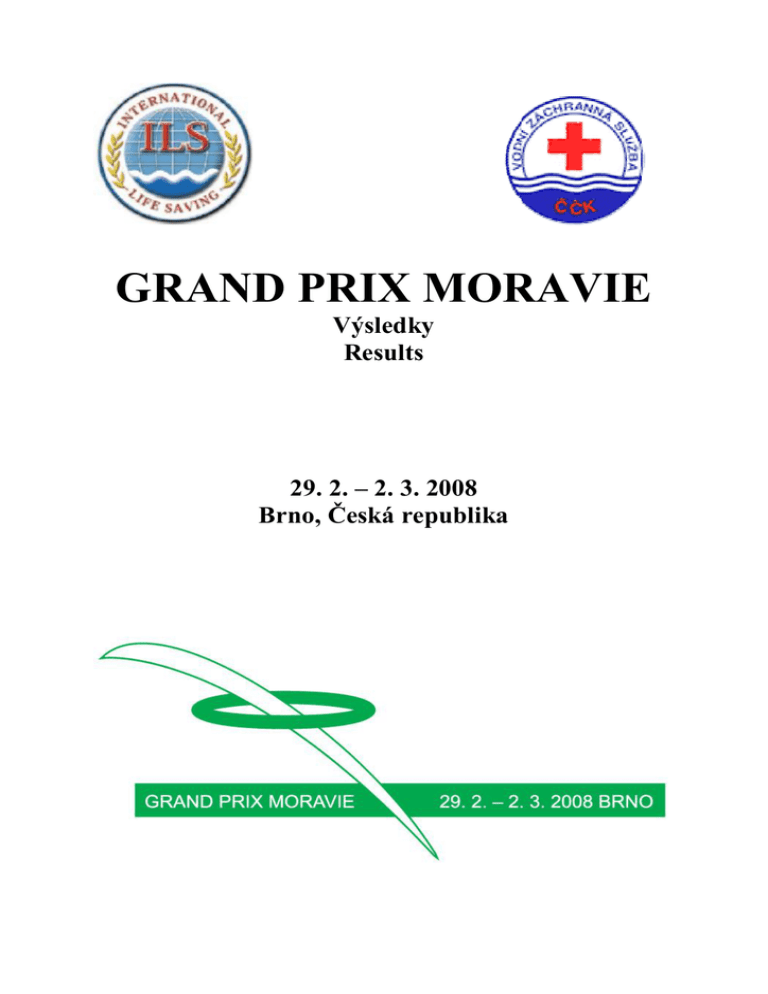 GRAND PRIX MORAVIE Výsledky Results 29. 2. – 2. 3. 2008 Brno, Česká republika 1 2 3 4 5 6 7 8 9 10 11 12 13 14 15 16 17 18 19 20 21 22 23 hlavní rozhodčí hlavní rozhodčí provedení disciplíny technický rozhodčí provedení disciplíny technický rozhodčí provedení disciplíny technický rozhodčí provedení disciplíny časomíra - 1 časomíra - 2 časomíra - 3 časomíra - 4 časomíra - 5 časomíra - 6 obrátkový rozhodčí 1-2 obrátkový rozhodčí 3-4 obrátkový rozhodčí 5-6 cílový rozhodčí hlavní cílový rozhodčí cílový rozhodčí startér pomocný startér pomocný startér vrchní časomíra zápis výsledků technický delegát Novák Ladislav Urbánek Petr Gospodaryková Hana Kyzlinková Katka Víznerová Lucie Zounková Lenka Svobodová Jana Gabrielová Hana Novotná Lenka Schmidtová Tereza Doubrava Tomáš Dikovits Martina Binder Uschi Kubižňáková Petra Laichmanová Marie Janáková Kristína Horvath Doris Suchopa Radomír Neřimová Vendula Navrátilová Pavlína Svobodová Lenka Vlach Petr Trtil Aleš Výsledky/Results Muži/Men 1. 100 m Záchrana modelu s ploutvemi/ 100 m Manikin Carry with Fins Příjmení a jméno Roč. Oddíl Výsl. čas Roz./Dr. 1. Sezen Anil 1992 GER 53.03 9/4 2. Wiencek Tomasz 1990 RYB 54.45 9/5 3. Blechar Julius 1991 GER 55.87 9/6 4. Krone Hendrik 1991 GER 56.08 8/4 5. Kaliszewski Maciej 1991 SZC 57.41 9/3 6. Dąbrowski Krystian 1990 SZC 58.74 7/3 7. Kosiński Michał 1990 SZC 59.49 9/2 8. Bielik Michal 1990 BRM 01:00.84 6/4 9. Nowak Vincent 1993 KEL 01:01.63 8/5 10. Bowyer Lukáš 1993 BRM 01:01.87 5/4 11. Eisenblätter Christian 1991 GER 01:01.94 7/1 12. Paška Kevin 1992 BRM 01:01.99 8/1 13. Hykrda Michal 1990 BRM 01:02.03 7/2 14. Franek Ondřej 1991 NER 01:02.78 8/2 15. Gressler Leon 1993 KEL 01:03.26 6/3 16. Falke Ruben 1993 KEL 01:06.13 5/1 17. Siefert Jannis 1993 KEL 01:06.72 6/5 18. Tlustý Martin 1993 SOB 01:07.29 3/2 19. Janeček Tomáš 1990 BRM 01:07.56 4/2 20. Bartusek Martin 1991 TER 01:08.24 5/3 21. Ondrůšek Jakub 1992 BRM 01:08.50 5/2 22. Kosiński Wojciech 1992 SZC 01:08.72 8/6 23. Strnad Dan 1991 JBC 01:09.02 2/3 24. Jiřička Karel 1991 NER 01:10.17 6/2 25. Hencl Martin 1991 JBC 01:10.24 4/4 SwimRace 3.0 SwimRace 3.0 Autoři: Jiří Banzet, Pavol Mravec, Jan Stuchlík Autoři: Jiří Banzet, Pavol Mravec, Jan Stuchlík Výsledky/Results Muži/Men 1. 100 m Záchrana modelu s ploutvemi/ 100 m Manikin Carry with Fins 26. Nový Michal 1992 KRN 01:10.64 7/4 27. Koráb Karel 1990 BRM 01:10.78 7/6 28. Komárek Robin 1991 BRM 01:10.96 6/6 29. Rejlek Tomáš 1991 JBC 01:11.37 5/5 30. Jančička Marek 1990 KRN 01:11.73 4/3 31. Zrůst Jakub 1991 SOK 01:11.82 8/3 32. Cabadaj Jan 1994 NER 01:12.99 7/5 33. Zeman Přemysl 1990 SOB 01:13.16 4/6 34. Ander Jakub 1993 KRN 01:13.30 3/6 35. Finstrle Petr 1990 KRN 01:14.21 3/3 36. Skála Jiří 1993 SOB 01:14.95 3/1 37. Schreiber Dan 1992 TER 01:16.50 3/4 38. Šimko Ladislav 1990 SOK 01:17.42 2/6 39. Lukeš Oldřich 1990 SOK 01:17.93 2/5 40. Tregler Michal 1991 JBC 01:19.69 1/2 41. Kuzmeniuk Michal 1993 NER 01:21.27 4/1 42. Mareš Jan 1992 NER 01:21.66 4/5 43. Ballo Fedor 1990 BRM 01:22.08 2/2 44. Baborovský Michael 1993 SOK 01:24.43 1/5 45. Hagan Dan 1994 NER 01:26.55 6/1 46. Zelenka Jan 1993 NER 01:45.01 2/1 47. Marhan Václav 1994 NER 01:45.66 1/4 48. Havlena Ladislav 1993 SOK 01:47.40 1/1 Slavík Filip 1994 NER diskval. - nedoplaval Chlum Patrik 1993 BRM diskval. - Předčasný start SwimRace 3.0 SwimRace 3.0 Autoři: Jiří Banzet, Pavol Mravec, Jan Stuchlík Autoři: Jiří Banzet, Pavol Mravec, Jan Stuchlík Výsledky/Results Muži/Men 1. 100 m Záchrana modelu s ploutvemi/ 100 m Manikin Carry with Fins Zeman Michael 1993 BRM diskval. - Nenastoupil Šrůta Michal 1993 SOB diskval. - Topení figuríny Roman Krzysztof 1991 RYB diskval. - Topení figuríny SwimRace 3.0 SwimRace 3.0 Autoři: Jiří Banzet, Pavol Mravec, Jan Stuchlík Autoři: Jiří Banzet, Pavol Mravec, Jan Stuchlík Výsledky/Results Ženy/Women 2. 100 m Záchrana modelu s ploutvemi/ 100 m Manikin Carry with Fins Příjmení a jméno Roč. Oddíl Výsl. čas Roz./Dr. 1. Luster Jessica 1990 GER 01:00.25 7/3 2. Pawelzik Mona 1990 GER 01:01.94 7/4 3. Franz Theresa 1991 GER 01:02.80 7/1 4. Pareigis Dana 1991 GER 01:05.63 7/2 5. Wingenfeld Jennifer 1993 KEL 01:09.69 6/6 6. Bueß Joana 1993 KEL 01:11.22 6/1 7. Meier Julia 1993 KEL 01:11.67 5/3 8. Kasalová Kristýna 1990 BRM 01:12.60 4/6 9. Bímová Jitka 1990 JBC 01:12.73 4/3 10. Franková Martina 1993 NER 01:12.87 6/5 11. Vlastníková Tereza 1991 BRM 01:12.88 3/4 12. Maikranzová Kateřina 1990 TER 01:14.05 5/4 13. Hykrdová Ivana 1993 BRM 01:14.17 6/3 14. Boyková Olga 1992 NER 01:16.15 4/4 15. Hůlová Irena 1992 BRM 01:16.70 4/5 16. Drahotová Monika 1991 SOK 01:17.22 5/6 17. Bímová Kateřina 1992 JBC 01:17.58 2/4 18. Ondrůšková Hana 1990 BRM 01:17.72 3/3 19. Šulcová Lucie 1991 NER 01:18.14 4/1 20. Bílá Lucie 1993 NER 01:24.40 4/2 21. Kiszková Tereza 1990 TER 01:25.19 3/6 22. Lejsková Pavlína 1992 JBC 01:28.41 2/6 23. Němcová Markéta 1991 TER 01:28.55 3/1 24. Maršovská Iveta 1994 BRM 01:28.73 2/1 SwimRace 3.0 SwimRace 3.0 Autoři: Jiří Banzet, Pavol Mravec, Jan Stuchlík Autoři: Jiří Banzet, Pavol Mravec, Jan Stuchlík Výsledky/Results Ženy/Women 2. 100 m Záchrana modelu s ploutvemi/ 100 m Manikin Carry with Fins 25. Jandová Markéta 1993 JBC 01:29.91 2/5 26. Pěknicová Daniela 1991 TER 01:30.49 3/2 27. Falgenhauerová Dita 1993 NER 01:31.34 5/1 28. Bernertová Tereza 1993 KRN 01:32.05 2/2 29. Del Faverová Jitka 1994 BRM 01:32.79 1/3 30. Juřicová Dominika 1990 TER 01:35.07 2/3 31. Kačerová Tereza 1993 NER 01:35.37 3/5 32. Šímová Klára 1993 BRM 01:41.72 1/1 33. Ohnoutková Michaela 1994 BRM 01:52.91 1/2 Soukupová Kateřina 1993 SOK diskval. - Topení figuríny Straková Leona 1993 BRM diskval. - Předčasný start Fellmer Michele 1992 KEL diskval. - Nenastoupila Zizlerová Marcela 1993 NER diskval. - To