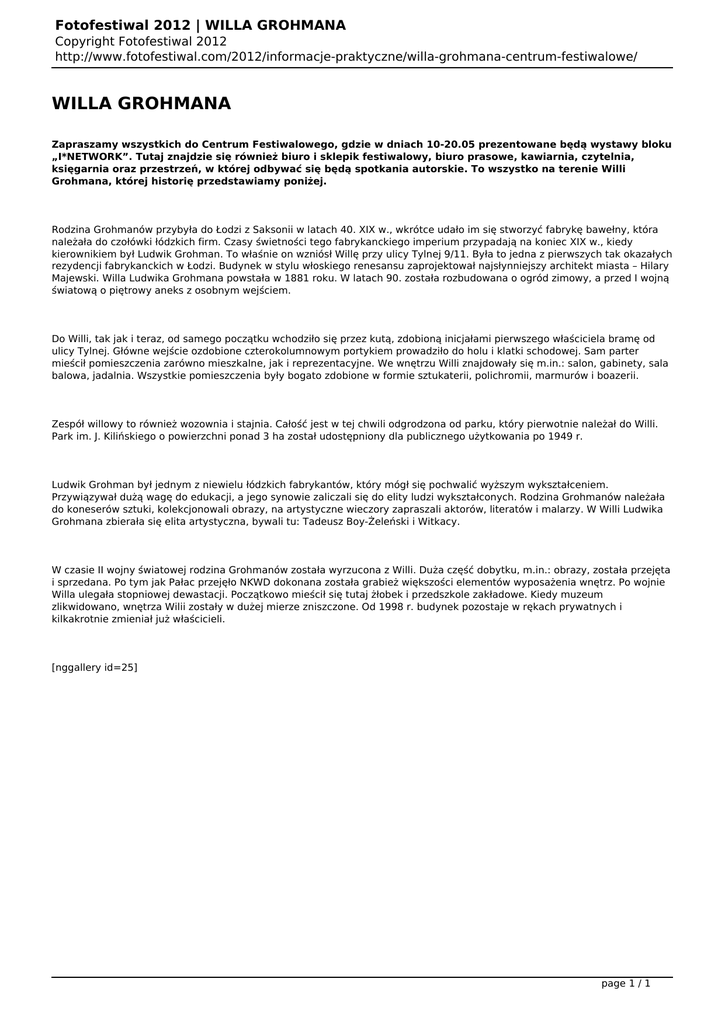 Fotofestiwal 2012 | WILLA GROHMANA Copyright Fotofestiwal 2012 http://www.fotofestiwal.com/2012/informacje-praktyczne/willa-grohmana-centrum-festiwalowe/ WILLA GROHMANA Zapraszamy wszystkich do Centrum Festiwalowego, gdzie w dniach 10-20.05 prezentowane będą wystawy bloku „I*NETWORK”. Tutaj znajdzie się również biuro i sklepik festiwalowy, biuro prasowe, kawiarnia, czytelnia, księgarnia oraz przestrzeń, w której odbywać się będą spotkania autorskie. To wszystko na terenie Willi Grohmana, której historię przedstawiamy poniżej. Rodzina Grohmanów przybyła do Łodzi z Saksonii w latach 40. XIX w., wkrótce udało im się stworzyć fabrykę bawełny, która należała do czołówki łódzkich firm. Czasy świetności tego fabrykanckiego imperium przypadają na koniec XIX w., kiedy kierownikiem był Ludwik Grohman. To właśnie on wzniósł Willę przy ulicy Tylnej 9/11. Była to jedna z pierwszych tak okazałych rezydencji fabrykanckich w Łodzi. Budynek w stylu włoskiego renesansu zaprojektował najsłynniejszy architekt miasta – Hilary Majewski. Willa Ludwika Grohmana powstała w 1881 roku. W latach 90. została rozbudowana o ogród zimowy, a przed I wojną światową o piętrowy aneks z osobnym wejściem. Do Willi, tak jak i teraz, od samego początku wchodziło się przez kutą, zdobioną inicjałami pierwszego właściciela bramę od ulicy Tylnej. Główne wejście ozdobione czterokolumnowym portykiem prowadziło do holu i klatki schodowej. Sam parter mieścił pomieszczenia zarówno mieszkalne, jak i reprezentacyjne. We wnętrzu Willi znajdowały się m.in.: salon, gabinety, sala balowa, jadalnia. Wszystkie pomieszczenia były bogato zdobione w formie sztukaterii, polichromii, marmurów i boazerii. Zespół willowy to również wozownia i stajnia. Całość jest w tej chwili odgrodzona od parku, który pierwotnie należał do Willi. Park im. J. Kilińskiego o powierzchni ponad 3 ha został udostępniony dla publicznego użytkowania po 1949 r. Ludwik Grohman był jednym z niewielu łódzkich fabrykantów, który mógł się pochwalić wyższym wykształceniem. Przywiązywał dużą wagę do edukacji, a jego synowie zaliczali się do elity ludzi wykształconych. Rodzina Grohmanów należała do koneserów sztuki, kolekcjonowali obrazy, na artystyczne wieczory zapraszali aktorów, literatów i malarzy. W Willi Ludwika Grohmana zbierała się elita artystyczna, bywali tu: Tadeusz Boy-Żeleński i Witkacy. W czasie II wojny światowej rodzina Grohmanów została wyrzucona z Willi. Duża część dobytku, m.in.: obrazy, została przejęta i sprzedana. Po tym jak Pałac przejęło NKWD dokonana została grabież większości elementów wyposażenia wnętrz. Po wojnie Willa ulegała stopniowej dewastacji. Początkowo mieścił się tutaj żłobek i przedszkole zakładowe. Kiedy muzeum zlikwidowano, wnętrza Wilii zostały w dużej mierze zniszczone. Od 1998 r. budynek pozostaje w rękach prywatnych i kilkakrotnie zmieniał już właścicieli. [nggallery id=25] page 1 / 1