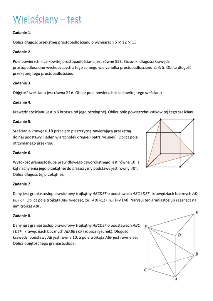 Zadanie 1. Oblicz długość przekątnej prostopadłościanu o wymiarach 5 × 12 × 13 Zadanie 2. Pole powierzchni całkowitej prostopadłościanu jest równe 558. Stosunki długości krawędzi prostopadłościanu wychodzących z tego samego wierzchołka prostopadłościanu 2: 3: 5. Oblicz długość przekątnej tego prostopadłościanu. Zadanie 3. Objętość sześcianu jest równa 216. Oblicz pole powierzchni całkowitej tego sześcianu Zadanie 4. Krawędź sześcianu jest o 6 krótsza od jego przekątnej. Oblicz pole powierzchni całkowitej tego sześcianu. Zadanie 5. Sześcian o krawędzi 10 przecięto płaszczyzną zawierającą przekątną dolnej podstawy i jeden wierzchołek drugiej (patrz rysunek). Oblicz pole otrzymanego przekroju. Zadanie 6. Wysokość graniastosłupa prawidłowego czworokątnego jest równa 10, a kąt nachylenia jego przekątnej do płaszczyzny podstawy jest równy 30∘ . Oblicz długość tej przekątnej. Zadanie 7. Dany jest graniastosłup prawidłowy trójkątny ABCDEF o podstawach ABC i DEF i krawędziach bocznych AD, BE i CF. Oblicz pole trójkąta ABF wiedząc, że |AB|=12 i |CF|=√148. Narysuj ten graniastosłup i zaznacz na nim trójkąt ABF. Zadanie 8. Dany jest graniastosłup prawidłowy trójkątny ABCDEF o podstawach ABC i DEF i krawędziach bocznych AD,BE i CF (zobacz rysunek). Długość krawędzi podstawy AB jest równa 10, a pole trójkąta ABF jest równe 65. Oblicz objętość tego graniastosłupa. Zadanie 9. W graniastosłupie prawidłowym czworokątnym ABCDEFGH przekątna AC podstawy ma długość 8. Kąt ACE jest równy 45∘ . Oblicz objętość ostrosłupa ABCDE przedstawionego na poniższym rysunku. Zadanie 10. W graniastosłupie prawidłowym czworokątnym wysokość graniastosłupa jest o 2 krótsza od przekątnej podstawy i o 4 krótsza od przekątnej graniastosłupa. Oblicz sinus kąta pomiędzy przekątną graniastosłupa a płaszczyzną podstawy. Zadanie 11. W graniastosłupie prawidłowym czworokątnym ABCDEFGH połączono punkty będące środkami krawędzi BC, CD, AD i GH. Wyznacz objętość powstałej bryły wiedząc, że |𝐷𝐵| = 8√2 i kąt DBH ma miarę 30∘ . Zadanie 12. Podstawą graniastosłupa ABCDEFGH jest prostokąt ABCD (zobacz rysunek), którego krótszy bok ma długość 6. Przekątna prostokąta ABCD tworzy z jego dłuższym bokiem kąt 30∘ . Przekątna HB graniastosłupa tworzy z płaszczyzną jego podstawy kąt 60∘ . Oblicz objętość tego graniastosłupa. Zadanie 13. Wysokość graniastosłupa prawidłowego czworokątnego jest równa 24. Przekątna graniastosłupa jest nachylona do płaszczyzny 5 podstawy pod kątem, którego cosinus jest równy 13. Oblicz pole powierzchni całkowitej tego graniastosłupa. Zadanie 14. W ostrosłupie prawidłowym czworokątnym krawędź boczna ma długość 8 cm, a krawędź podstawy √18 cm. Oblicz cosinus kąta nachylenia krawędzi bocznej do płaszczyzny podstawy Zadanie 15. Pole podstawy ostrosłupa prawidłowego czworokątnego jest równe 144 cm2, a jego pole powierzchni bocznej jest równe 240 cm2. Oblicz objętość tego ostrosłupa. Zadanie 16. W ostrosłupie prawidłowym czworokątnym ABCDS o podstawie ABCD i wierzchołku S trójkąt ACS jest równoboczny i ma bok długości 10. Oblicz sinus kąta nachylenia ściany bocznej do płaszczyzny podstawy tego ostrosłupa (zobacz rysunek). Zadanie 17. W graniastosłupie prawidłowym czworokątnym ABCDEFGH przekątna AC podstawy ma długość 8. Kąt ACE jest równy 30∘ . Oblicz objętość ostrosłupa ABCDE przedstawionego na poniższym rysunku. Zadanie 18. Podstawą ostrosłupa prawidłowego czworokątnego ABCDS jest kwadrat ABCD. Pole trójkąta równoramiennego ACS jest równe 108oraz |𝐴𝐶|: |𝐴𝑆| = 3: 5 . Oblicz pole powierzchni bocznej tego ostrosłupa. Zadanie 19. Wysokość ostrosłupa prawidłowego czworokątnego jest równa 10. Krawędź boczna jest nachylona do płaszczyzny podstawy pod kątem 45∘ . Oblicz objętość tego ostrosłupa. Zadanie 20. Dany jest ostrosłup prawidłowy trójkątny. Pole powierzchni bocznej tego ostrosłupa jest równe 27, a kąt płaski ściany bocznej przy podstawie ma miarę α i 𝑡𝑔𝛼 = 3. Wyznacz cosinus kąta nachylenia ściany bocznej ostrosłupa do płaszczyzny jego podstawy. Zadanie 21. Krawędź boczna ostrosłupa prawidłowego trójkątnego jest nachylona do płaszczyzny podstawy pod kątem 30∘ . Odległość spodka wysokości ostrosłupa od krawędzi jest równa 12. Oblicz objętość tego ostrosłupa. Zadanie 22. Objętość ostrosłupa prawidłowego trójkątnego ABCS (tak jak na rysunku) jest równa 108, a promień okręgu wpisanego w podstawę ABC tego ostrosłupa jest równy 3. Oblicz tangens kąta między wysokością tego ostrosłupa i jego ścianą boczną. Zadanie 23 Podstawą ostrosłupa ABCD jest trójkąt ABC. Krawędź AD jest wysokością ostrosłupa (zobacz rysunek). Oblicz objętość ostrosłupa ABCD, jeśli wiadomo, ż𝑒 𝐴𝐷 = 12, 𝐵𝐶 = 8, 𝐵𝐷 = 𝐶𝐷 = 15. Zadanie 24. Podstawą ostrosłupa ABCDS jest romb ABCD o boku długości 6. Kąt ABC rombu ma miarę 120∘ oraz |𝐴𝑆| = |𝐶𝑆| = 13 𝑖 |𝐵𝑆| = |𝐷𝑆|. Oblicz sinus kąta nachylenia krawędzi BS do płaszczyzny podstawy ostrosłupa. Zadanie 25. Podstawą ostrosłupa ABCDW jest prostokąt ABCD. Krawędź boczna DW jest wysokością tego ostrosłupa. Krawędzie boczne AW, BW i CW mają następujące długości: |𝐴𝑊| = 8, |𝐵𝑊| = 12, |𝐶𝑊| = 9. Oblicz objętość tego ostrosłupa. Zadanie 26. Podstawą ostrosłupa ABCDS jest kwadrat ABCD. Wysokość SE ściany bocznej ADS jest jednocześnie wysokością ostrosłupa, a punkt E jest środkiem krawędzi AD (zobacz rysunek). Pole ściany ADS jest równe 24 cm2, a objętość ostrosłupa jest równa 128 cm3. Oblicz miarę kąta nachylenia krawędzi bocznej CS do płaszczyzny podstawy ostrosłupa. Wynik zaokrąglij do 1∘ . Zadanie 27. Podstawą ostrosłupa ABCDS jest prosto