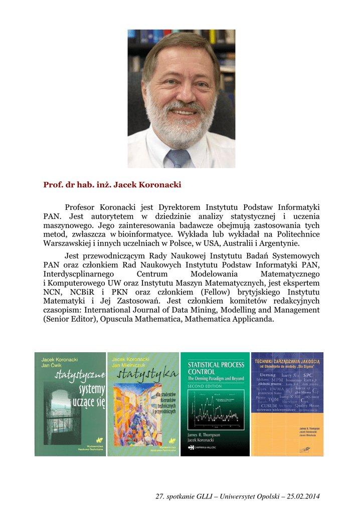 Prof. dr hab. inż. Jacek Koronacki Profesor Koronacki jest Dyrektorem Instytutu Podstaw Informatyki PAN. Jest autorytetem w dziedzinie analizy statystycznej i uczenia maszynowego. Jego zainteresowania badawcze obejmują zastosowania tych metod, zwłaszcza w bioinformatyce. Wykłada lub wykładał na Politechnice Warszawskiej i innych uczelniach w Polsce, w USA, Australii i Argentynie. Jest przewodniczącym Rady Naukowej Instytutu Badań Systemowych PAN oraz członkiem Rad Naukowych Instytutu Podstaw Informatyki PAN, Interdyscplinarnego Centrum Modelowania Matematycznego i Komputerowego UW oraz Instytutu Maszyn Matematycznych, jest ekspertem NCN, NCBiR i PKN oraz członkiem (Fellow) brytyjskiego Instytutu Matematyki i Jej Zastosowań. Jest członkiem komitetów redakcyjnych czasopism: International Journal of Data Mining, Modelling and Management (Senior Editor), Opuscula Mathematica, Mathematica Applicanda. 27. spotkanie GLLI – Uniwersytet Opolski – 25.02.2014