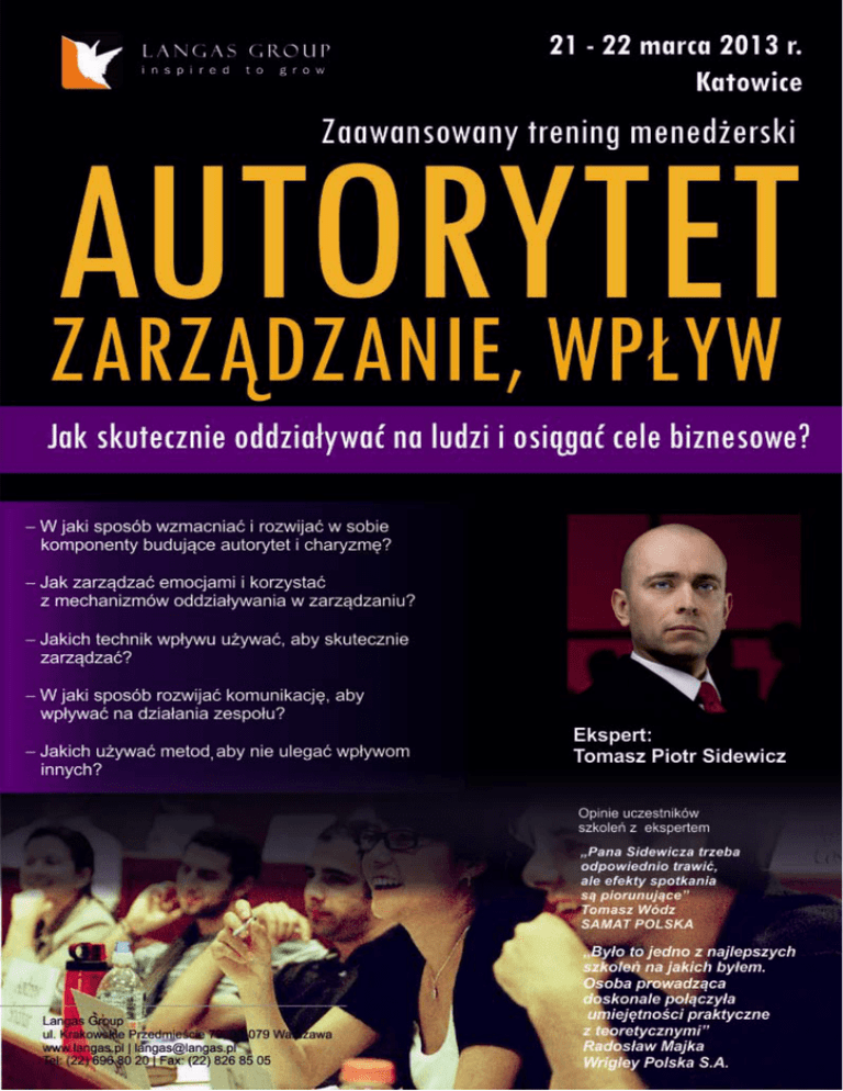Zaawansowany trening menedżerski AUTORYTET, ZARZĄDZANIE, WPŁYW Jak skutecznie oddziaływać na ludzi i osiągać cele biznesowe? JAK SKUTECZNIE ODDZIAŁYWAĆ NA LUDZI I OSIĄGAĆ CELE BIZNESOWE? „Skuteczność w zarządzaniu ludźmi to nic innego jak umiejętność wywierania wpływu w odpowiednich okolicznościach. Kierowanie biznesem, zespołem specjalistów, projektem, sprowadza się do prostej zasady osiągania założonych rezultatów w wyniku działań podwładnych. Jakie zatem narzędzia oddziaływania są w posiadaniu menedżera? Jak maksymalizować efekty, przy minimalizacji nakładów? Nikt nie zyska autorytetu wśród podwładnych tylko dlatego, że został mianowany kierownikiem. Sztuka zarządzania nie sprowadza się przecież tylko do wydawania rozkazów i grożenia palcem. Sztuka zarządzania to umiejętność planowania, delegowania, konsekwentnego rozliczania, motywowania, wspierania, nagradzania i karania. A wszystko to w oparciu o znajomość ludzkiej natury, motywacji, predyspozycji i kompetencji. Badania na temat tego co sprawia, że ludzie odnoszą sukces ujawniły, że Ci którzy cieszą się w życiu większym szczęściem i bogactwem, posiadają wysoce rozwinięte umiejętności perswazji, wywierania wpływu, sprzedaży, negocjacji, motywacji, przywództwa, a także rozumieją ludzką naturę. Zapraszam na zaawansowany trening umiejętności zarządzania.” Tomasz Piotr Sidewicz „Nastawione na praktyczne podejście do tematu. Skierowane do osób, które wiedzą, po co im taka wiedza, bez miejsca dla ludzi, którzy znaleźli się tu przez przypadek” – Maciej Repiński, Gemalto Sp. z o.o., uczestnik szkolenia prowadzonego przez Tomasza Piotra Sidewicza KORZYŚCI DLA UCZESTNIKÓW SZKOLENIA ekspert: Szkolenie skupia się na metodach budowania autorytetu oraz wywierania wpływu w zarządzaniu. Zajęcia dają możliwość: TOMASZ PIOTR SIDEWICZ Ekspert w dziedzinie negocjacji, perswazji i wywierania wpływu. Trener i coach, prowadzi projekty audytu działów, audytu personalnego oraz rekrutacji pracowników. 20 lat życia zawodowego, w tym 18 lat to praca na własny rachunek wykształciły w nim określoną postawę biznesową, opartą o zasadę – W biznesie mam tylko to co sam wynegocjuję. Taka postawa powoduje, że siadając do negocjacyjnego stołu wie, że nie może popełnić błędów, ponieważ szybko odczuje ich skutki na własnym rachunku. Przecież biznes to dziedzina praktyczna, która rządzi się wynikami, targetami i budżetami. To selektor naturalny, decydujący o czyimś być albo nie być. To, że ponad 90% bankrutuje w pierwszych latach swojej działalności daje do myślenia. Jego doświadczenie zawodowe to przede wszystkim współpraca z wieloma firmami, które z racji swojej działalności, funkcjonują na rynkach międzynarodowych. Dzięki temu poznał specyfikę, prawie wszystkich krajów europejskich, Afryki Płn. oraz USA i Kanady. 15 lat pracy w handlu zagranicznym oraz prowadzenie negocjacji z obcokrajowcami nauczyły go wysokiej kultury biznesowej niezbędnej w środowisku międzykulturowym. Doświadczenie zawodowe oraz profesjonalizm Tomasza Piotra Sidewicza potwierdzone są licznymi referencjami od klientów, udziałem w medialnych przedsięwzięciach oraz współpracą ze światem biznesu, ośrodkami naukowymi i mediami − − − − − − Zwiększenie świadomości w zakresie indywidualnych mechanizmów, które oddalają lub przybliżają do bycia skutecznym menedżerem Poznanie, analiza i przećwiczenie poszczególnych elementów komunikacji menedżerskiej, narzędzi retoryki oraz technik autoprezentacji, które są kluczowe dla budowania autorytetu i skuteczności realizacji celów biznesowych Pogłębienie wiedzy i rozumienia mechanizmów występujących na styku psychologicznych i biznesowych interakcji Wyznaczenie swoich obszarów rozwoju wymagających szlifu w zakresie budowania autorytetu oraz wywierania wpływu Pogłębienie umiejętności analizowania ludzkich zachowań w sytuacjach biznesowych Zrozumienie motywów działań i manipulacji, jakie stosuje otoczenie oraz poznanie metod obrony JAK PRZEBIEGA SZKOLENIE? Szkolenie przyjmuje formę intensywnego treningu zadaniowego nazywanego grą. Jej głównym zadaniem jest rozwój uczestników przez doświadczenie. Nauka przez działanie bazuje na zadaniach, które można nazwać wyzwaniami, jakie stawia się przed uczestnikami. Taka forma zajęć pozwala zwiększyć szansę na zmianę i daje możliwość uzyskania trwalszych efektów. Uczestnicy otrzymują zadania, które wymagają rozpracowania i zrealizowania we wzajemnej interakcji (również z trenerem). Kolejne zadania mają za zadanie sprawdzić charakter (postawy) w zakresie: pewności siebie, asertywności, podatności ze strony innych i umiejętności wpływania na innych, perswadowania w procesie komunikacji. Praca podczas zajęć to praca na zasobach uczestników równolegle prowadzona z wprowadzaniem nowych doświadczeń. Gra jest przeplatana elementami teorii, która jako niezbędny element pozwala ugruntować wiedzę i zrozumieć interdyscyplinarność obszaru, jakim jest wywieranie wpływu w zarządzaniu. Dodatkowym element szkolenia jest analiza wybranych case study przedstawiających w 100% naturalne sytuacje zarejestrowane na materiałe VIDEO. . DO KOGO ADRESOWANE JEST SZKOLENIE? Szkolenie skierowane jest do menedżerów, kierowników, dyrektorów świadomych biznesowo, z wiedzą o zarządzaniu, komunikacji interpersonalnej oraz zasadach wpływu społecznego na poziomie średnim, którzy nastawieni są na samodoskonalenie, proaktywność, i którzy posiadają silną motywację wewnętrzną do poznania swoich obszarów rozwoju w wyznaczonym obszarze. Udział w szkoleniu/treningu i rozwój własnych kompetencji zmusza do opuszczenia swojej strefy komfortu psychicznego. Szkolenie/trening o charakterze zadaniowym pozbawione jest charakteru stricte wykładowego/slajdowego/scenkowego. Zachęcam Państw