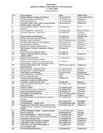 Kalendarz gminnych imprez kulturalnych i rekreacyjnych - w roku 2016 (wykaz ogólny) L.p. 1. 2. 3. 4. 5. 6. 7. 8. 9. 10. 11. 12. 13. 14. 15. 16. 17. 18. 19. 20. 21. 22. 23. 24. 25. 26. 27. 28. 29. 30. 31. 32. 33. 34. 35. 36. 37. 38. 39. 40. 41. 42. 43. 44. 45. Nazwa imprezy Wielka Orkiestra Świątecznej Pomocy Przegląd Zespołów Kolędniczych Gminny Bal Sportowca Kwartały Sztuki. Anna Asmus i jej przyjaciele… Polskie Kolędy i Pastorałki Sesja popularno-naukowa „Zaślubiny Polski z Morzem” „Teatr objazdowy – Ferie 2016” Warsztaty Muzyczne – Ferie 2016 Data 10 stycznia (N) 13 stycznia (śr) 16 stycznia (sob) 24 stycznia (N) Miejscowość Teren Gminy Puck Żelistrzewo Żelistrzewo Żelistrzewo 09 lutego (wt) Puck 15 lutego (pon) 19 lutego (pt) Zimowy Marsz na Orientację Konkurs Recytatorski Poezji Polskiej Przegląd Teatrów Szkolnych Wiosenny Rajd Rowerowy na Orientację Przegląd Muzyki Szkolnej Konkurs Recytatorski „Rodnej Mowy” XII Obchody 3-Majowe. Spotkanie z Pieśnią Maryjną Konkurs Poetycki „Błękitna Struna” Gminne Obchody Święta Ludowego. „Bielawa’2016 ” „Bałtycki Festiwal Nauki” Gminny Festiwal Kultury Szkolnej Rozstrzygnięcie konkursów wystawienniczych Podsumowanie „Aktywności Kulturalnej Szkół” Obchody Dni Gminy Puck – 25.lecie Samorządności Zlot Turystyczny – Mechowo’2016 „Ścinanie Kani - Sobótka Gminna” Letni Marsz na Orientację „Teatr Objazdowy – Lato 2016” Wystawa archeologiczna Festiwal Pieśni Kaszubskiej. „Kaszëbsczé tónë nad Môlim Mòrză.” „Łowisko – Osada Łowców Fok” „Figle Gnieżdżewskich Gburów” - festyn folklorystyczny „Święto Chleba” Letni Rajd Rowerowy na Orientację Dożynki Gminno-Powiatowe Europejskie Dni Dziedzictwa Dzień Ziemniaka Warsztaty Artystyczne dla Młodzieży Szkolnejplastyka „Swiăto Brzadë” „Grzybobranie” – piknik KGW Inauguracja Roku Kulturalnego Gminy Puck i „Klubowy Laur”. Koncert Cysterski „Kwartały Sztuki”. „Méster Bëlnégò Czëtaniô” – konkurs gminny Dzień Gęsi KGW Dzień Niepodległości – Obchody Gminne Pucki Salon Artystyczny. Puck nad Małym Morzem „Kaszëbsczé Brëmzowani” XXI Turniej Kół Gospodyń Wiejskich „Mikołajki” kobiet wiejskich. KGW XXII Spotkanie Rodzin Muzykujących „Na kaszubską nutę” Wieczór Bożonarodzeniowy. 21 lutego (N) 09 marca (śr) 06-07 kwietnia (śr-czw) 24 kwietnia (N) 26 kwietnia (wt) 29 kwietnia (pt) 03 maja (N) Placówki kultury Celbowo i Gnieżdżewo Domatówko Strzelno Żelistrzewo Leśniewo Żelistrzewo Połczyno Żelistrzewo 11 maja (śr) 15 maja (N) Domatowo 21 maja (czw) Rzucewo Żelistrzewo 31 maja (wt) 03-05 czerwca (pt-N) Żelistrzewo 11 czerwca (sob) 23 czerwca (czw) 26 czerwca (N) lipiec lipiec 10 lipca (N) Mechowo Strzelno Domatówko Placówki kultury Rzucewo Swarzewo 24 lipca (N) 06 sierpnia (sob) Rzucewo Gnieżdżewo 15 sierpnia (pon) 21 sierpnia (N) 28 sierpnia (N) 10-11 września (sob-N) 18 września (N) 21 września (śr) Sławutowo Leśniewo Swarzewo Rzucewo Celbowo Rekowo Górne 25 września (N) 01 października (sob) 09 października (N) Werblinia Mechowo Żelistrzewo 14 października (pt) 06 listopada (N) 11 listopada (pt) 11 listopada (pt) 13 listopada (N) 20 listopada (N) 06 grudnia (wt) 11 grudnia (N) Strzelno Strzelno Zdrada Puck Gnieżdżewo Żelistrzewo Swarzewo Starzyno 18 grudnia (N) Żelistrzewo