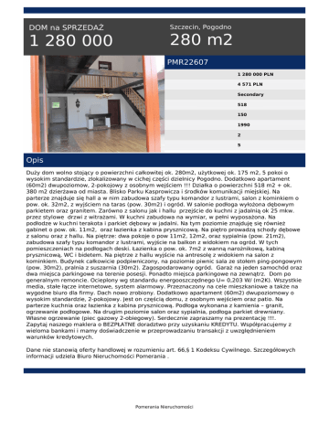 DOM na SPRZEDAŻ 1 280 000 Szczecin, Pogodno 280 m2 PMR22607 1 280 000 PLN 4 571 PLN Secondary 518 150 1990 2 5 Opis Duży dom wolno stojący o powierzchni całkowitej ok. 280m2, użytkowej ok. 175 m2, 5 pokoi o wysokim standardzie, zlokalizowany w cichej części dzielnicy Pogodno. Dodatkowo apartament (60m2) dwupoziomow, 2-pokojowy z osobnym wejściem !!! Działka o powierzchni 518 m2 + ok. 380 m2 dzierżawa od miasta. Blisko Parku Kasprowicza i środków komunikacji miejskiej. Na parterze znajduje się hall a w nim zabudowa szafy typu komandor z lustrami, salon z kominkiem o pow. ok. 32m2, z wyjściem na taras (pow. 30m2) i ogród. W salonie podłoga wyłożona dębowym parkietem oraz granitem. Zarówno z salonu jak i hallu przejście do kuchni z jadalnią ok 25 mkw. przez stylowe drzwi z witrażami. W kuchni zabudowa na wymiar, w pełni wyposażona. Na podłodze w kuchni terakota i parkiet dębowy w jadalni. Na tym poziomie znajduję się również gabinet o pow. ok. 11m2, oraz łazienka z kabina prysznicową. Na piętro prowadzą schody dębowe z salonu oraz z hallu. Na piętrze: dwa pokoje o pow 11m2, 12m2, oraz sypialnia (pow. 21m2), zabudowa szafy typu komandor z lustrami, wyjście na balkon z widokiem na ogród. W tych pomieszczeniach na podłogach deski. Łazienka o pow. ok. 7m2 z wanną narożnikową, kabiną prysznicową, WC i bidetem. Na piętrze z hallu wyjście na antresolę z widokiem na salon z kominkiem. Budynek całkowicie podpiwniczony, na poziomie piwnic sala ze stołem ping-pongowym (pow. 30m2), pralnia z suszarnia (30m2). Zagospodarowany ogród. Garaż na jeden samochód oraz dwa miejsca parkingowe na terenie posesji. Ponadto miejsca parkingowe na zewnątrz. Dom po generalnym remoncie. Ocieplony wg standardu energooszczędnego U= 0,203 W/ (m2K). Wszystkie media, stałe łącze internetowe, system alarmowy. Przeznaczony na cele mieszkaniowe a także na wygodne biuro dla firmy. Dach nowo zrobiony. Dodatkowo apartament (60m2) dwupoziomowy o wysokim standardzie, 2-pokojowy. Jest on częścią domu, z osobnym wejściem oraz patio. Na parterze kuchnia oraz łazienka z kabina prysznicową. Podłoga wykonana z kamienia – granit, ogrzewanie podłogowe. Na drugim poziomie salon oraz sypialnia, podłoga parkiet drewniany. Własne ogrzewanie (piec gazowy 2-obiegowy). Serdecznie zapraszamy na prezentację !!!. Zapytaj naszego maklera o BEZPŁATNE doradztwo przy uzyskaniu KREDYTU. Współpracujemy z wieloma bankami i mamy doświadczenie w przeprowadzaniu transakcji z uwzględnieniem warunków kredytowych. Dane nie stanowią oferty handlowej w rozumieniu art. 66,§ 1 Kodeksu Cywilnego. Szczegółowych informacji udziela Biuro Nieruchomości Pomerania . Pomerania Nieruchomości Wojciech Dembczyński tel. 697 767 787; 914894242 email: [email protected] Pomerania Nieruchomości Powered by TCPDF (www.tcpdf.org)