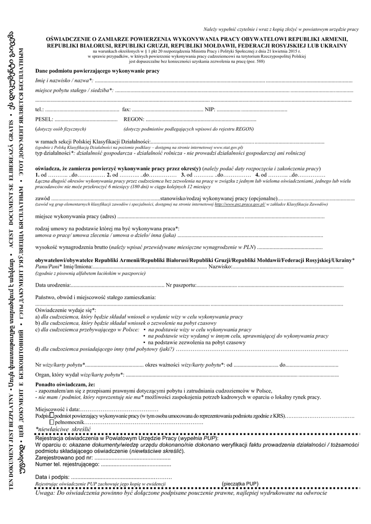 ЦЕЙ ДОКУМЕНТ Е БЕЗКОШТОВНИЙ ▪ ГЭТЫ ДАКУМЕНТ З’ЯЎЛЯЕЦЦА БЯСПЛАТНЫМ ▪ ЭТОТ ДОКУМЕНТ ЯВЛЯЕТСЯ БЕСПЛАТНЫМ უფასოდ ▪ ეს დოკუმენტი გაიცემა ACEST DOCUMENT SE ELIBEREAZĂ GRATIS ▪ TEN DOKUMENT JEST BEZPŁATNY ▪ Սույն փաստաթուղթը տարածվում է անվճար ▪ Należy wypełnić czytelnie i wraz z kopią złożyć w powiatowym urzędzie pracy OŚWIADCZENIE O ZAMIARZE POWIERZENIA WYKONYWANIA PRACY OBYWATELOWI REPUBLIKI ARMENII, REPUBLIKI BIAŁORUSI, REPUBLIKI GRUZJI, REPUBLIKI MOŁDAWII, FEDERACJI ROSYJSKIEJ LUB UKRAINY na warunkach określonych w § 1 pkt 20 rozporządzenia Ministra Pracy i Polityki Społecznej z dnia 21 kwietnia 2015 r. w sprawie przypadków, w których powierzenie wykonywania pracy cudzoziemcowi na terytorium Rzeczypospolitej Polskiej jest dopuszczalne bez konieczności uzyskania zezwolenia na pracę (poz. 588) Dane podmiotu powierzającego wykonywanie pracy Imię i nazwisko / nazwa*: .......................................................................................................................... .............................................................. miejsce pobytu stałego / siedziba*: ............................................................................................................................. ............................................. ............................................................................................................................. ..................................................................................................... tel.: ..................................................... fax: ................................................... NIP: ................. ................................. PESEL: ............................................. REGON: ............................................................................... (dotyczy osób fizycznych) (dotyczy podmiotów podlegających wpisowi do rejestru REGON) w ramach sekcji Polskiej Klasyfikacji Działalności:............................................................................................................................ (zgodnie z Polską Klasyfikacją Działalności na poziomie podklasy – dostępną na stronie internetowej www.stat.gov.pl) typ działalności*: działalność gospodarcza - działalność rolnicza - nie prowadzi działalności gospodarczej ani rolniczej oświadcza, że zamierza powierzyć wykonywanie pracy przez okres(y) (należy podać daty rozpoczęcia i zakończenia pracy) 1. od ……….. ..do…………… 2. od ……….. ..do…………… 3. od ……….. ..do…………… 4. od ……….. ..do…………… Łączna długość okresów wykonywania pracy przez cudzoziemca bez zezwolenia na pracę w związku z jednym lub wieloma oświadczeniami, jednego lub wielu pracodawców nie może przekroczyć 6 miesięcy (180 dni) w ciągu kolejnych 12 miesięcy zawód ..............................................................................stanowisko/rodzaj wykonywanej pracy (opcjonalne).... ................................................... (zawód wg grup elementarnych klasyfikacji zawodów i specjalności, dostępnej na stronie internetowej http://www.psz.praca.gov.pl/ w zakładce Klasyfikacja Zawodów) miejsce wykonywania pracy (adres) ........................................................................................... ......................................................... rodzaj umowy na podstawie której ma być wykonywana praca*: umowa o pracę/ umowa zlecenia / umowa o dzieło/ inna (jaka) ........................................................................................................ wysokość wynagrodzenia brutto (należy wpisać przewidywane miesięczne wynagrodzenie w PLN) ............................................... obywatelowi/obywatelce Republiki Armenii/Republiki Białorusi/Republiki Gruzji/Republiki Mołdawii/Federacji Rosyjskiej/Ukrainy* Panu/Pani* Imię/Imiona:.................................................................................. Nazwisko:................... ............................................................ (zgodnie z pisownią alfabetem łacińskim w paszporcie) Data urodzenia:................................................................... Nr paszportu:............................. ............................................................................ Państwo, obwód i miejscowość stałego zamieszkania: ............................................................................................................................. ............................................................................................... Oświadczenie wydaje się*: a) dla cudzoziemca, który będzie składał wniosek o wydanie wizy w celu wykonywania pracy b) dla cudzoziemca, który będzie składał wniosek o zezwolenie na pobyt czasowy c) dla cudzoziemca przebywającego w Polsce: ▪ na podstawie wizy w celu wykonywania pracy ▪ na podstawie wizy wydanej w innym celu, uprawniającej do wykonywania pracy ▪ na podstawie zezwolenia na pobyt czasowy d) dla cudzoziemca posiadającego inny tytuł pobytowy (jaki?) …………………………………………………………………………..……. Nr wizy/karty pobytu*.......................................... okres ważności wizy/karty pobytu*: od ................................ do...................................... Organ, który wydał wizę/kartę pobytu*: ........................................................................................................................... ............................. Ponadto oświadczam, że: - zapoznałem/am się z przepisami prawnymi dotyczącymi pobytu i zatrudniania cudzoziemców w Polsce, - nie mam / podmiot, który reprezentuję nie ma* możliwości zaspokojenia potrz