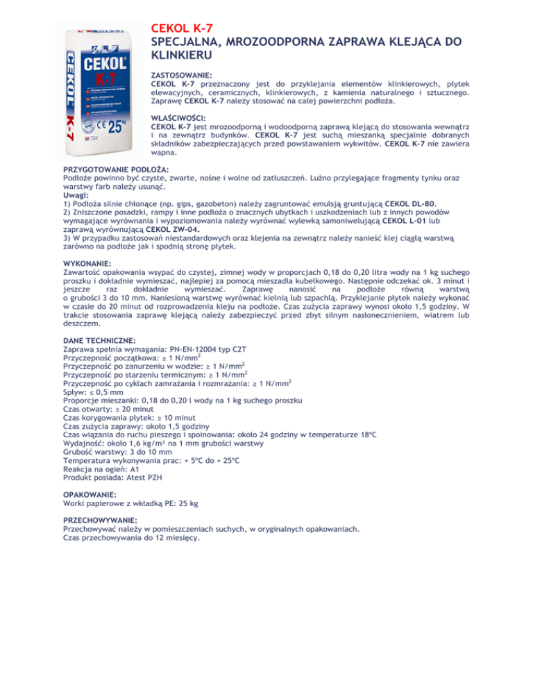 CEKOL K-7 SPECJALNA, MROZOODPORNA ZAPRAWA KLEJĄCA DO KLINKIERU ZASTOSOWANIE: CEKOL K-7 przeznaczony jest do przyklejania elementów klinkierowych, płytek elewacyjnych, ceramicznych, klinkierowych, z kamienia naturalnego i sztucznego. Zaprawę CEKOL K-7 naleŜy stosować na całej powierzchni podłoŜa. WŁAŚCIWOŚCl: CEKOL K-7 jest mrozoodporną i wodoodporną zaprawą klejącą do stosowania wewnątrz i na zewnątrz budynków. CEKOL K-7 jest suchą mieszanką specjalnie dobranych składników zabezpieczających przed powstawaniem wykwitów. CEKOL K-7 nie zawiera wapna. PRZYGOTOWANIE PODŁOśA: PodłoŜe powinno być czyste, zwarte, nośne i wolne od zatłuszczeń. Luźno przylegające fragmenty tynku oraz warstwy farb naleŜy usunąć. Uwagi: 1) PodłoŜa silnie chłonące (np. gips, gazobeton) naleŜy zagruntować emulsją gruntującą CEKOL DL-80. 2) Zniszczone posadzki, rampy i inne podłoŜa o znacznych ubytkach i uszkodzeniach lub z innych powodów wymagające wyrównania i wypoziomowania naleŜy wyrównać wylewką samoniwelującą CEKOL L-01 lub zaprawą wyrównującą CEKOL ZW-04. 3) W przypadku zastosowań niestandardowych oraz klejenia na zewnątrz naleŜy nanieść klej ciągłą warstwą zarówno na podłoŜe jak i spodnią stronę płytek. WYKONANIE: Zawartość opakowania wsypać do czystej, zimnej wody w proporcjach 0,18 do 0,20 litra wody na 1 kg suchego proszku i dokładnie wymieszać, najlepiej za pomocą mieszadła kubełkowego. Następnie odczekać ok. 3 minut i jeszcze raz dokładnie wymieszać. Zaprawę nanosić na podłoŜe równą warstwą o grubości 3 do 10 mm. Naniesioną warstwę wyrównać kielnią lub szpachlą. Przyklejanie płytek naleŜy wykonać w czasie do 20 minut od rozprowadzenia kleju na podłoŜe. Czas zuŜycia zaprawy wynosi około 1,5 godziny. W trakcie stosowania zaprawę klejącą naleŜy zabezpieczyć przed zbyt silnym nasłonecznieniem, wiatrem lub deszczem. DANE TECHNICZNE: Zaprawa spełnia wymagania: PN-EN-12004 typ C2T Przyczepność początkowa: ≥ 1 N/mm2 Przyczepność po zanurzeniu w wodzie: ≥ 1 N/mm2 Przyczepność po starzeniu termicznym: ≥ 1 N/mm2 Przyczepność po cyklach zamraŜania i rozmraŜania: ≥ 1 N/mm2 Spływ: ≤ 0,5 mm Proporcje mieszanki: 0,18 do 0,20 l wody na 1 kg suchego proszku Czas otwarty: ≥ 20 minut Czas korygowania płytek: ≥ 10 minut Czas zuŜycia zaprawy: około 1,5 godziny Czas wiązania do ruchu pieszego i spoinowania: około 24 godziny w temperaturze 18ºC Wydajność: około 1,6 kg/m² na 1 mm grubości warstwy Grubość warstwy: 3 do 10 mm Temperatura wykonywania prac: + 5ºC do + 25ºC Reakcja na ogień: A1 Produkt posiada: Atest PZH OPAKOWANIE: Worki papierowe z wkładką PE: 25 kg PRZECHOWYWANIE: Przechowywać naleŜy w pomieszczeniach suchych, w oryginalnych opakowaniach. Czas przechowywania do 12 miesięcy.