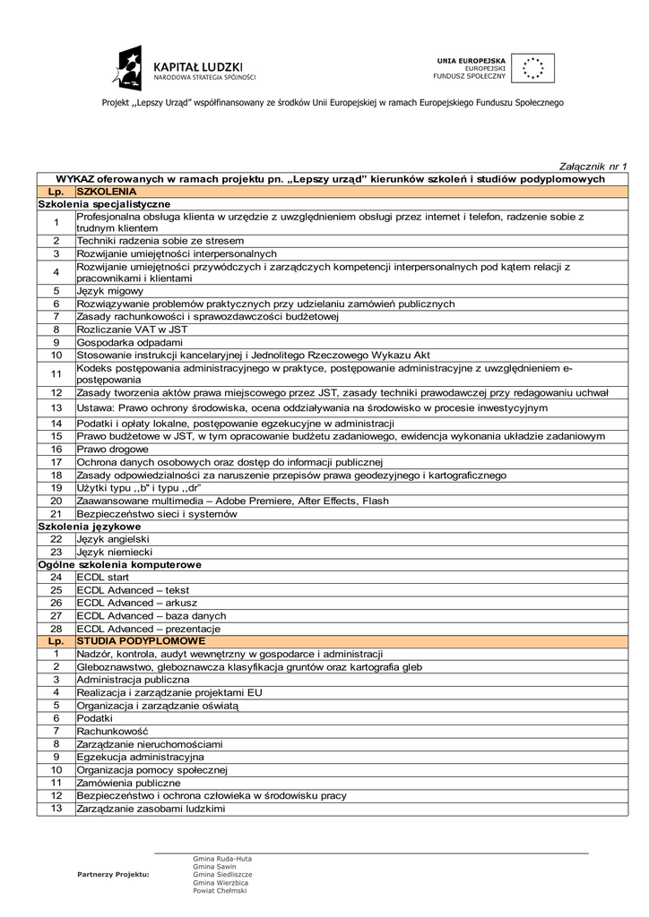 Projekt ,,Lepszy Urząd” współfinansowany ze środków Unii Europejskiej w ramach Europejskiego Funduszu Społecznego Załącznik nr 1 WYKAZ oferowanych w ramach projektu pn. „Lepszy urząd” kierunków szkoleń i studiów podyplomowych Lp. SZKOLENIA Szkolenia specjalistyczne Profesjonalna obsługa klienta w urzędzie z uwzględnieniem obsługi przez internet i telefon, radzenie sobie z 1 trudnym klientem 2 Techniki radzenia sobie ze stresem 3 Rozwijanie umiejętności interpersonalnych Rozwijanie umiejętności przywódczych i zarządczych kompetencji interpersonalnych pod kątem relacji z 4 pracownikami i klientami 5 Język migowy 6 Rozwiązywanie problemów praktycznych przy udzielaniu zamówień publicznych 7 Zasady rachunkowości i sprawozdawczości budżetowej 8 Rozliczanie VAT w JST 9 Gospodarka odpadami 10 Stosowanie instrukcji kancelaryjnej i Jednolitego Rzeczowego Wykazu Akt Kodeks postępowania administracyjnego w praktyce, postępowanie administracyjne z uwzględnieniem e11 postępowania 12 Zasady tworzenia aktów prawa miejscowego przez JST, zasady techniki prawodawczej przy redagowaniu uchwał 13 Ustawa: Prawo ochrony środowiska, ocena oddziaływania na środowisko w procesie inwestycyjnym 14 Podatki i opłaty lokalne, postępowanie egzekucyjne w administracji 15 Prawo budżetowe w JST, w tym opracowanie budżetu zadaniowego, ewidencja wykonania układzie zadaniowym 16 Prawo drogowe 17 Ochrona danych osobowych oraz dostęp do informacji publicznej 18 Zasady odpowiedzialności za naruszenie przepisów prawa geodezyjnego i kartograficznego 19 Użytki typu ,,b'' i typu ,,dr” 20 Zaawansowane multimedia – Adobe Premiere, After Effects, Flash 21 Bezpieczeństwo sieci i systemów Szkolenia językowe 22 Język angielski 23 Język niemiecki Ogólne szkolenia komputerowe 24 ECDL start 25 ECDL Advanced – tekst 26 ECDL Advanced – arkusz 27 ECDL Advanced – baza danych 28 ECDL Advanced – prezentacje Lp. STUDIA PODYPLOMOWE 1 Nadzór, kontrola, audyt wewnętrzny w gospodarce i administracji 2 Gleboznawstwo, gleboznawcza klasyfikacja gruntów oraz kartografia gleb 3 Administracja publiczna 4 Realizacja i zarządzanie projektami EU 5 Organizacja i zarządzanie oświatą 6 Podatki 7 Rachunkowość 8 Zarządzanie nieruchomościami 9 Egzekucja administracyjna 10 Organizacja pomocy społecznej 11 Zamówienia publiczne 12 Bezpieczeństwo i ochrona człowieka w środowisku pracy 13 Zarządzanie zasobami ludzkimi Partnerzy Projektu: Gmina Gmina Gmina Gmina Powiat Ruda-Huta Sawin Siedliszcze Wierzbica Chełmski