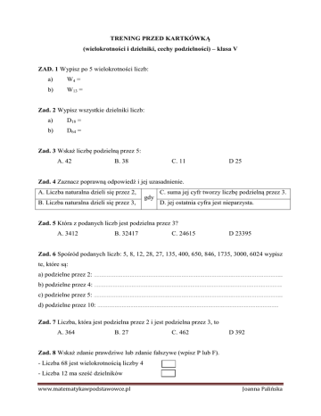 TRENING PRZED KARTKÓWKĄ (wielokrotności i dzielniki, cechy podzielności) – klasa V ZAD. 1 Wypisz po 5 wielokrotności liczb: a) W4 = b) W13 = Zad. 2 Wypisz wszystkie dzielniki liczb: a) D18 = b) D64 = Zad. 3 Wskaż liczbę podzielną przez 5: A. 42 B. 38 C. 11 D 25 Zad. 4 Zaznacz poprawną odpowiedź i jej uzasadnienie. A. Liczba naturalna dzieli się przez 2, B. Liczba naturalna dzieli się przez 3, gdy C. suma jej cyfr tworzy liczbę podzielną przez 3. D. jej ostatnia cyfra jest nieparzysta. Zad. 5 Która z podanych liczb jest podzielna przez 3? A. 3412 B. 32417 C. 24615 D 23395 Zad. 6 Spośród podanych liczb: 5, 8, 12, 28, 27, 135, 400, 650, 846, 1735, 3000, 6024 wypisz te, które są: a) podzielne przez 2: …………………………………………………………………………………………………………………... b) podzielne przez 4: ………………………………………………………………………………………………………………….. c) podzielne przez 5: …………………………………………………………………………………………………………………... d) podzielne przez 10: ……………………………………………………………………………………………………………… Zad. 7 Liczba, która jest podzielna przez 2 i jest podzielna przez 3, to A. 364 B. 27 C. 462 D 392 Zad. 8 Wskaż zdanie prawdziwe lub zdanie fałszywe (wpisz P lub F). - Liczba 68 jest wielokrotnością liczby 4 - Liczba 12 ma sześć dzielników www.matematykawpodstawowce.pl Joanna Palińska