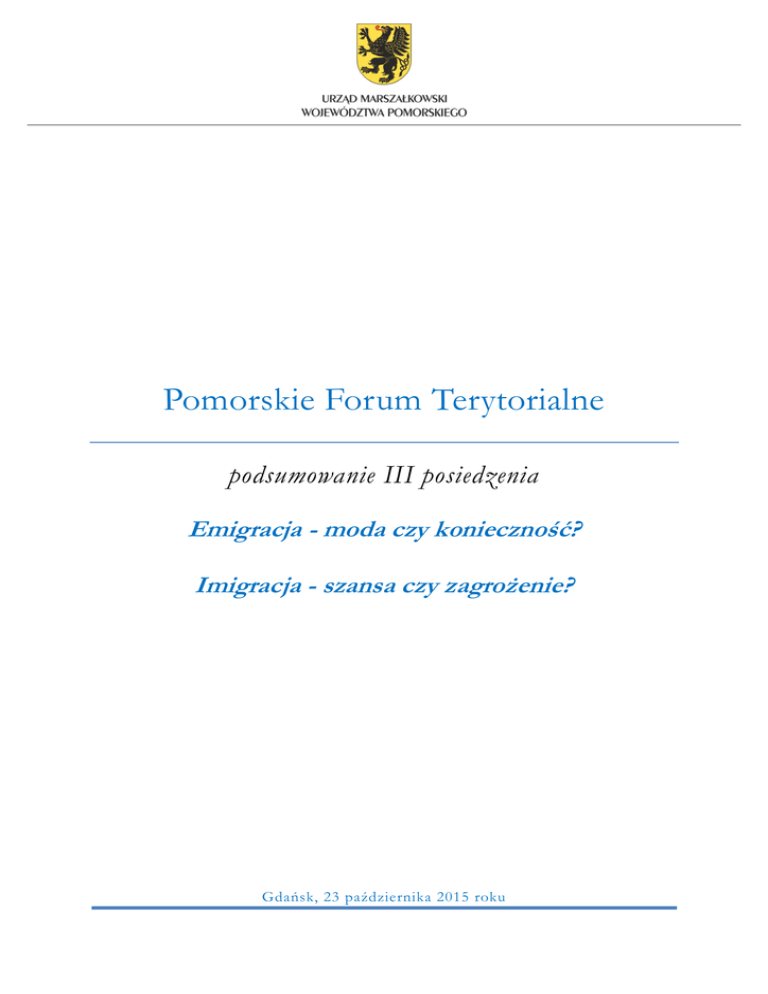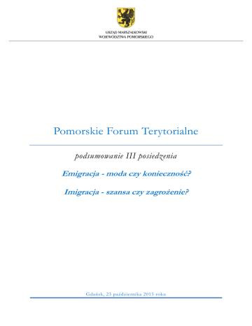 Pomorskie Forum Terytorialne podsumowanie III posiedzenia Emigracja - moda czy konieczność? Imigracja - szansa czy zagrożenie? Gdańsk, 23 października 2015 roku Pomorskie Forum Terytorialne Trzecie spotkanie Pomorskiego Forum Terytorialnego odbyło się 23 października 2015 r. w Europejskim Centrum Solidarności. Uczestniczyli w nim członkowie PFT oraz zaproszeni eksperci i goście. Głównym tematem spotkania było zjawisko migracji oraz jego konsekwencje dla regionu i kraju. Propozycja podjęcia tego tematu pojawiła się na poprzednim posiedzeniu Forum, gdy dyskutowano o sposobach oraz korzyściach z zatrzymania i przyciągania nowych talentów do regionu. Inicjatorem i moderatorem dyskusji był Marszałek Województwa Pomorskiego Mieczysław Struk. W pierwszym wystąpieniu przedstawicielki PBS Spółka z o.o. - Anna Kalinowska i Magdalena przedstawiły Makurat wyniki badania zrealizowanego na Samorządu Województwa Pomorskiego Dotyczyło w ono zlecenie 2015 r. szeroko pojętego umiędzynarodowienia województwa, w tym w sferze gospodarki i rynku pracy, edukacji oraz kultury i turystyki. Podczas spotkania szczegółowo zaprezentowano wyniki badania i rekomendacje w zakresie problemów migracji, któremu to zjawisku poświęcono dużo miejsca w badaniu. Wstęp do dyskusji stanowiło wystąpienie prof. UW Macieja Duszczyka – eksperta ds. migracji, który odniósł się do aktualnej sytuacji w sferze migracji zarobkowych i uchodźctwa oraz nakreślił wyzwania płynące z tych zjawisk dla Polski i regionów. W dyskusji poruszono m.in. następujące wątki Już kilka lat temu, biorąc pod uwagę sytuację demograficzną państw północnoafrykańskich, przewidywano, że migracje będą wyzwaniem dla Europy w perspektywie 2017 r., a dla Polski w perspektywie 2020 r. Jednak sytuacja polityczna spowodowała przyspieszenie zmian. Migracje nie są zjawiskiem nowym i są nieuchronne. Nowy jest natomiast kryzys zarządzania migracjami, wypracowywania i podejmowania decyzji na poziomie UE. 1 Pomorskie Forum Terytorialne Migracje Polaków Polacy okazali się bardziej mobilni niż przewidywano (media mają w tym swój udział). Nic nie wskazuje na zatrzymanie zjawiska emigracji, a migracje wewnętrzne w połączeniu z zagranicznymi prowadzą już dziś do wyludnienia niektórych obszarów kraju. Zmieniają się ścieżki migracyjne Polaków. Pierwsza w rankingu wyjazdów jest Wielka Brytania, ale wkrótce Niemcy mogą ją wyprzedzić, choć kraj ten już dziś przesycony jest liczbą uchodźców, co oznacza, że nie będzie w stanie przyjąć większej grupy imigrantów z Polski. Paradoksalnie może to być szansą na zatrzymanie ich w kraju. Warto zatem podjąć działania mające na celu zatrzymanie osób myślących o zamieszkaniu poza granicami naszego kraju np. poprzez program stabilizacji młodzieży opuszczającej szkołę. Problemem wynikającym z emigracji jest eurosieroctwo, a za około 15 lat będzie nim również eurorodzicielstwo – osamotnieni rodzice osób, które nie wrócą z zagranicy. Przewidywane są różne scenariusze rozwoju tego zjawiska. Jeden z nich zakłada, że państwo będzie musiało zbudować szeroki i kompleksowy system wsparcia dla nich, wykorzystując potencjał imigrantów. Imigranci zarobkowi Zwiększa się liczba imigrantów zarobkowych przyjeżdżających do Polski. Statystyki pokazują, że zaledwie 8-12% z nich podejmuje legalną pracę. Jednak obecność imigrantów pozwala niektórym sektorom utrzymać się ze względu na tanią siłę roboczą. Zdecydowana większość imigrantów pochodzi z Ukrainy. Można powiedzieć, że Polska jest jedynym krajem mającym bilateralne stosunki migracyjne z Ukrainą. Obywatele tego kraju, ze względu na sytuację ekonomiczną, zmuszeni są, pracując w Polsce, transferować część dochodów do swoich rodzin. Ukraińcy pracują głównie w rolnictwie, ogrodnictwie i opiece domowej, skupiając się w 5-6 dużych miastach i w województwie lubelskim. Wsparcie Ukrainy poprzez umożliwienie pracy jej obywatelom stanowi dla Polski swego rodzaju obowiązek tym bardziej, że nasz kraj nadal będzie dla nich bardzo atrakcyjny. Jednocześnie posiadanie sąsiada, którego obywatele bez większych problemów mogą integrować się ze społeczeństwem naszego kraju, może być szansą dla polskiej gospodarki. W ostatnim czasie wprowadzono rozwiązania uszczelniające system zatrudniania obcokrajowców, w tym przepis stanowiący, że osoba fizyczna może zatrudnić nie więcej niż 8 pracowników i musi to uzasadnić. Problemem jest jednak fakt, że oświadczenie o zamiarze zatrudnienia obcokrajowca nie jest dokumentem wiążącym się z konsekwencjami prawnymi. Jeśli pracodawca nie zatrudni deklarowanego obcokrajowca pomimo złożonego oświadczenia, to nie ponosi z tego tytułu żadnej odpowiedzialności. 2 Pomorskie Forum Terytorialne Zachętą dla imigrantów mógłby być system przewidujący możliwość legalnego osiedlenia się w Polsce na 5 lat po 12 miesiącach legalnego zatrudnienia (w ostatnich 3 latach) z dalszą perspektywą pobytu stałego. Miałby on na celu „nagradzanie za uczciwość”, a następnie trwałe włączenie imigrantów w rynek pracy. Kwestia migracyjna nie jest uregulowana systemowo. W przeważającym stopniu integracją imigrantów zajmują się organizacje pozarządowe, które budzą większe zaufanie niż instytucje i urzędy. Brakuje szeregu rozwiązań, np. w odniesieniu do nauczania języka polskiego zarówno imigrantów, jak i emigrantów powracających do kraju. W ostatnich miesiącach obserwuje się wzrost postaw ksenofobicznych w Polsce, co wymaga przeciwdziałania, zwłaszcza, że imigranci mają zdolność do szybkiej asymilacji i jako pracownicy są mile widziani przez przedsiębiorców. Uchodźcy Uchodźcy są poważnym problemem dla Europy, ale w przypadku Polski problem ten nie stanowi zagrożenia. W wyniku realokacji (z Włoch i Grecji) nasz kraj przyjmie ponad 6 tys. os