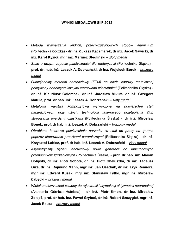 WYNIKI MEDALOWE SIIF 2012 Metoda wytwarzania lekkich, przeciwzużyciowych stopów aluminium (Politechnika Łódzka) - dr inż. Łukasz Kaczmarek, dr inż. Jacek Sawicki, dr inż. Karol Kyzioł, mgr inż. Mariusz Stegliński – złoty medal Stale o dużym zapasie plastyczności dla motoryzacji (Politechnika Śląska) prof. dr, hab. inż. Leszek A. Dobrzański, dr inż. Wojciech Borek – brązowy medal Funkcjonalny materiał narzędziowy (FTM) na bazie osnowy metalicznej pokrywany nanokrystalicznymi warstwami wierzchnimi (Politechnika Śląska) dr inż. Klaudiusz Gołombek, dr inż. Jarosław Mikuła, dr inż. Grzegorz Matula, prof. dr hab. inż. Leszek A. Dobrzański – złoty medal Metalowa warstwa narzędziowych przy kompozytowa użyciu wytworzona technologii na powierzchni stali laserowego przetapiania i/lub stopowania twardymi cząstkami (Politechnika Śląska) - dr inż. Mirosław Bonek, prof. dr hab. inż. Leszek A. Dobrzański – brązowy medal Obrabiana laserowo powierzchnia narzedzi ze stali do pracy na gorąco poprzez stopowanie proszkami ceramicznymi (Politechnika Śląska) - dr inż. Krzysztof Labisz, prof. dr hab. inż. Leszek A. Dobrzański – złoty medal Asymetryczny bęben łańcuchowy nowe generacji do łańcuchowych przenośników zgrzebłowych (Politechnika Śląska) - prof. dr hab. inż. Marian Dolipski, dr inż. Piotr Sobota, dr inż. Piotr Cheluszka, dr inż. Tadeusz Giza, dr inż. Rajmund Mann, mgr inż. Jan Osadnik, dr inż. Eryk Remiorz, mgr inż. Edward Kusak, mgr inż. Stanisław Tytko, mgr inż. Mirosław Łabęcki – brązowy medal Wielokanałowy układ scalony do rejestracji i stymulacji aktywności neuronalnej (Akademia Górniczo-Hutnicza) - dr inż. Piotr Kmon, dr inż. Mirosław Żołądź, prof. dr hab. inż. Paweł Gryboś, dr inż. Robert Szczygieł, mgr inż. Jacek Rauza – brązowy medal System bezprzewodowego wielokanałowego monitorowania wewnętrznej aktywności mózgu (Akademia Górniczo-Hutnicza) - dr inż. Piotr Kmon, dr inż. Mirosław Żołądź, prof. dr hab. inż. Paweł Gryboś, dr inż. Robert Szczygieł, mgr inż. Jacek Rauza – srebrny medal SENSE – Mobilny system wykrywania i alarmowania o atakach epilepsji wykorzystujący elektromiografię powierzchniową (Wojskowa Akademia Techniczna) - dr inż. Mariusz Chmielewski, mgr inż. Bartłomiej Wójtowicz, mgr inż. Witold Matuszewski, Mateusz Chrustny, Monika Lipińska, mgr inż. Piotr Stąpór – złoty medal Pojazd specjalny Shiba z georadarem do wykrywania i neutralizacji zagrożeń IED (Wojskowa Akademia Techniczna) - prof. dr hab. inż. Tadeusz Niezgoda, dr hab. Wiesław Barnat, dr inż. Marcin Szczepaniak, mgr inż. Tomasz Wróbel – srebrny medal Sposób sprzężonego wydobycia węglowodorów gazowych i magazynowania CO2 w odwiertach poziomych (Wojskowa Akademia Techniczna) - Danuta Miedzińska, Tadeusz Niezgoda, Grzegorz Sławiński, Roman Gieleta – brązowy medal Połączenie przegubowe segmentów betonowych barier ochronnych (Wojskowa Akademia Techniczna) - prof. dr hab. inż. Wacław Borkowski, dr inż. Zdzisław Hryciów, dr. inż. Piotr Rybak, dr inż. Józef Wysocki – srebrny medal Rurociąg polowy Ø 150 z samo załącznikiem kielichowym nowego typu (Wojskowa Akademia Techniczna) - prof. dr hab. inż. Tadeusz Kałdoński, dr hab. inż. Kazimierz Baczewski, mgr inż. Roman Szpak, mgr inż. Wiesław Dziurzyński – złoty medal Proszki magnetyczne łączone spoiwem kompozytowym (Instytut Chemii Przemysłowej) – dr hab. Maria Zielecka, inż. Elżbieta Bujnowska, dr Dariusz Jamanek, techn. Jakub Ruciński – srebrny medal Otrzymywanie węglowodorowej frakcji paliwowej z tłuszczu utylizacyjnego (Instytut Chemii Przemysłowej) - dr inż. Osazuwa Osawaru, prof. dr hab. inż. Jacek Kijeński, dr inż. Ewa Śmigiera, mgr Anna Zgudka – brązowy medal Ciecz kwasująca na bazie emulsji kwasowo-ropnej (Instytut Nafty i Gazu) Piotr Kasza, Marek Czupski, Elżbieta Biały – srebrny medal Mikroemulsja woskowa na bazie wosków pochodzących z odzysku oraz sposób jej wytwarzania (Instytut Nafty i Gazu) - Halina Syrek, Artur Antosz, Jacek Kapelak, Urszula Gawlak-Józefczyk, Anna Bartyzel, Stefan Ptak, Wojciech Wilk – złoty medal Paliwo stałe zawierające komponenty biogenne uszlachetnione wielofunkcyjnym pakietem dodatków (Instytut Nafty i Gazu) - Leszek Ziemiański, Anna Duda, Grażyna Żak, Winicjusz Stanik, Iwona Skręt, Michał Wojtasik, Jan Lubowicz, Wojciech Mazela, Michał Pajda, Celina Bujas – brązowy medal Sposób modyfikowania warstwy wierzchniej powierzchni roboczych części maszyn (Instytut Obróbki plastycznej) - dr inż. Stanisław Ziułkiewicz, mgr inż. Bohdan Kiryluk – złoty medal Antybakteryjne włókniny filtracyjne modyfikowane inkapsulowanym biocydem (Instytut Włókiennictwa) - dr inż. Bogna Goetzendorf-Grabowska, dr. inż. Zenon Polus, dr inż. Bogumił Gajdzicki, dr inż. Agnieszka Karaszewska – srebrny medal PIAP SCOUT – mały robot do rozpoznania (Przemysłowy Instytut Automatyki i Pomiarów PIAP) - mgr inż. Łukasz Dudek, mgr inż. Tomasz Krakówka, mgr inż. Sławomir Kapelko, mgr inż. Paweł Korba, mgr inż. Stanisław Nycz, mgr inż. Maciej Wojtowicz – srebrny medal Urządzenie do wytwarzania wysoko zagęszczonych brykietów z roślin źdźbłowych i/lub łodygowych (Przemysłowy Instytut Maszyn Rolniczych) - mgr inż. Paweł Frackowiak, dr inż. Florian Adamczyk, mgr inż. Stanisław Jankowiak, prof. dr inż. Tadeusz Pawłowski, prof. dr hab. inż. Jan Szczepaniak, inż. Jan Krupnik – brązowy medal Maszyny nowej generacji do pozyskiwania biomasy z wierzby krzewiastej (Przemysłowy Instytut Maszyn Rolniczych) - dr inż. Florian Adamczyk, mgr inż. Paweł Frąckowiak, mgr inż. Stanisław Jankowiak, mgr inż. Wojciech Spychała, mgr inż. Grzegorz Wąchalski, prof. dr hab. inż. Zbyszek Zbytek – brązowy medal
