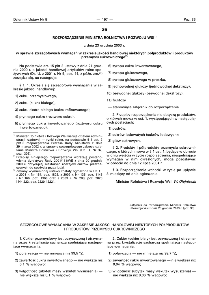 Dziennik Ustaw Nr 5 — 197 — Poz. 36 36 ROZPORZÑDZENIE MINISTRA ROLNICTWA I ROZWOJU WSI1) z dnia 23 grudnia 2003 r. w sprawie szczegó∏owych wymagaƒ w zakresie jakoÊci handlowej niektórych pó∏produktów i produktów przemys∏u cukrowniczego2) Na podstawie art. 15 pkt 2 ustawy z dnia 21 grudnia 2000 r. o jakoÊci handlowej artyku∏ów rolno-spo˝ywczych (Dz. U. z 2001 r. Nr 5, poz. 44, z póên. zm.3)) zarzàdza si´, co nast´puje: 6) syropu cukru inwertowanego, § 1. 1. OkreÊla si´ szczegó∏owe wymagania w zakresie jakoÊci handlowej: 9) jednowodnej glukozy (jednowodnej dekstrozy), 1) cukru przemys∏owego, 2) cukru (cukru bia∏ego), 3) cukru ekstra bia∏ego (cukru rafinowanego), 4) p∏ynnego cukru (roztworu cukru), 5) p∏ynnego cukru inwertowanego (roztworu cukru inwertowanego), ——————— 1) Minister Rolnictwa i Rozwoju Wsi kieruje dzia∏em administracji rzàdowej — rynki rolne, na podstawie § 1 ust. 2 pkt 3 rozporzàdzenia Prezesa Rady Ministrów z dnia 29 marca 2002 r. w sprawie szczegó∏owego zakresu dzia∏ania Ministra Rolnictwa i Rozwoju Wsi (Dz. U. Nr 32, poz. 305). 2) Przepisy niniejszego rozporzàdzenia wdra˝ajà postanowienia dyrektywy Rady 2001/111/WE z dnia 20 grudnia 2001 r. dotyczàcej niektórych rodzajów cukrów przeznaczonych do spo˝ycia przez ludzi. 3) Zmiany wymienionej ustawy zosta∏y og∏oszone w Dz. U. z 2001 r. Nr 154, poz. 1802, z 2002 r. Nr 135, poz. 1145 i Nr 166, poz. 1360 oraz z 2003 r. Nr 208, poz. 2020 i Nr 223, poz. 2220 i 2221. 7) syropu glukozowego, 8) syropu glukozowego w proszku, 10) bezwodnej glukozy (bezwodnej dekstrozy), 11) fruktozy — stanowiàce za∏àcznik do rozporzàdzenia. 2. Przepisy rozporzàdzenia nie dotyczà produktów, o których mowa w ust. 1, wyst´pujàcych w nast´pujàcych postaciach: 1) pudrów; 2) cukrów lodowatych (cukrów lodowych); 3) g∏ów cukrowych. § 2. Produkty i pó∏produkty przemys∏u cukrowniczego, o których mowa w § 1 ust. 1, b´dàce w obrocie w dniu wejÊcia w ˝ycie rozporzàdzenia, niespe∏niajàce wymagaƒ w nim okreÊlonych, mogà pozostawaç w obrocie do dnia 12 lipca 2004 r. § 3. Rozporzàdzenie wchodzi w ˝ycie po up∏ywie 3 miesi´cy od dnia og∏oszenia. Minister Rolnictwa i Rozwoju Wsi: W. Olejniczak Za∏àcznik do rozporzàdzenia Ministra Rolnictwa i Rozwoju Wsi z dnia 23 grudnia 2003 r. (poz. 36) SZCZEGÓ¸OWE WYMAGANIA W ZAKRESIE JAKOÂCI HANDLOWEJ NIEKTÓRYCH PÓ¸PRODUKTÓW I PRODUKTÓW PRZEMYS¸U CUKROWNICZEGO 1. Cukier przemys∏owy jest oczyszczonà i otrzymanà przez krystalizacj´ sacharozà spe∏niajàcà nast´pujàce wymagania: 2. Cukier (cukier bia∏y) jest oczyszczonà i otrzymanà przez krystalizacj´ sacharozà spe∏niajàcà nast´pujàce wymagania: 1) polaryzacja — nie mniejsza ni˝ 99,5 °Z; 1) polaryzacja — nie mniejsza ni˝ 99,7 °Z; 2) zawartoÊç cukru inwertowanego — nie wi´ksza ni˝ 0,1 % wagowo; 2) zawartoÊç cukru inwertowanego — nie wi´ksza ni˝ 0,04 % wagowo; 3) wilgotnoÊç (ubytek masy wskutek wysuszenia) — nie wi´ksza ni˝ 0,1 % wagowo. 3) wilgotnoÊç (ubytek masy wskutek wysuszenia) — nie wi´ksza ni˝ 0,06 % wagowo; Dziennik Ustaw Nr 5 — 198 — Poz. 36 4) liczba punktów za typ zabarwienia1) — nie wi´ksza ni˝ 9. 1) zawartoÊç suchej masy — nie mniejsza ni˝ 62 % wagowo; 3. Cukier ekstra bia∏y (cukier rafinowany) jest oczyszczonà i otrzymanà przez krystalizacj´ sacharozà spe∏niajàcà nast´pujàce wymagania: 2) zawartoÊç cukru inwertowanego (stosunek fruktozy do glukozy: 1,0 ± 0,1) — wi´ksza ni˝ 50 % wagowo w przeliczeniu na suchà mas´; 1) polaryzacja — nie mniejsza ni˝ 99,7 °Z; 2) zawartoÊç cukru inwertowanego — nie wi´ksza ni˝ 0,04 % wagowo; 3) wilgotnoÊç (ubytek masy wskutek wysuszenia) — nie wi´ksza ni˝ 0,06 % wagowo; 4) ∏àczna liczba punktów — nie wi´ksza ni˝ 8, w tym: 3) zawartoÊç popio∏u konduktometrycznego2) — nie wi´ksza ni˝ 0,4 % wagowo w przeliczeniu na suchà mas´. 7. Syrop glukozowy jest oczyszczonym i zag´szczonym roztworem wodnym od˝ywczych w´glowodanów uzyskanych ze skrobi lub inuliny, spe∏niajàcym nast´pujàce wymagania: a) liczba punktów za typ zabarwienia1) — nie wi´ksza ni˝ 4, 1) zawartoÊç suchej masy — nie mniejsza ni˝ 70 % wagowo; b) liczba punktów za zawartoÊç popio∏u2) — nie wi´ksza ni˝ 6, 2) równowa˝nik glukozy wyra˝ony jako D-glukoza — nie mniejszy ni˝ 20 % wagowo w przeliczeniu na suchà mas´; c) liczba punktów za zabarwienie roztworu cukru3) — nie wi´ksza ni˝ 3. 4. P∏ynny cukier (roztwór cukru)4) jest roztworem wodnym sacharozy spe∏niajàcym nast´pujàce wymagania: 1) zawartoÊç suchej masy — nie mniejsza ni˝ 62 % wagowo; 2) zawartoÊç cukru inwertowanego (stosunek fruktozy do glukozy: 1,0 ± 0,2) — nie wi´ksza ni˝ 3 % wagowo w przeliczeniu na suchà mas´; 3) zawartoÊç popio∏u konduktometrycznego2) — nie wi´ksza ni˝ 0,1 % wagowo w przeliczeniu na suchà mas´; 4) zabarwienie roztworu3) — nie wi´ksze ni˝ 45 jednostek. 5. P∏ynny cukier inwertowany (roztwór cukru inwertowanego)4) jest roztworem wodnym sacharozy cz´Êciowo zinwertowanej, w którym zawartoÊç cukru inwertowanego nie jest dominujàca, spe∏niajàcym nast´pujàce wymagania: 1) zawartoÊç suchej masy — nie mniejsza ni˝ 62 % wagowo; 2) zawartoÊç cukru inwertowanego (stosunek fruktozy do glukozy: 1,0 ± 0,1) — wi´ksza ni˝ 3 %, jednak nie wi´ksza ni˝ 50 % wagowo w przeliczeniu na suchà mas´; 3) zawartoÊç popio∏u konduktometrycznego2) — nie wi´ksza ni˝ 0,4 % wagowo w przeliczeniu na suchà mas´. 6. Syrop cukru inwertowanego4) jest roztworem wodnym sacharozy cz´Êciowo zinwertowanej, który mo˝e byç skrystalizowany i w którym zawartoÊç cukru inwertowanego jest dominujàca, spe∏niajàcym nast´pujàce wymagania: 3) zawartoÊç popio∏u siarczanowego — nie wi´ksza ni˝ 1 % wagowo w przeliczeniu na suchà mas´. 8. Syrop glukozowy w proszku jest cz
