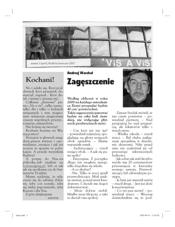 kwiecień 2007 | vis a vis 1 numer 1 (jest!), Kraków, kwiecień 2007 Andrzej Warchał Kochani! No i udało się. Ktoś podchwycił, ktoś przyniósł, dostarczył, napisał... Ktoś złożył..i mamy i cieszmy się!.. Całkiem „Zwisowe” pismo „Vis a vis”...tylko nasze.. tylko dla i tylko o ludziach związanych z tym magicznym miejscem..magicznym czasem wspólnych przeżyć.. rozmów..uśmiechów.. Nie bójmy się tworzyć! Kochani liczymy na Waszą pomoc! Notujcie w głowach anegdoty..piszcie wiersze i opowiadania...rysujcie i jak już nosicie te aparaty to pstrykajcie. A przede wszystkim Bądźcie! A potem do Nas..na półeczkę..lub mailem na [email protected]. [email protected] @ p p . lub ot tak jak się spotkamy czy do barmanów. Dojdzie. Mamy nadzieję, że włączycie się do zabawy. Zabawy, żeby coś zostało, żeby się milej wspominało, żeby Razem i dla Nas. Z góry dziękujemy autorzy adam.indd 1 Zagęszczenie Według obliczeń w roku 2000 na każdego mieszkańca Ziemi przypadać będzie 40 cm2 powierzchni. Takie zagęszczenie panować będzie na całej kuli ziemskiej, nie wyłączając płytszych przybrzeżnych mórz. - Czy ktoś już nie śpi? – powiedział najwyższy, spoglądając na głowy stojących obok sąsiadów. – Mamy wspaniały ranek. - Zachwycający – rzucił stojący obok. – A jak się panu spało? - Zwyczajnie. Z początku długo nie mogłem zasnąć, tylko kręciłem się wkoło. - A co słychać? - Nic. Tylko w nocy spadł przewodniczący. Miał piękny metraż, ponad metr kwadratowy. I chcieli mu kogoś dokwaterować. - Może dobrze zrobił. Miałby teraz kłopoty, a taki to zleciał i ma spokój. - Zawsze biedak mówił, że ma czyste powietrze – powiedział pierwszy. – Nad przepaścią bo nad przepaścią, ale lokatorów tylko z trzech stron. - Wielka szkoda – rzucił trzeci. – Był chyba najlepszym specjalistą w dziedzinie ekonomii. Nikt przed nim nie uzależniał jej od przesunięć tektonicznych ludności. - Jak sobie tak stał i liczył to wyszło mu 20 centymetrów przesunięcia w kierunku nowego ustroju. Przewodniczący był człowiekiem postępu. - Ja bym już zmienił ustrój – rzucił drugi. – Jest już dość konserwatywny. - Co też pan mówi! – powiedział trzeci. – Wczoraj dowiedziałem się że pod- 2007-04-14 11:02:45 2 vis a vis | kwiecień 2007 wyższą mi emeryturę. Jak pan będzie stał spokojnie, to panu też podwyższą. - Ale w ten sposób nie stoi się z postępem! - Niech mnie pan lepiej nie uczy, jak mam stać. Jestem człowiekiem pracy. Moim nazwiskiem nazwano nawet grupę ludzi stojącą pod lasem. - Ma pan szczęście, że pan wyrósł. Ale mogą być jeszcze przesunięcia tektoniczne. - Będą na pewno z góry ustalone. A ja już dzisiaj nad ranem wymieniłem serdeczne spojrzenie z naszym przewodniczącym. - Może by się panowie przestali kłócić – powiedział stojący z prawej. – I tak to nie ma znaczenia, bo się na wojnę zanosi. Pchają się na nas jak cholera. - Będzie rozbrojenie – rzucił ktoś z boku. – Tylko że nie ma gdzie broni wyrzucić. - Jeśli o mnie chodzi, to wojna może być – powiedział pierwszy. – I tak nie ma co do gęby włożyć. Much coraz mniej. Trudno złapać. - Są gdzieś podobno pastylki o smaku muchy. - Jednak co mięso to mięso. Przedtem to tylko człowiek gębę otworzył i zawsze jakaś wleciała, a teraz to możesz trzymać gębę pół dnia otwartą i nic. - Jeden to miał dobrze – powiedział trzeci. – Miał własną pszczołę, która mu znosiła miód do ucha. - Mieli przecież skierować kilkaset sztuk owadów. Mówiło się nawet o kilku gatunkach z ciepłych krajów. - Co oni nie mieli robić! Jeszcze z początkiem lata była mowa o latających marchewkach, a tu tymczasem przeleciały dwa buraki i to na znacznej wysokości. - Na zachodzie, panie, to widziano już latające pomarańcze. A u nas to tylko rozpyla się wódkę w atmosferze. - Żeby się jeszcze nie mylili! – rzucił drugi. – Wczoraj to lał się na mnie cały czas rumianek, który, jak się okazało, miał spaść na teren żłobka. - Bądźcie, panowie, cicho! – powiedział pierwszy. – Zaraz nam podadzą dziennik. adam.indd 2 „Nasza delegacja rządowa bawi dziś myślami na Węgrzech” - Ci to zwiedzą! – rzucił drugi. „Wczoraj w północnych rejonach naszego kraju odbyły się manewry wojskowe. Celem ich było dalsze doskonalenie zwrotu w lewo z pozycji zasadniczej. Grupa spółdzielców stojąca na rubieżach postanowiła przekazać swojego przewodniczącego na konto odbudowy Zamku Królewskiego. W związku z ogólnie trudną sytuacją rząd nasz postanowił wprowadzić zdalnie sterowane marchewki typu: ziemia – robotnik – ziemia. Miesiąc temu rozpoczął marsz pokoju niejaki Peters. Ma być jutro podany przez naszą granicę. Obywatele proszeni są o trzymanie przez co najmniej trzy godziny rąk do góry i podawanie Petersa z zachodu na wschód. W związku z kompletnym wyczerpaniem się dzieł literatury narodowej nasz najlepszy reżyser przystąpił do ekranizacji „DE REVOLUTIONIBUS ORBIUM CELESTIUM” Jutro ma być zachmurzenie duże ze wzrastającymi opadami deszczu i mżawki. Stojących w morzu ostrzega się przed dość wysoką falą. Słońce zaszło dzisiaj o minutę później. Sprawę skierowano do kolegium. Komunikat nadzwyczajny! Obywatele stojący na zachodzie proszeni są o ściśnięcie się na wschód celem korekty granic.” - Żadnych zmian – powiedział po chwili szósty. – Ścieśniać się każą, a rząd leży rozwalony chyba na obszarze kilku kilometrów. - I tak dobrze, że społecznicy stoją na jednej nodze. - Ale cos zrobić trzeba – rzucił drugi. - Nie wiem – powiedział pierwszy. – Ciasno, że nawet pięści do góry nie podniesiesz. - A może by się tak winną stronę zapatrzyć? - Racja – powiedział drugi. – Odwrócimy się od nich tyłem, zapatrzymy, gdzie trzeba, i niech sobie teraz stoją s