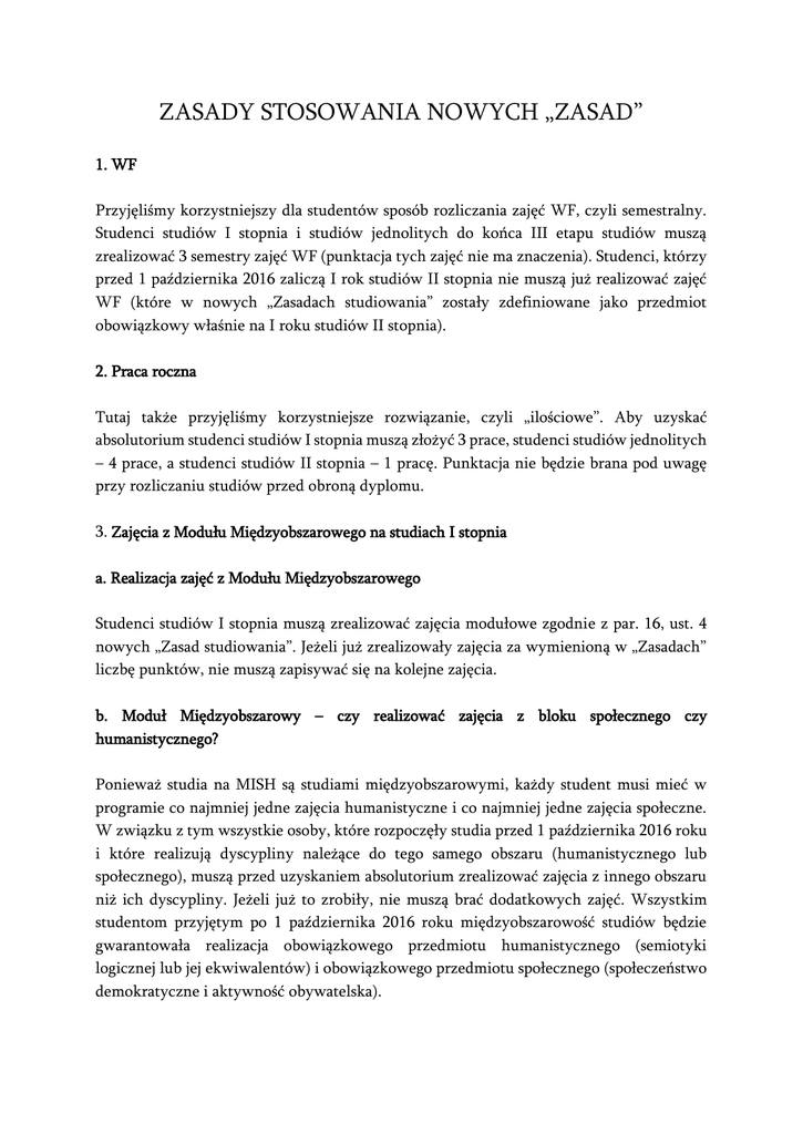 ZASADY STOSOWANIA NOWYCH „ZASAD” 1. WF Przyjęliśmy korzystniejszy dla studentów sposób rozliczania zajęć WF, czyli semestralny. Studenci studiów I stopnia i studiów jednolitych do końca III etapu studiów muszą zrealizować 3 semestry zajęć WF (punktacja tych zajęć nie ma znaczenia). Studenci, którzy przed 1 października 2016 zaliczą I rok studiów II stopnia nie muszą już realizować zajęć WF (które w nowych „Zasadach studiowania” zostały zdefiniowane jako przedmiot obowiązkowy właśnie na I roku studiów II stopnia). 2. Praca roczna Tutaj także przyjęliśmy korzystniejsze rozwiązanie, czyli „ilościowe”. Aby uzyskać absolutorium studenci studiów I stopnia muszą złożyć 3 prace, studenci studiów jednolitych – 4 prace, a studenci studiów II stopnia – 1 pracę. Punktacja nie będzie brana pod uwagę przy rozliczaniu studiów przed obroną dyplomu. 3. Zajęcia z Modułu Międzyobszarowego na studiach I stopnia a. Realizacja zajęć z Modułu Międzyobszarowego Studenci studiów I stopnia muszą zrealizować zajęcia modułowe zgodnie z par. 16, ust. 4 nowych „Zasad studiowania”. Jeżeli już zrealizowały zajęcia za wymienioną w „Zasadach” liczbę punktów, nie muszą zapisywać się na kolejne zajęcia. b. Moduł Międzyobszarowy – czy realizować zajęcia z bloku społecznego czy humanistycznego? Ponieważ studia na MISH są studiami międzyobszarowymi, każdy student musi mieć w programie co najmniej jedne zajęcia humanistyczne i co najmniej jedne zajęcia społeczne. W związku z tym wszystkie osoby, które rozpoczęły studia przed 1 października 2016 roku i które realizują dyscypliny należące do tego samego obszaru (humanistycznego lub społecznego), muszą przed uzyskaniem absolutorium zrealizować zajęcia z innego obszaru niż ich dyscypliny. Jeżeli już to zrobiły, nie muszą brać dodatkowych zajęć. Wszystkim studentom przyjętym po 1 października 2016 roku międzyobszarowość studiów będzie gwarantowała realizacja obowiązkowego przedmiotu humanistycznego (semiotyki logicznej lub jej ekwiwalentów) i obowiązkowego przedmiotu społecznego (społeczeństwo demokratyczne i aktywność obywatelska).