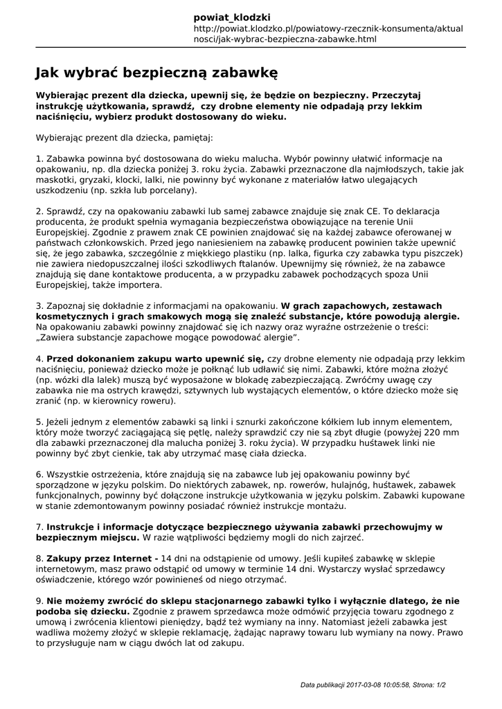 powiat_klodzki http://powiat.klodzko.pl/powiatowy-rzecznik-konsumenta/aktual nosci/jak-wybrac-bezpieczna-zabawke.html Jak wybrać bezpieczną zabawkę Wybierając prezent dla dziecka, upewnij się, że będzie on bezpieczny. Przeczytaj instrukcję użytkowania, sprawdź, czy drobne elementy nie odpadają przy lekkim naciśnięciu, wybierz produkt dostosowany do wieku. Wybierając prezent dla dziecka, pamiętaj: 1. Zabawka powinna być dostosowana do wieku malucha. Wybór powinny ułatwić informacje na opakowaniu, np. dla dziecka poniżej 3. roku życia. Zabawki przeznaczone dla najmłodszych, takie jak maskotki, gryzaki, klocki, lalki, nie powinny być wykonane z materiałów łatwo ulegających uszkodzeniu (np. szkła lub porcelany). 2. Sprawdź, czy na opakowaniu zabawki lub samej zabawce znajduje się znak CE. To deklaracja producenta, że produkt spełnia wymagania bezpieczeństwa obowiązujące na terenie Unii Europejskiej. Zgodnie z prawem znak CE powinien znajdować się na każdej zabawce oferowanej w państwach członkowskich. Przed jego naniesieniem na zabawkę producent powinien także upewnić się, że jego zabawka, szczególnie z miękkiego plastiku (np. lalka, figurka czy zabawka typu piszczek) nie zawiera niedopuszczalnej ilości szkodliwych ftalanów. Upewnijmy się również, że na zabawce znajdują się dane kontaktowe producenta, a w przypadku zabawek pochodzących spoza Unii Europejskiej, także importera. 3. Zapoznaj się dokładnie z informacjami na opakowaniu. W grach zapachowych, zestawach kosmetycznych i grach smakowych mogą się znaleźć substancje, które powodują alergie. Na opakowaniu zabawki powinny znajdować się ich nazwy oraz wyraźne ostrzeżenie o treści: „Zawiera substancje zapachowe mogące powodować alergie”. 4. Przed dokonaniem zakupu warto upewnić się, czy drobne elementy nie odpadają przy lekkim naciśnięciu, ponieważ dziecko może je połknąć lub udławić się nimi. Zabawki, które można złożyć (np. wózki dla lalek) muszą być wyposażone w blokadę zabezpieczającą. Zwróćmy uwagę czy zabawka nie ma ostrych krawędzi, sztywnych lub wystających elementów, o które dziecko może się zranić (np. w kierownicy roweru). 5. Jeżeli jednym z elementów zabawki są linki i sznurki zakończone kółkiem lub innym elementem, który może tworzyć zaciągającą się pętlę, należy sprawdzić czy nie są zbyt długie (powyżej 220 mm dla zabawki przeznaczonej dla malucha poniżej 3. roku życia). W przypadku huśtawek linki nie powinny być zbyt cienkie, tak aby utrzymać masę ciała dziecka. 6. Wszystkie ostrzeżenia, które znajdują się na zabawce lub jej opakowaniu powinny być sporządzone w języku polskim. Do niektórych zabawek, np. rowerów, hulajnóg, huśtawek, zabawek funkcjonalnych, powinny być dołączone instrukcje użytkowania w języku polskim. Zabawki kupowane w stanie zdemontowanym powinny posiadać również instrukcje montażu. 7. Instrukcje i informacje dotyczące bezpiecznego używania zabawki przechowujmy w bezpiecznym miejscu. W razie wątpliwości będziemy mogli do nich zajrzeć. 8. Zakupy przez Internet - 14 dni na odstąpienie od umowy. Jeśli kupiłeś zabawkę w sklepie internetowym, masz prawo odstąpić od umowy w terminie 14 dni. Wystarczy wysłać sprzedawcy oświadczenie, którego wzór powinieneś od niego otrzymać. 9. Nie możemy zwrócić do sklepu stacjonarnego zabawki tylko i wyłącznie dlatego, że nie podoba się dziecku. Zgodnie z prawem sprzedawca może odmówić przyjęcia towaru zgodnego z umową i zwrócenia klientowi pieniędzy, bądź też wymiany na inny. Natomiast jeżeli zabawka jest wadliwa możemy złożyć w sklepie reklamację, żądając naprawy towaru lub wymiany na nowy. Prawo to przysługuje nam w ciągu dwóch lat od zakupu. Data publikacji 2017-03-08 10:05:58, Strona: 1/2 powiat_klodzki http://powiat.klodzko.pl/powiatowy-rzecznik-konsumenta/aktual nosci/jak-wybrac-bezpieczna-zabawke.html 10. Zastrzeżenia co do bezpieczeństwa lub oznakowania produktów należy zgłaszać do Inspekcji Handlowej lub Departamentu Nadzoru Rynku w UOKiK. Źródło: www.uokik.gov.pl Data publikacji 2017-03-08 10:05:58, Strona: 2/2