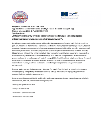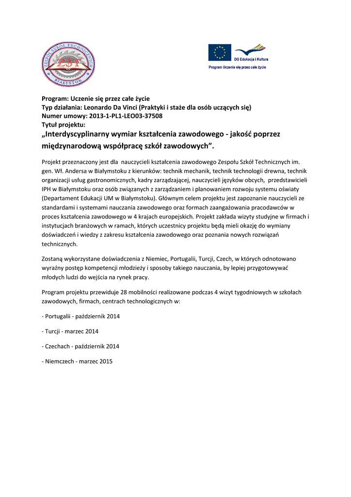 Program: Uczenie się przez całe życie Typ działania: Leonardo Da Vinci (Praktyki i staże dla osób uczących się) Numer umowy: 2013-1-PL1-LEO03-37508 Tytuł projektu: „Interdyscyplinarny wymiar kształcenia zawodowego - jakość poprzez międzynarodową współpracę szkół zawodowych”. Projekt przeznaczony jest dla nauczycieli kształcenia zawodowego Zespołu Szkół Technicznych im. gen. Wł. Andersa w Białymstoku z kierunków: technik mechanik, technik technologii drewna, technik organizacji usług gastronomicznych, kadry zarządzającej, nauczycieli języków obcych, przedstawicieli IPH w Białymstoku oraz osób związanych z zarządzaniem i planowaniem rozwoju systemu oświaty (Departament Edukacji UM w Białymstoku). Głównym celem projektu jest zapoznanie nauczycieli ze standardami i systemami nauczania zawodowego oraz formach zaangażowania pracodawców w proces kształcenia zawodowego w 4 krajach europejskich. Projekt zakłada wizyty studyjne w firmach i instytucjach branżowych w ramach, których uczestnicy projektu będą mieli okazję do wymiany doświadczeń i wiedzy z zakresu kształcenia zawodowego oraz poznania nowych rozwiązań technicznych. Zostaną wykorzystane doświadczenia z Niemiec, Portugalii, Turcji, Czech, w których odnotowano wyraźny postęp kompetencji młodzieży i sposoby takiego nauczania, by lepiej przygotowywać młodych ludzi do wejścia na rynek pracy. Program projektu przewiduje 28 mobilności realizowane podczas 4 wizyt tygodniowych w szkołach zawodowych, firmach, centrach technologicznych w: - Portugalii - październik 2014 - Turcji - marzec 2014 - Czechach - październik 2014 - Niemczech - marzec 2015