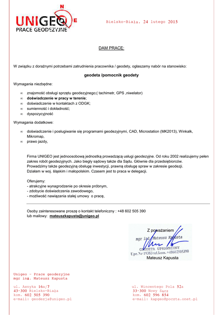 Bielsko-Biała, 24 lutego 2015 DAM PRACĘ: W związku z doraźnymi potrzebami zatrudnienia pracownika / geodety, ogłaszamy nabór na stanowisko: geodeta /pomocnik geodety Wymagania niezbędne: • • • • • znajomość obsługi sprzętu geodezyjnego;( tachimetr, GPS ,niwelator) doświadczenie w pracy w terenie; doświadczenie w kontaktach z ODGK; sumienność i dokładność; dyspozycyjność Wymagania dodatkowe: • • doświadczenie i posługiwanie się programami geodezyjnymi, CAD, Microstation (MK2013), Winkalk, Mikromap, prawo jazdy, Firma UNIGEO jest jednoosobową jednostką prowadzącą usługi geodezyjne. Od roku 2002 realizujemy pełen zakres robót geodezyjnych. Jako biegły sądowy także dla Sądu. Głównie dla przedsiębiorców. Prowadzimy także geodezyjną obsługę inwestycji, prawną obsługę spraw w zakresie geodezji. Działam w woj. śląskim i małopolskim. Czasem jest to praca w delegacji. Oferujemy: - atrakcyjne wynagrodzenie po okresie próbnym, - zdobycie doświadczenia zawodowego, - możliwość nawiązania stałej umowy o pracę, Osoby zainteresowane proszę o kontakt telefoniczny : +48 602 505 390 lub mailowy: [email protected] Z poważaniem Mateusz Kapusta Unigeo – Prace geodezyjne mgr inż. Mateusz Kapusta ul. Asnyka 16a/7 43-300 Bielsko-Biała kom. 602 505 390 e-mail: [email protected] ul. Wincentego Pola 52a 33-300 Nowy Sącz kom. 602 596 854 e-mail: [email protected]