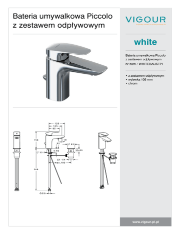 Bateria umywalkowa Piccolo z zestawem odpływowym white Bateria umywalkowa Piccolo z zestawem odpływowym nr zam.: WHITEBAUSTPI •z zestawem odpływowym •wylewka 105 mm •chrom www.vigour-pl.pl