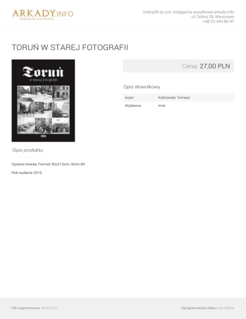 Dobra28 sp zoo. księgarnia wysyłkowa arkady.info ul. Dobra 28, Warszawa +48 22 444 86 97 TORUŃ W STAREJ FOTOGRAFII Cena: 27,00 PLN Opis słownikowy Autor Kalinowski Tomasz Wydawca Inne Opis produktu Oprawa twarda, Format 30x21,5cm, Stron 84 Rok wydania 2016 Plik wygenerowano: 08-03-2017 Powered by TCPDF (www.tcpdf.org) Oprogramowanie sklepu: AptusShop