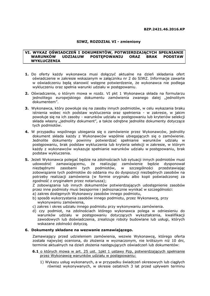 BZP.2421.46.2016.KP SIWZ, ROZDZIAŁ VI - zmieniony VI. WYKAZ OŚWIADCZEŃ I DOKUMENTÓW, POTWIERDZAJĄCYCH SPEŁNIANIE WARUNKÓW UDZIAŁUW POSTĘPOWANIU ORAZ BRAK PODSTAW WYKLUCZENIA 1. Do oferty każdy wykonawca musi dołączyć aktualne na dzień składania ofert oświadczenie w zakresie wskazanym w załączniku nr 2 do SIWZ. Informacje zawarte w oświadczeniu będą stanowić wstępne potwierdzenie, że wykonawca nie podlega wykluczeniu oraz spełnia warunki udziału w postępowaniu. 2. Oświadczenie, o którym mowa w rozdz. VI pkt 1 Wykonawca składa na formularzu jednolitego europejskiego dokumentu zamówienia zwanego dalej „jednolitym dokumentem”. 3. Wykonawca, który powołuje się na zasoby innych podmiotów, w celu wykazania braku istnienia wobec nich podstaw wykluczenia oraz spełnienia - w zakresie, w jakim powołuje się na ich zasoby - warunków udziału w postępowaniu lub kryteriów selekcji składa własny „jednolity dokument”, a także odrębne jednolite dokumenty dotyczące tych podmiotów. 4. W przypadku wspólnego ubiegania się o zamówienie przez Wykonawców, jednolity dokument składa każdy z Wykonawców wspólnie ubiegających się o zamówienie. Jednolite dokumenty powinny potwierdzać spełnianie warunków udziału w postępowaniu, brak podstaw wykluczenia lub kryteria selekcji w zakresie, w którym każdy z wykonawców wykazuje spełnianie warunków udziału w postępowaniu, brak podstaw wykluczenia. 5. Jeżeli Wykonawca polegać będzie na zdolnościach lub sytuacji innych podmiotów musi udowodnić zamawiającemu, że realizując zamówienie będzie dysponował niezbędnymi zasobami tych podmiotów, w szczególności przedstawiając zobowiązanie tych podmiotów do oddania mu do dyspozycji niezbędnych zasobów na potrzeby realizacji zamówienia (w formie oryginału albo kopii poświadczonej za zgodność z oryginałem przez notariusza); Z zobowiązania lub innych dokumentów potwierdzających udostępnienie zasobów przez inne podmioty musi bezspornie i jednoznacznie wynikać w szczególności: a) zakres dostępnych Wykonawcy zasobów innego podmiotu, b) sposób wykorzystania zasobów innego podmiotu, przez Wykonawcę, przy wykonywaniu zamówienia, c) zakres i okres udziału innego podmiotu przy wykonywaniu zamówienia. d) czy podmiot, na zdolnościach którego wykonawca polega w odniesieniu do warunków udziału w postępowaniu dotyczących wykształcenia, kwalifikacji zawodowych lub doświadczenia, zrealizuje roboty budowlane lub usługi, których wskazane zdolności dotyczą. 6. Dokumenty składane na wezwanie zamawiającego. Zamawiający przed udzieleniem zamówienia, wezwie Wykonawcę, którego oferta została najwyżej oceniona, do złożenia w wyznaczonym, nie krótszym niż 10 dni, terminie aktualnych na dzień złożenia następujących oświadczeń lub dokumentów: 6.1 o których mowa w art. 25 ust. 1pkt 1 ustawy Pzp, potwierdzających spełnianie przez Wykonawcę warunków udziału w postępowaniu: 1) Wykazu usług wykonanych, a w przypadku świadczeń okresowych lub ciągłych również wykonywanych, w okresie ostatnich 3 lat przed upływem terminu 2) składania ofert, a jeżeli okres prowadzenia działalności jest krótszy – w tym okresie, wraz z podaniem ich wartości, przedmiotu, dat wykonania i podmiotów, na rzecz których usługi zostały wykonane, oraz załączeniem dowodów określających czy te usługi zostały wykonane lub są wykonywane należycie, przy czym dowodami, o których mowa, są referencje bądź inne dokumenty wystawione przez podmiot, na rzecz którego usługi były wykonywane, a w przypadku świadczeń okresowych lub ciągłych są wykonywane, a jeżeli z uzasadnionej przyczyny o obiektywnym charakterze wykonawca nie jest w stanie uzyskać tych dokumentów – oświadczenie wykonawcy; w przypadku świadczeń okresowych lub ciągłych nadal wykonywanych referencje bądź inne dokumenty potwierdzające ich należyte wykonywanie powinny być wydane nie wcześniej niż 3 miesiące przed upływem terminu składania ofert; dokumentów dotyczących podmiotów trzecich, w celu wykazania spełniania warunków udziału w postępowaniu w zakresie, w jakim Wykonawca powołuje się na ich zasoby – jeśli wykonawca polega na zasobach podmiotu trzeciego. 6.2 Wykazujących brak podstaw do wykluczenia z postępowania o udzielenie zamówienia wykonawcy: 7. 1) informacji z Krajowego Rejestru Karnego w zakresie określonym w art. 24 ust. 1 pkt 13, 14 i 21 ustawy, wystawionej nie wcześniej niż 6 miesięcy przed upływem terminu składania ofert; 2) odpisu z właściwego rejestru lub z centralnej ewidencji i informacji o działalności gospodarczej, jeżeli odrębne prze-pisy wymagają wpisu do rejestru lub ewidencji, w celu potwierdzenia braku podstaw wykluczenia na podstawie art. 24 ust. 5 pkt 1 Pzp; 3) oświadczenia wykonawcy o braku wydania wobec niego prawomocnego wyroku sądu lub ostatecznej decyzji administracyjnej o zaleganiu z uiszczaniem podatków, opłat lub składek na ubezpieczenia społeczne lub zdrowotne albo – w przypadku wydania takiego wyroku lub decyzji – dokumentów potwierdzających dokonanie płatności tych należności wraz z ewentualnymi odsetkami lub grzywnami lub zawarcie wiążącego porozumienia w sprawie spłat tych należności; 4) oświadczenia wykonawcy o braku orzeczenia wobec niego tytułem środka zapobiegawczego zakazu ubiegania się o zamówienia publiczne; 5) dokumentów dotyczących podmiotów trzecich, w celu wykazania braku istnienia wobec nich podstaw wykluczenia – jeśli wykonawca polega na zasobach podmiotu trzeciego. Jeżeli Wykonawca ma siedzibę lub miejsce zamieszkania poza terytorium Rzeczypospolitej Polskiej, zamiast dokumentów o których mowa w pkt 6.2: 1) ppkt 1 - składa informację z odpowiedniego rejestru albo, w przypadku braku takiego rejestru, inny równoważny dokument wydany przez właściwy organ sądowy lub administracyjny kraju, w którym wykonawca ma siedzi