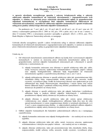 projekt Uchwała Nr Rady Miejskiej w Dąbrowie Tarnowskiej z dnia …………........ w sprawie określenia szczegółowego sposobu i zakresu świadczonych usług w zakresie odbierania odpadów komunalnych od właścicieli nieruchomości i zagospodarowania tych odpadów, w zamian za uiszczoną przez właściciela nieruchomości opłatę za gospodarowanie odpadami komunalnymi, w szczególności ilość odpadów komunalnych odbieranych od właściciela nieruchomości, częstotliwość odbierania odpadów komunalnych i sposób świadczenia usług przez punkty selektywnego zbierania odpadów komunalnych. Na podstawie art. 7 ust.1 pkt.3, art. 18 ust.2 pkt.15, art.40 ust.1, art. 41 ust.1 oraz art. 42 ustawy o samorządzie gminnym (Dz.U. 2001 nr 142, poz. 1591 z późn. zm.) i art. 6r ust. 3 ustawy z dnia 13 września 1996 r. o utrzymaniu czystości i porządku w gminach (Dz.U. z 2012r., poz. 391), Rada Miejska w Dąbrowie Tarnowskiej uchwala, co następuje: § 1. Uchwała określa szczegółowy sposób i zakres świadczenia usług w zakresie odbierania odpadów komunalnych od właścicieli nieruchomości i zagospodarowania tych odpadów, w zamian za uiszczoną przez właściciela nieruchomości opłatę za gospodarowanie odpadami komunalnymi. § 2. Ustala się, że: 1. Od właścicieli nieruchomości zamieszkałych odbiera się każdą ilość wytworzonych odpadów komunalnych w zamian za uiszczoną przez właściciela nieruchomości opłatę za ich gospodarowanie, zarówno odpadów komunalnych zmieszanych jak i zbieranych w sposób selektywny z zastrzeżeniem, że: 1) odpady komunalne zmieszane oraz zbierane w sposób selektywny takie jak: szkło, metal, tworzywa sztuczne, opakowania wielomateriałowe i tekstylia, papier i tekturę oraz odpady biodegradowalne odbierane będą bezpośrednio od właścicieli nieruchomości zgodnie z częstotliwością określoną w ust.2, ust.3 i ust.4, 2) odpady niebezpieczne zbierane w sposób selektywny takie jak: przeterminowane leki, chemikalia (farby, kleje, rozpuszczalniki, środki ochrony roślin, areozole, środki czystości, wywabiacze plam, środki do konserwacji drewna oraz opakowania po tych substancjach itp), lampy fluorescencyjne, akumulatory i zużyte opony oraz zużyte baterie odbierane będą w punktach selektywnej zbiórki; przedmiotowe odpady należy dostarczyć do punktów na własny koszt, 3) odpady zbierane w sposób selektywny takie jak odpady budowlane i rozbiórkowe odbierane będą w punkcie zbiórki odpadów budowlanych i rozbiórkowych; przedmiotowe odpady należy dostarczyć do punktu na własny koszt, 4) odpady zbierane w sposób selektywny takie jak: zużyty sprzęt elektryczny i elektroniczny oraz odpady wielkogabarytowe odbierane będą dwa razy do roku sprzed nieruchomości w czasie zorganizowanej zbiórki w terminach określonych w § 3 ust.2, a poza zorganizowaną zbiórką - w odpowiednich punktach odbioru odpadów; przedmiotowe odpady należy dostarczyć do punktów na własny koszt. 2. Odbiór odpadów komunalnych dla budynków jednorodzinnych odbywa się z następującą częstotliwością: 1) odpady komunalne zmieszane oraz odpady biodegradowalne – nie rzadziej niż raz na dwa tygodnie, 2) odpady zbierane selektywnie takie jak szkło, metal, tworzywa sztuczne, opakowania wielomateriałowe i tekstylia oraz papier i tektura – nie rzadziej niż raz w miesiącu, 3) odpady zbierane selektywnie, takie jak przeterminowane leki, chemikalia (farby, kleje, rozpuszczalniki, środki ochrony roślin, areozole, środki czystości, wywabiacze plam, środki do konserwacji drewna oraz opakowania po tych substancjach itp), lampy fluorescencyjne, akumulatory i zużyte opony, zużyte baterie oraz odpady budowlane i rozbiórkowe -– samodzielnie dostarczane na własny koszt do punktów selektywnej zbiórki zgodnie z zapotrzebowaniem, 4) odpady zbierane selektywnie takie jak zużyty sprzęt elektryczny i elektroniczny oraz odpady wielkogabarytowe odbierane będą bezpłatnie dwa razy do roku sprzed nieruchomości w czasie zorganizowanej zbiórki w terminach określonych w § 3 ust.2, a poza zorganizowaną zbiórką – samodzielnie dostarczane na własny koszt do punktów selektywnej zbiórki zgodnie z zapotrzebowaniem, 3. Odbiór odpadów komunalnych dla budynków wielomieszkaniowych odbywa się z następującą częstotliwością: 1) odpady komunalne zmieszane oraz odpady zbierane selektywnie takie jak metal, tworzywa sztuczne, opakowania wielomateriałowe i tekstylia, papier i tekturę oraz odpady biodegradowalne– nie rzadziej niż raz na tydzień, 2) odpady zbierane selektywnie takie jak szkło – nie rzadziej niż raz na dwa tygodnie, 3) odpady zbierane selektywnie, takie jak przeterminowane leki, chemikalia (farby, kleje, rozpuszczalniki, środki ochrony roślin, areozole, środki czystości, wywabiacze plam, środki do konserwacji drewna oraz opakowania po tych substancjach itp), lampy fluorescencyjne, akumulatory i zużyte opony, zużyte baterie oraz odpady budowlane i rozbiórkowe -– samodzielnie dostarczane na własny koszt do punktów selektywnej zbiórki zgodnie z zapotrzebowaniem, 4) odpady zbierane selektywnie takie jak zużyty sprzęt elektryczny i elektroniczny oraz odpady wielkogabarytowe odbierane będą bezpłatnie dwa razy do roku sprzed nieruchomości w czasie zorganizowanej zbiórki w terminach określonych w § 3 ust.2, a poza zorganizowaną zbiórką – samodzielnie dostarczane na własny koszt do punktów selektywnej zbiórki zgodnie z zapotrzebowaniem. 4. W przydatku systematycznego przepełnienia pojemników i worków wytwarzanymi odpadami komunalnymi należy doposażyć nieruchomość w odpowiednie pojemniki i worki. § 3. 1. Lokalizacja oraz godziny otwarcia punktów selektywnej zbiórki odpadów takich jak przeterminowane leki, chemikalia (farby, kleje, rozpuszczalniki, środki ochrony roślin, areozole, środki czystości, wywabiacze plam, środki do konserwacji drewna oraz opakowania po tych substa