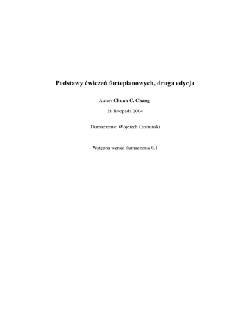 Podstawy ćwiczeń fortepianowych, druga edycja Autor: Chuan C. Chang 21 listopada 2004 Tłumaczenie: Wojciech Ozimiński Wstępna wersja tłumaczenia 0.1 Copyright 1994-2005; Żadna część tego dokumentu nie może być kopiowana bez dołączenia nazwisk autora: Chuan C. Chang i tłumacza edycji polskiej: Wojciech Ozimiński oraz tego oświadczenia o prawach autorskich. Prośba: osoby, które uznały ten materiał za użyteczny, proszone są o przekazanie informacje o mojej witrynie przynajmniej dwóm osobom, aby zapoczątkować reakcję łańcuchową i aby coraz więcej ludzi wiedziało o tym portalu. Szukam ochotników którzy podjęliby się przetłumaczenia tej książki na inne języki. Zobacz "Uwagi dla tłumaczy" na końcu "Spisu Treści". W celu przedyskutowania ze mną tych zagadnień proszę pisać na adres emailowy: [email protected] Obecnie książka dostępna jest w języku niemieckim, polskim , włoskim, francuskim oraz hiszpańskim. Jestem bardzo wdzięczny tłumaczowi edycji niemieckiej, Edgarowi Lins, za wiele sugestii z jego strony, co pozwoliło znacznie podnieść jakość tego opracowania. Jeżeli czujesz, że skorzystałeś z tej książki i chciałbyś wyrazić swoje uznanie, proszę prześlij datek do: C. C. Chang, 16212 Turnbury Oak Dr., Odessa, FL 33556, USA, dla pokrycia moich wydatków związanych z pisaniem książki I utrzymywaniem tych stron www. Osoby ściągające wersje inne niż angielska powinny przesłać swoje donacje do właściwego tłumacza. Jeżeli prześlesz 15$ lub więcej wyślę Ci pierwszą edycję mojej książki (tylko w języku angielskim) jeżeli jeszcze będę je miał (napisz swój adres pocztowy i emailowy). Zapłacę za koszty wysyłki (1 klasa lub poczta lotnicza do krajów zamorskich). Link do oryginalnej, angielskiej wersji w HTML oraz do polskiej wersji HTML. Nauka gry na fortepianie. Jeżeli masz nauczyciela stosuj tą książkę jako podręcznik uzupełniający. Jeżeli nie masz nauczyciela, wybierz dowolny utwór muzyczny, który chciałbyś grać (znajdujący się w zakresie twoich umiejętności technicznych) i zacznij go ćwiczyć za pomocą opisanych tutaj metod; metody są uszeregowane z grubsza w takim porządku w jakim będziesz ich potrzebował w procesie nauki. W obu przypadkach (z nauczycielem czy bez) za pierwszym razem przeczytaj szybko całą książkę, zaczynając od przedmowy, która da Ci szybki przegląd zagadnień. Przeskakuj sekcje, które uważasz w danej chwili za niepotrzebne lub zbyt szczegółowe; nie próbuj zrozumieć wszystkich koncepcji czy też wszystko zapamiętać – czytaj to jak powieść sciencefiction, dla przyjemności – musisz po prostu zapoznać się wstępnie z książką i zobaczyć gdzie pewne kwestie są w niej omówione. Na koniec przeczytaj to co uznasz za interesujące w sekcji świadectwa. Następnie zacznij ponownie czytać książkę od miejsca gdzie znajduje się materiał, który uznasz za najbardziej dla Ciebie przydatny; większość osób powinna przeczytać cały Rozdział Pierwszy, sekcje I i II. Następnie możesz przeskakiwać do tematów związanych z aktualnie opracowywaną przez Ciebie kompozycją. Jeżeli nie masz jasności jakie kompozycje wybrać do ćwiczeń, książka ta dostarcza wielu przykładów, od materiału dla początkujących (Rozdział Pierwszy, III.18) do średnio-zaawansowanego; tak więc podczas pierwszego czytania zapoznaj się z tymi przykładami/sugestiami Dedykuję tą książkę mojej żonie Merry, której miłość, wsparcie i nieograniczona energia umożliwiły mi poświęcenie tak wiele czasu temu projektowi. ŚWIADECTWA Świadectwa te ukazują nadzieje, próby, troski i triumfy pianistów i ich nauczycieli. Nie są one jedynie zbiorem pochlebstw, ale szczerymi, otwartymi dyskusjami o istocie nauki gry na fortepianie. Jestem zbudowany liczbą nauczycieli, którzy przesłali swoje świadectwa i ich opinią o pozytywnym wpływie propagowanych przeze mnie metod na wyniki ich nauczania. Wydaje się oczywiste, że nauczyciele, którzy przeprowadzają własne dociekania naukowe i przez to ulepszają swoje metody nauki, osiągają większe sukcesy. Liczni pianiści przyznawali, że byli źle nauczani przez swoich byłych nauczycieli. Natomiast wiele osób lubiących swoich nauczycieli pisało, że stosują oni metody podobne do opisywanych w tej książce. Jest niemalże pełna zgodność co do tego co jest dobre, a co złe; jeżeli podąża się drogą dociekań naukowych nie można dojść do sytuacji, w której ludzie nie mogą dojść do porozumienia co jest dobre, a co złe. Byłem pod wrażeniem szybkości, z jaką niektórzy ludzie byli w stanie zaadaptować do swoich potrzeb te metody. Fragmenty wypowiedzi zostały poddane minimalnej edycji – aby nie marnować czasu czytelników usunięte zostały nieistotne detale. Teksty w nawiasach klamrowych [...] są moimi komentarzami. Korzystam tutaj z okazji aby podziękować każdemu kto do mnie napisał; pomogło mi to w ulepszeniu tej książki. Nie mogę się oprzeć wrażeniu, że czytelnicy mojej książki piszą ją dla mnie (np. mógłbym wstawić ich uwagi do tekstu książki i pasowałyby idealnie !). W materiale, który zaraz przedstawię, nie kierowałem się wyborem tylko pozytywnych uwag; wybierałem materiał, który wydawał mi się istotny (edukacyjny) niezależnie od tego czy był pochlebny czy krytyczny. 1. [Od chrześcijańskiego duchownego] Ta książka jest Pianistyczną Biblią. Zrobiłem tak niewiarygodne postępy od kiedy ją kupiłem [pierwszą edycję]. Ciągle polecam ją innym. 2. [W styczniu 2003 otrzymałem ten email (z pozwoleniem)] Mam na imię Marc i mam 17 lat. Zacząłem uczyć się grać na fortepianie około miesiąc temu i przeczytałem książkę „Podstawy Ćwiczeń Fortepianowych”.... Nie mam jeszcze instruktora ale jestem w trakcie poszukiwań.... [dalej następuje seria wyjątkowo dojrzałych jak na tak młodą osobę z tak niewielkim doświadcze