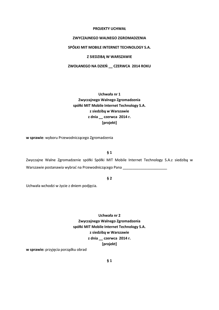 PROJEKTY UCHWAŁ ZWYCZAJNEGO WALNEGO ZGROMADZENIA SPÓŁKI MIT MOBILE INTERNET TECHNOLOGY S.A. Z SIEDZIBĄ W WARSZAWIE ZWOŁANEGO NA DZIEŃ __ CZERWCA 2014 ROKU Uchwała nr 1 Zwyczajnego Walnego Zgromadzenia spółki MIT Mobile Internet Technology S.A. z siedzibą w Warszawie z dnia __ czerwca 2014 r. [projekt] w sprawie: wyboru Przewodniczącego Zgromadzenia §1 Zwyczajne Walne Zgromadzenie spółki Spółki MIT Mobile Internet Technology S.A.z siedzibą w Warszawie postanawia wybrać na Przewodniczącego Pana ______________________ §2 Uchwała wchodzi w życie z dniem podjęcia. Uchwała nr 2 Zwyczajnego Walnego Zgromadzenia spółki MIT Mobile Internet Technology S.A. z siedzibą w Warszawie z dnia __ czerwca 2014 r. [projekt] w sprawie: przyjęcia porządku obrad §1 Zwyczajne Walne Zgromadzenie spółki Spółki MIT Mobile Internet Technology S.A.z siedzibą w Warszawie postanawia przyjąć następujący porządek obrad Zwyczajnego Walnego Zgromadzenia zwołanego na dzień dzisiejszy o następującej treści: 1. Otwarcie obrad Zwyczajnego Walnego Zgromadzenia Akcjonariuszy. 2. Wybór Przewodniczącego Zgromadzenia. 3. Sporządzenie listy obecności oraz stwierdzenie prawidłowości zwołania Zgromadzenia oraz sprawdzenie zdolności Zgromadzenia do podejmowania ważnych i skutecznych uchwał. 4. Przyjęcie porządku obrad. 5. Rozpatrzenie sprawozdania Zarządu z działalności spółki MIT Mobile Internet Technology S.A. za rok obrotowy 2013. 6. Rozpatrzenie jednostkowego sprawozdania finansowego spółki MIT Mobile Internet Technology S.A. za rok obrotowy 2013. 7. Rozpatrzenie skonsolidowanego sprawozdania finansowego spółki MIT Mobile Internet Technology S.A. za rok obrotowy 2013. 8. Rozpatrzenie wniosku Zarządu w sprawie podziału zysku spółki MIT Mobile Internet Technology S.A. za rok obrotowy 2013. 9. Przedstawienie i rozpatrzenie przez Radę Nadzorczą sprawozdania z wyników oceny: sprawozdania finansowego Spółki za rok obrotowy 2013, sprawozdania Zarządu z działalności Spółki w roku obrotowym 2013 oraz wniosku w sprawie podziału zysku spółki MIT Mobile Internet Technology S.A. za rok obrotowy 2013. 10. Podjęcie uchwał w sprawach: a) zatwierdzenia sprawozdania z działalności spółki MIT Mobile Internet Technology S.A. za rok obrotowy 2013; b) zatwierdzenia jednostkowego sprawozdania finansowego spółki MIT Mobile Internet Technology S.A. za rok obrotowy 2013; c) zatwierdzenia skonsolidowanego sprawozdania finansowego spółki MIT Mobile Internet Technology S.A. za rok obrotowy 2013; d) podziału zysku spółki MIT Mobile Internet Technology S.A. za rok obrotowy 2013; e) zatwierdzenia sprawozdania Rady Nadzorczej z działalności w 2013 roku; f) udzielenia poszczególnym członkom Zarządu i Rady Nadzorczej spółki MIT Mobile Internet Technology S.A. absolutorium z wykonania przez nich obowiązków w roku 2013; 11. Podjęcie uchwał w sprawie zmian w składzie w Radzie Nadzorczej. 12. Podjęcie dalszych uchwał w sprawach: a) zgody na nabycie akcji własnych Spółki; b) umorzenia akcji własnych Spółki; c) obniżenia kapitału zakładowego Spółki; d) scalenia akcji Spółki; e) udzielenia upoważnienia dla Zarządu do dokonywania wszelkich czynności faktycznych i prawnych niezbędnych do przeprowadzenia scalenia akcji Spółki; f) zmiany Statutu Spółki; g) upoważnienia Rady Nadzorczej Spółki do przyjęcia tekstu jednolitego Statutu. 13. Wolne wnioski. 14. Zamknięcie obrad Zgromadzenia. §2 Uchwała wchodzi w życie z dniem podjęcia. Uchwała wchodzi w życie z dniem podjęcia. Uchwała nr 3 Zwyczajnego Walnego Zgromadzenia spółki MIT Mobile Internet Technology S.A. z siedzibą w Warszawie z dnia __ czerwca 2014 r. [projekt] w sprawie: zatwierdzenia sprawozdania Zarządu z działalności spółki MIT Mobile Internet Technology S.A. za rok obrotowy 2013 Działając na podstawie art. 395 § 2 pkt 1 k.s.h. uchwala się, co następuje: § 1. Zwyczajne Walne Zgromadzenie spółki MIT Mobile Internet Technology S.A. z siedzibą w Warszawie postanawia zatwierdzić sprawozdanie Zarządu z działalności spółki MIT Mobile Internet Technology S.A. za rok obrotowy 2013. § 2. Uchwała wchodzi w życie z dniem podjęcia. Uchwała nr 4 Zwyczajnego Walnego Zgromadzenia spółki MIT Mobile Internet Technology S.A. z siedzibą w Warszawie z dnia __ czerwca 2014 r. [projekt] w sprawie: zatwierdzenia jednostkowego sprawozdania finansowego spółki MIT Mobile Internet Technology S.A. za rok obrotowy 2013 Działając na podstawie art. 395 § 2 pkt 1 k.s.h. uchwala się, co następuje: § 1. Zwyczajne Walne Zgromadzenie spółki MIT Mobile Internet Technology S.A. z siedzibą w Warszawie postanawia zatwierdzić sprawozdanie finansowe MIT Mobile Internet Technology S.A. za rok obrotowy 2013 obejmujące: - bilans sporządzony na dzień 31 grudnia 2013 roku, który po stronie aktywów i pasywów wykazuje sumę ___________________ złotych (słownie: _______________________), - rachunek zysków i strat za rok obrotowy 2013 wykazujący zysk netto w kwocie _____________ złotych (słownie: ____________________ ), - zestawienie zmian w kapitale (funduszu) własnym, wykazujące zwiększenie/zmniejszenie kapitału własnego za rok 2013 o kwotę ________ złotych (słownie: ________________________), - rachunek przepływów pieniężnych wykazujący zwiększenie/zmniejszenie stanu środków pieniężnych w 2013 roku o kwotę _____________ złotych (słownie: _________________________), - dodatkowe informacje i objaśnienia. § 2. Uchwała wchodzi w życie z dniem podjęcia. Uchwała nr 5 Zwyczajnego Walnego Zgromadzenia spółki MIT Mobile Internet Technology S.A. z siedzibą w Warszawie z dnia __ czerwca 2014 r. [projekt] w sprawie: zatwierdzenia skonsolidowanego sprawozdania finansowego grupy kapitałowej MIT Mobile Internet Technology za rok obrotowy 2013 Działając na podstawie art. 395 § 2 pkt 1 k.s.h. uchwala się, co następuje: § 1. Zwyczajne Walne Zgromadzen