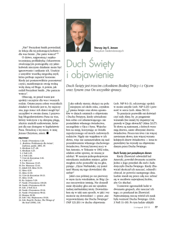 „Nie!” Prezydent Smith powiedział, że lekcja dla tej pokutującej kobiety i dla was brzmi: „Nie patrz wstecz!” 24 O dziwo, najprostszą i najsku teczniejszą profilaktyką i lekarstwem zwalczającym pornografię czy jakie kolwiek nieczyste działanie może być ignorowanie i unikanie ich. Usuńcie z umysłów wszelką niegodną myśl, która próbuje zapuścić korzenie. Kiedy już postanowiliście pozostawać czyści, manifestujecie swoją wolną wolę daną od Boga. A potem, jak radził Prezydent Smith: „Nie patrzcie wstecz”. Obiecuję, że przed wami jest spokój i szczęście dla was i waszych rodzin. Ostatecznym celem wszystkich działań w Kościele jest to, by mężczy zna, jego żona i ich dzieci mogli być szczęśliwi w swoim domu. I przywo łuję błogosławieństwa Pana na was, którzy walczycie z tą okropną plagą, abyście znaleźli uzdrowienie, które jest dla nas dostępne w kapłaństwie Pana. Świadczę o tej mocy, w imię Jezusa Chrystusa, amen. ◼ Przypisy 1. Nauki i Przymierza 1:20. 2. „Rodzina: Proklamacja dla świata”, Liahona, paźdz. 2004, 49. 3. Abraham 4:27–28. 4. Abraham 3:25. 5. 2 Nefi 2:25. 6. 2 Nefi 2:26. 7. I List do Koryntian 3:16. 8. 2 Nefi 2:27. 9. Ew. Mateusza 13:45. 10. Ew. Mateusza 13:44. 11. Jakub 6:8; Alma 34:31. 12. Alma 42:8. 13. Alma 41:10. 14. I List do Koryntian 10:13. 15. Alma 13:28. 16. Ks. Izajasza 5:20. 17. Nauki i Przymierza 130:20. 18. Nauki i Przymierza 82:10. 19. Zob. 2 Nefi 32:3. 20. Nauki i Przymierza 19:16. 21. Nauki i Przymierza 58:42. 22. Mosjasz 26:30. 23. Zob. I Ks. Mojżeszowa 19:26. 24. Zob. Boyd K. Packer, The Things of the Soul (1996), 116. Starszy Jay E. Jensen Prezydium Siedemdziesiątych Duch Święty i objawienie Duch Święty jest trzecim członkiem Boskiej Trójcy i z Ojcem oraz Synem zna On wszystkie sprawy. J ako młody starszy, służący na polu misyjnym od około roku, czytałem pisma święte oraz słowa aposto łów w dniach ostatnich o objawieniu i Duchu Świętym, kiedy uświadomi łem sobie coś zdumiewającego: nie posiadałem własnego świadectwa, szczególnie o Ojcu i Synu. Wyjecha łem na misję, korzystając ze światła zapożyczonego od moich cudownych rodziców. Nigdy nie wątpiłem w ich słowa, więc nie zastanawiałem się nad poszukiwaniem własnego duchowego świadectwa. Pewnej lutowej nocy w San Antonio, w Teksasie w 1962 roku, zdałem sobie sprawę, że muszę je zdobyć. W naszym jednopokojowym mieszkaniu znalazłem miejsce, gdzie mogłem cicho pomodlić się na głos, pytając: „Ojcze Niebiański, czy jesteś tam? Muszę się tego dowiedzieć dla siebie!” Jakiś czas później po raz pierwszy w mym życiu wiedziałem, że Bóg i Je zus rzeczywiście istnieją. Nie doszedł mnie słyszalny głos ani nie ujrzałem żadnej niebiańskiej istoty. Dowiedzia łem się w taki sam sposób, w jaki i wy możecie się dowiedzieć — przez „nie wypowiedziany dar Ducha Świętego” (NiP 121:26) i w duchu objawienia (zob. NiP 8:1–3), odczuwając spokój w moim umyśle (zob. NiP 6:23) i pew ność w sercu (zob. Alma 58:11). To przeżycie pozwoliło mi doświad czyć rady Almy, by „to pragnienie wzrastało [we mnie], by dopatrzyć się prawdy w [ Jego słowach]” (Alma 32:27). Te słowa są nasionami, z których wyra stają drzewa, zaiste olbrzymie drzewa świadectwa. Proces ten trwa i im więcej zawierzam słowu, tym więcej wyrasta kolejnych drzew świadectwa — teraz to prawdziwy las wyrosły na objawieniu danym przez Ducha Świętego. Duch Święty jest pożądanym darem Kiedy Zbawiciel odwiedził lud Ameryki, powołał dwunastu uczniów. Jedno z Jego przesłań dla nich i ludu dotyczyło Ducha Świętego. Kiedy Zba wiciel skończył ich nauczać, odszedł i obiecał, że powróci następnego dnia. Ludzie starali się przez całą noc zebrać się w możliwie największej liczbie, aby Go słuchać. Uczniowie zgromadzili ludzi w dwunastu grupach, aby nauczać ich tego, co przekazał im Zbawiciel. Najważniejszą rzeczą wśród ich nauk była ważność Ducha Świętego. (Zob. 3 Nefi 11–18). Po tym ludzie uklękli Listopad 2010 77 ponownie i modlili się. Ich najszczer szym pragnieniem było otrzymanie Ducha Świętego (zob. 3 Nefi 19:8–9). Zbawiciel ukazał się im i ponownie podkreślił ważność Ducha Świętego, kiedy modlił się do Ojca: „Ojcze, dziękuję Ci, że dałeś Ducha Świętego tym, których wybrałem; […] Ojcze, proszę Cię, abyś nadał Du cha Świętego wszystkim, którzy uwie rzą w ich słowa” (3 Nefi 19:20–21). Opierając się na tym wydarzeniu z Księgi Mormona, lepiej rozumiem, dlaczego Prezydent Wilford Woodruff powiedział, „że dar Ducha Świętego jest najwspanialszym darem, który może być dany człowiekowi. […] […] Nie jest on przeznaczony tylko dla mężczyzn, czy apostołów lub pro roków; należy do każdego wiernego mężczyzny i kobiety oraz każdego dziecka, które jest wystarczająco duże, aby przyjąć ewangelię Chrystusa” (Teachings of Presidents of the Church: Wilford Woodruff [2004], 49). Objawienie zapewnia odpowiedzi w potrzebie Duch Święty jest trzecim człon kiem Boskiej Trójcy i z Ojcem oraz Synem zna On wszystkie sprawy (zob. NiP 35:19; 42:17). Odgrywa On kilka istotnych ról; przede wszystkim po ucza ich i świadczy On o Ojcu i Synu (zob. 3 Nefi 28:11). Inną Jego rolą jest objawianie prawdy o wszystkim (zob. Moroni 10:5) i wiedzie On do czynie nia dobra (zob. NiP 11:12). Prezydent Thomas S. Monson jest przykładem tej ważnej roli bycia wie dzionym do czynienia dobra. Podąża śladami Zbawiciela, który „chodził, czyniąc dobrze” (Dzieje Apostolskie 10:38). Nauczał o tym, jak ważne jest podążanie za duchowymi podszep tami Ducha Świętego, szczególnie, gdy odwiedzamy kogoś, służymy im i ratujemy ich. 78 Liahona Ale czasami nie ma Prezydenta Monsona ani nauczycieli domowych, czy troskliwych sióstr, którzy mog liby usłużyć w potrzebie. W takich sytuacjach znajdowałem poc