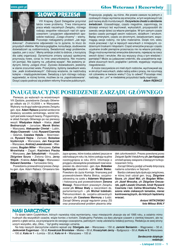 G³os Weterana i Rezerwisty www.gwir.pl SŁOWO PREZESA VIII Krajowy Zjazd Delegatów przyniósł także nowe problemy. Trwa intensywna praca władz naczelnych Związku, różnego rodzaju zespołów roboczych nad ich opracowaniem i przyjęciem odpowiednich sposobów realizacji. „Czego chcemy” – wiemy. Pozostaje niebagatelny problem „Jak tego dokonać”. Znalezienie odpowiedzi na to pytanie, to klucz do przyszłych efektów. Wymiana poglądów, konsultacje, studiowanie doświadczeń są codziennością. Świadomość wagi problemów, spędza „sen z oczu”. Mamy ambicje zrobić to dobrze, z korzyścią dla całej organizacji. Dynamiczne zmiany sytuacji społecznej przynoszą nowe, coraz to inne uwarunkowania. Nie możemy ich pomijać. Nie żyjemy na „odludnej wyspie”. Nie jesteśmy jedynymi, którzy „czegoś chcą”. Życiowo doświadczeni, jesteśmy w stanie zrozumieć wiele. Przeżyliśmy, byliśmy świadkami wielu tzw. „walk środowiskowych”. Odnoszę wrażenie, że nadchodzą kolejne – międzypokoleniowe. Świadczą o tym różnego rodzaju wypowiedzi, w różnej formie, możliwe że na „zapotrzebowanie”. Dosyć często podnosi się problem reformy finansów publicznych. Propozycje, poglądy, są różne. Ale prawie zawsze na jednym z czołowych miejsc wymienia się emerytów, w tym wojskowych lub pod nazwą służb mundurowych. Oczywiście chodzi o obniżenie świadczeń. Uzasadniając, często niegodnie, zapominają, że dzisiejsi emeryci też wychowali, wykształcili, przysposobili do zawodu swoje dzieci za własne pieniądze. W tym samym czasie bardzo często pomagali swoim rodzicom, dziadkom i wnukom. Będąc emerytami, często ze skromnymi, świadczeniami, wspomagają swoje rodziny, nie tylko materialnie. Dzięki nim, wielu może pracować i żyć w lepszych warunkach z mniejszymi, codziennymi troskami i kłopotami. Część emerytów pracuje i często uzyskane środki pieniężne przeznacza nie na własne potrzeby. Długo można wymieniać emeryckie dokonania, najwięcej na rzecz swoich dzieci i wnuków. Ale czy wszyscy chcą o tym wiedzieć i pamiętać? Może za judaszowe srebrniki, dla uzasadnienia wątpliwie słusznych teorii, poglądów i potrzeb, wygadują i wypisują niegodziwości. A może rzeczywiście oni mieli złych rodziców, wychowywali się w okrutnych warunkach, słabo radzą sobie z pracą, nie rozumieją roli człowieka w kwiecie wieku? Czy to odwet? Pozostaje mieć nadzieję, że i „oni” w niedalekiej przyszłości będą mądrzejsi. Adam RĘBACZ INAUGURACYJNE POSIEDZENIE ZARZĄDU GŁÓWNEGO Pierwsze, po wyborach na wrześniowym VIII Zjeździe, posiedzenie Zarządu Głównego odbyło się 21.10.2009 r. w Warszawie. Wybrany na drugą kadencję prezes Związku gen. dyw. Adam Rębacz powitał serdecznie działaczy szczebla centralnego, wśród których jest wiele nowych twarzy. Przypomnijmy, w skład Zarządu Głównego po raz pierwszy weszli: Władysław Adach – Kielce, Józef Bednarczyk – Jarosław, Marek Bielec – Warszawa, Aleksander Chmiel – Lublin, Alojzy Ciszewski – Łódź, Ryszard Czarnota – Gdańsk, Czesław Hebda – Skierniewice, Ryszard Hejna – Zamość, Bolesław Izydorczyk – Warszawa, Jan Kacprzak – Warszawa, Andrzej Lewandowski – Warszawa, Bogdan Miller – Warszawa, Celina Mrowińska – Żagań, Kazimierz Piecka – Warszawa, Jan Szkudziński – Koszalin, Zbigniew Szura – Zielona Góra, Jerzy Wójcik – Kraków, Adam Zając – Warszawa i Edward Zaremba – Tarnowskie Góry. Posiedzeniu przewodniczył prezes Związku gen. dyw. Adam Rębacz. Omawiano bie- żące sprawy, które trzeba załatwić jeszcze w odchodzącym roku i te, które czekają na pilne rozstrzygnięcia w roku 2010. Informacje o przyjęciu obowiązków przedstawili nowi wiceprezesi: ds. obronności – gen. dyw. Bolesław Izydorczyk i skarbnik – płk Marek Bielec. Powołano do życia Komisje: finansową pod przewodnictwem Marka Bielca, socjalnozdrowotną na czele z Adamem Wojnarem i historyczną pod przewodnictwem Zenona Biesagi. Rzecznikiem prasowym Związku został płk Miłosz Biały a rzecznikiem ds. parlamentarnych – płk Michał Izdebski. Pełnomocnikiem ds. socjalno-zdrowotnych wybrano płk Czesława Marmurę z Łodzi. Zarząd Główny przyjął regulamin pracy ZG oraz przeanalizował problem płacenia skła- dek członkowskich. Prezes powołanej przez Związek Spółki Vets&Army płk Jan Kacprzak omówił sprawy związane z bieżącym funkcjonowaniem firmy. Zarząd Główny podjął uchwałę dotyczącą nadania sztandaru w Sejnach. Bardzo ciekawa była dyskusja związkowa, w której brali udział gen. bryg. Zbigniew Szura, płk Józef Mól, płk Bogdan Miller, płk Józef Mroczka, płk Zbigniew Owczarek, ppłk Leszek Chumek, kmdr Ryszard Czarnota i kol. Celina Mrowińska. Poruszono wiele ciekawych tematów, nieraz kontrowersyjnych, do których będziemy wracać. Antoni WITKOWSKI foto Miłosz Biały Nasi Darczyńcy To dzięki takim Czytelnikom, których nazwiska niżej wymieniamy, nasz miesięcznik ukazuje się od 1995 roku, a ostatnio mimo trudnych dla wszystkich czasów, wiąże koniec z końcem. Dziękujemy Państwu za dary płynące czasem z cienkiej kieszeni, ale na pewno z głębi serca, za przywiązanie do swojego czasopisma, patriotyzm i wolę udzielania redakcji pomocy. Redakcja ze swej strony uczyni wszystko, aby „Głos...” był godny waszego uznania. Na listę naszych darczyńców ostatnio wpisali się: Dźwigała Jan – Warszawa – 150 zł, Janicki Beniamin – Wągrowiec – 50 zł, Jaśkowiak Eugeniusz – 50 zł, Kowalczuk Bronisław – Mielec – 50 zł, Kruszyński Jerzy – Bydgoszcz – 50 zł, Koło nr 2, Warszawa – 100 zł, Koło nr 1 – Łomża – 50 zł, Koło nr 4 – Warszawa – 100 zł. Serdecznie dziękuje redakcja ~ Listopad 2009 ~