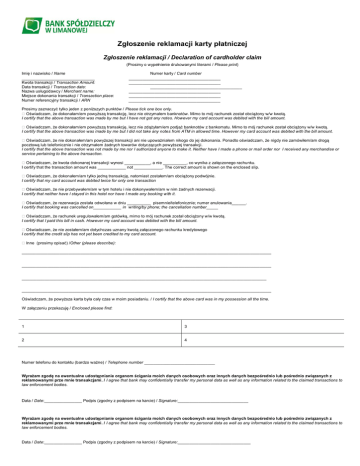 Zgłoszenie reklamacji karty płatniczej Zgłoszenie reklamacji / Declaration of cardholder claim (Prosimy o wypełnienie drukowanymi literami / Please print) Imię i nazwisko / Name _______________________________ Kwota transakcji / Transaction Amount: Data transakcji / Transaction date: Nazwa usługodawcy / Merchant name: Miejsce dokonania transakcji / Transaction place: Numer referencyjny transakcji / ARN Numer karty / Card number _______________________________________ _______________________________________ _______________________________________ _______________________________________ _______________________________________ _______________________________________ Prosimy zaznaczyć tylko jeden z poniższych punktów / Please tick one box only. Oświadczam, że dokonałam/em powyższą transakcję, lecz nie otrzymałem banknotów. Mimo to mój rachunek został obciążony w/w kwotą. I certify that the above transaction was made by me but I have not got any notes. However my card account was debited with the bill amount. Oświadczam, że dokonałam/em powyższą transakcję, lecz nie zdążyłam/em podjąć banknotów z bankomatu. Mimo to mój rachunek został obciążony w/w kwotą. I certify that the above transaction was made by me but I did not take any notes from ATM in allowed time. However my card account was debited with the bill amount. Oświadczam, że nie dokonałem/am powyższej transakcji ani nie upoważniałem nikogo do jej dokonania. Ponadto oświadczam, że nigdy nie zamówiłem/am drogą pocztową lub telefonicznie i nie otrzymałem żadnych towarów dotyczących powyższej transakcji. I certify that the above transaction was not made by me nor I authorized anyone to make it. Neither have I made a phone or mail order nor I received any merchandise or service pertaining to the above transaction. Oświadczam, że kwota dokonanej transakcji wynosi ___________, a nie __________, co wynika z załączonego rachunku. I certify that the transaction amount was ____________ not ____________. The correct amount is shown on the enclosed slip. Oświadczam, że dokonałem/am tylko jedną transakcję, natomiast zostałem/am obciążony podwójnie. I certify that my card account was debited twice for only one transaction Oświadczam, że nie przebywałem/am w tym hotelu i nie dokonywałem/am w nim żadnych rezerwacji. I certify that neither have I stayed in this hotel nor have I made any booking with it. Oświadczam, że rezerwacja została odwołana w dniu __________ pisemnie/telefonicznie; numer anulowania______. I certify that booking was cancelled on____________ in writing/by phone; the cancellation number_____ Oświadczam, że rachunek uregulowałem/am gotówką, mimo to mój rachunek został obciążony w/w kwotą. I certify that I paid this bill in cash. However my card account was debited with the bill amount. Oświadczam, że nie zostałem/am dotychczas uznany kwotą załączonego rachunku kredytowego I certify that the credit slip has not yet been credited to my card account. Inne (prosimy opisać) /Other (please describe): __________________________________________________________________________________________________________ __________________________________________________________________________________________________________ _________________________________________________________________________________________________ __________________________________________________________________________________________________________ Oświadczam, że powyższa karta była cały czas w moim posiadaniu. / I certify that the above card was in my possession all the time. W załączeniu przekazuję / Enclosed please find: 1 3 2 4 Numer telefonu do kontaktu (bardzo ważne) / Telephone number ______________________________ Wyrażam zgodę na ewentualne udostępnianie organom ścigania moich danych osobowych oraz innych danych bezpośrednio lub pośrednio związanych z reklamowanymi prze mnie transakcjami. / I agree that bank may confidentially transfer my personal data as well as any information related to the claimed transactions to law enforcement bodies. Data / Date:________________ Podpis (zgodny z podpisem na karcie) / Signature:______________________________ Wyrażam zgodę na ewentualne udostępnianie organom ścigania moich danych osobowych oraz innych danych bezpośrednio lub pośrednio związanych z reklamowanymi prze mnie transakcjami. / I agree that bank may confidentially transfer my personal data as well as any information related to the claimed transactions to law enforcement bodies. Data / Date:________________ Podpis (zgodny z podpisem na karcie) / Signature:_______________________________ wypełnia placówka sprzedażowa Banku: dane dotyczące placówka sprzedażowej Banku: ......... Oddział w ............................................................... filia nr ......... w ................................................................ imię i nazwisko pracownika do kontaktu oraz jego nr telefonu: .......................................................................................... .......................................................................................... .......................................................................................... stempel dzienny