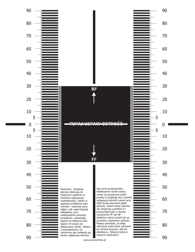 90 90 80 80 70 70 60 60 50 50 40 40 30 30 BF 20 20 10 10 5 5 TUTAJ USTAW OSTROŒÆ 0 5 0 5 10 10 20 20 FF 30 30 40 50 60 70 80 90 40 Wydrukuj niniejsz¹ planszê testow¹ na matowym papierze w mo¿liwie najwy¿szej rozdzielczoœci. Ustaw w aparacie œrodkowe pole ostroœci i wykonaj seriê zdjêæ z jak najmniejszej odleg³oœci, przy maksymalnie otwartej przes³onie, ustawiaj¹c aparat na statywie pod k¹tem 45 stopni do p³aszczyzny kartki. Zobacz w powiêkszeniu na monitorze jak rozk³ada siê strefa najlepszej ostroœci. Wg norm producentów obiektywów wynik nale¿y uznaæ za pozytywny je¿eli punkty 0 znajduj¹ siê w strefie najlepszej ostroœci nawet przy doœæ du¿ej asymetrii g³êbi ostroœci. Je¿eli strefa ostroœci nie obejmuje punktów 0 i przesuniêta jest w stronê oznaczenia FF lub BF obiektyw ostrzy przed lub za punktem ustawienia ostroœci. Nale¿y pamiêtaæ, ¿e b³¹d ostrzenia mo¿e le¿eæ zarówno po stronie korpusu, jak te¿ obiektywu. Wiêcej czytaj w naszych artyku³ach. www.accord-foto.pl 50 60 70 80 90