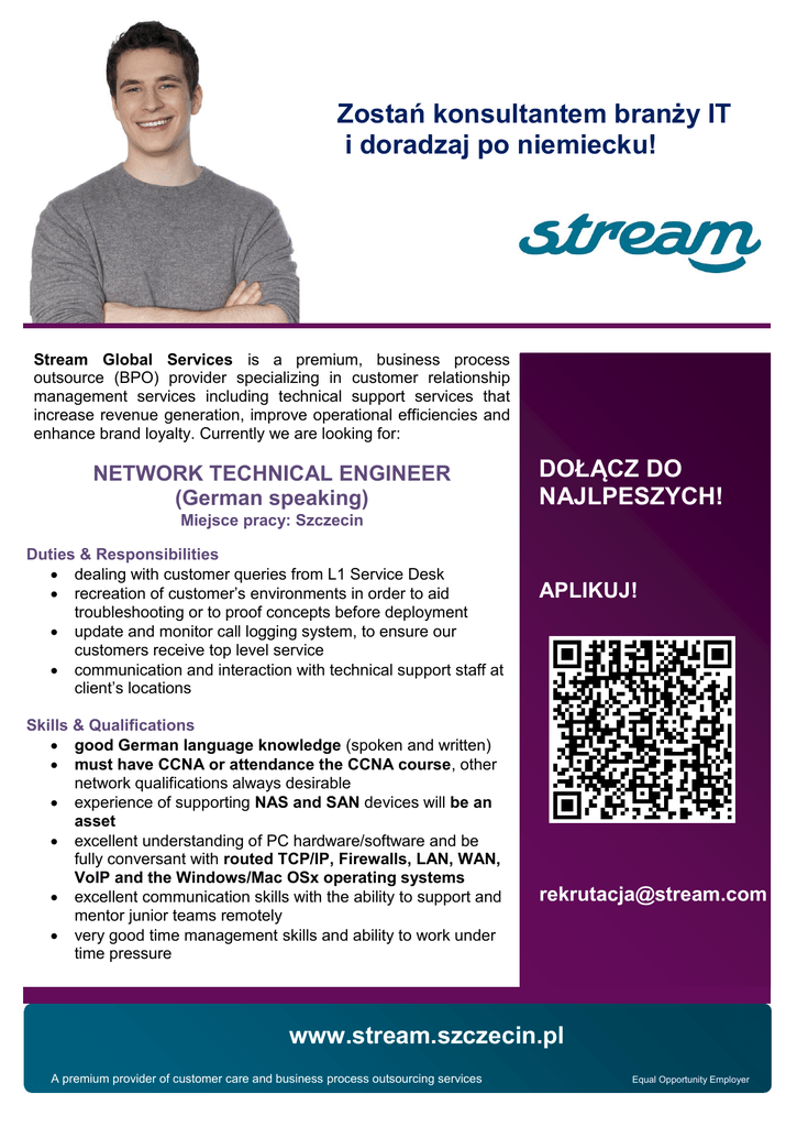 Zostań konsultantem branży IT i doradzaj po niemiecku! Stream Global Services is a premium, business process outsource (BPO) provider specializing in customer relationship management services including technical support services that increase revenue generation, improve operational efficiencies and enhance brand loyalty. Currently we are looking for: NETWORK TECHNICAL ENGINEER (German speaking) DOŁĄCZ DO NAJLPESZYCH! Miejsce pracy: Szczecin Duties & Responsibilities dealing with customer queries from L1 Service Desk recreation of customer’s environments in order to aid troubleshooting or to proof concepts before deployment update and monitor call logging system, to ensure our customers receive top level service communication and interaction with technical support staff at client’s locations Skills & Qualifications good German language knowledge (spoken and written) must have CCNA or attendance the CCNA course, other network qualifications always desirable experience of supporting NAS and SAN devices will be an asset excellent understanding of PC hardware/software and be fully conversant with routed TCP/IP, Firewalls, LAN, WAN, VoIP and the Windows/Mac OSx operating systems excellent communication skills with the ability to support and mentor junior teams remotely very good time management skills and ability to work under time pressure APLIKUJ! [email protected] www.stream.szczecin.pl A premium provider of customer care and business process outsourcing services Equal Opportunity Employer