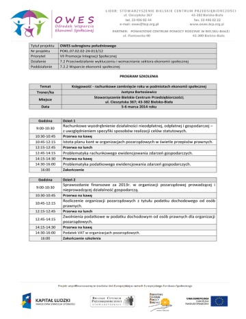 Tytuł projektu Nr projektu Priorytet Działanie Poddziałanie OWES subregionu południowego POKL.07.02.02-24-013/12 VII Promocja Integracji Społecznej 7.2 Przeciwdziałanie wykluczeniu i wzmacnianie sektora ekonomii społecznej 7.2.2 Wsparcie ekonomii społecznej PROGRAM SZKOLENIA Temat Trener/ka Miejsce Data Godzina 9:00-10:30 10:30-10:45 10:45-12:15 12:15-12:45 12:45-14:15 14:15-14:30 14:30-16:00 16:00 Godzina Księgowość - rachunkowe zamknięcie roku w podmiotach ekonomii społecznej Justyna Bartosiewicz Stowarzyszenie Bielskie Centrum Przedsiębiorczości; ul. Cieszyńska 367; 43-382 Bielsko-Biała 5-6 marca 2014 roku Dzień 1 Rachunkowe wyodrębnienie działalności nieodpłatnej, odpłatnej i gospodarczej – z uwzględnieniem specyfiki sposobów realizacji celów statutowych. Przerwa na kawę Istota planu kont w organizacjach pozarządowych w świetle przepisów prawnych. Przerwa na lunch Problematyka rachunkowego ewidencjowania zdarzeń gospodarczych. Przerwa na kawę Problematyka podatkowego ewidencjowania zdarzeń gospodarczych. Zakończenie Dzień 2 9:00-10:30 Sprawozdanie finansowe za 2013r. w organizacji pozarządowej prowadzącej i nieprowadzącej działalność gospodarczą. 10:30-10:45 Przerwa na kawę 10:45-12:15 Rozliczenie organizacji pozarządowych z tytułu podatku dochodowego od osób prawnych. 12:15-12:45 Przerwa na lunch 12:45-14:15 Zwolnienia podatkowe w podatku dochodowym od osób prawnych dla organizacji pozarządowych. 14:15-14:30 14:30-16:00 16:00 Przerwa na kawę Podatek VAT w organizacjach pozarządowych. Zakończenie szkolenia