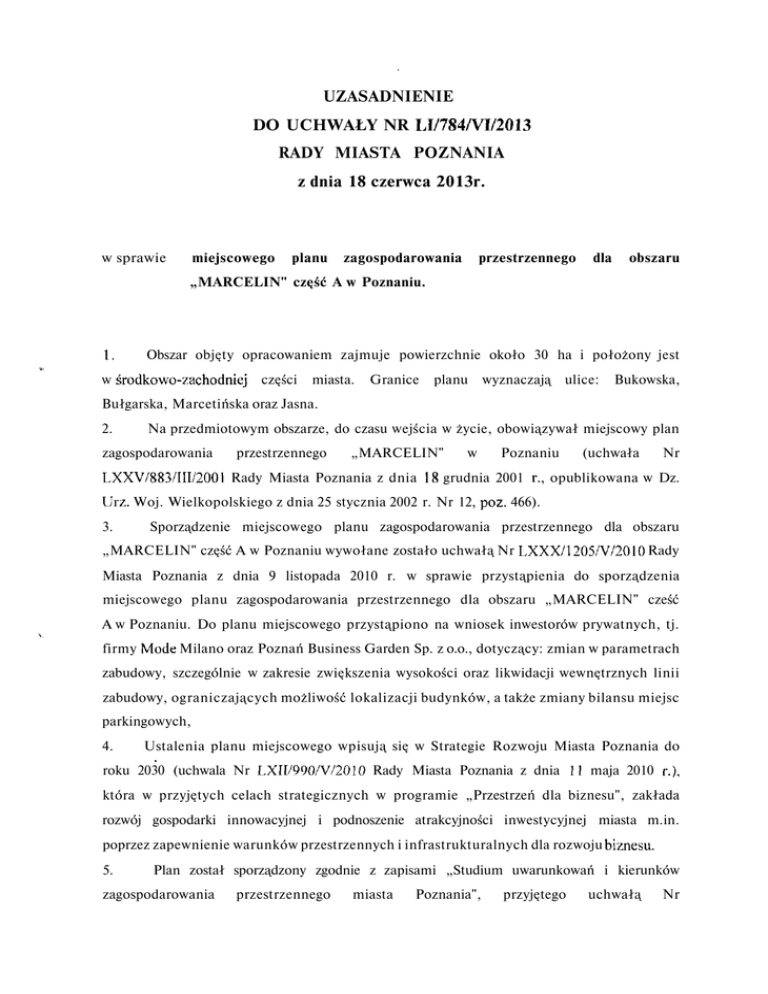 UZASADNIENIE DO UCHWAŁY NR LI/784/YI/2013 RADY MIASTA POZNANIA z dnia 18 czerwca 2013r. miejscowego w sprawie planu zagospodarowania przestrzennego dla obszaru „MARCELIN" część A w Poznaniu. 1. Obszar objęty opracowaniem zajmuje powierzchnie około 30 ha i położony jest w środkowo-zachodniej części miasta. Granice planu wyznaczają ulice: Bukowska, Bułgarska, Marcetińska oraz Jasna. 2. Na przedmiotowym obszarze, do czasu wejścia w życie, obowiązywał miejscowy plan zagospodarowania przestrzennego „MARCELIN" w Poznaniu (uchwała Nr LXXV/883/III/2001 Rady Miasta Poznania z dnia 18 grudnia 2001 r., opublikowana w Dz. Urz. Woj. Wielkopolskiego z dnia 25 stycznia 2002 r. Nr 12, póz. 466). 3. Sporządzenie miejscowego planu zagospodarowania przestrzennego dla obszaru „MARCELIN" część A w Poznaniu wywołane zostało uchwałą Nr LXXX/1205/V/2010 Rady Miasta Poznania z dnia 9 listopada 2010 r. w sprawie przystąpienia do sporządzenia miejscowego planu zagospodarowania przestrzennego dla obszaru „MARCELIN" cześć A w Poznaniu. Do planu miejscowego przystąpiono na wniosek inwestorów prywatnych, tj. firmy Modę Milano oraz Poznań Business Garden Sp. z o.o., dotyczący: zmian w parametrach zabudowy, szczególnie w zakresie zwiększenia wysokości oraz likwidacji wewnętrznych linii zabudowy, ograniczających możliwość lokalizacji budynków, a także zmiany bilansu miejsc parkingowych, 4. Ustalenia planu miejscowego wpisują się w Strategie Rozwoju Miasta Poznania do roku 2030 (uchwala Nr LXII/990/V/2010 Rady Miasta Poznania z dnia 11 maja 2010 r.), która w przyjętych celach strategicznych w programie „Przestrzeń dla biznesu", zakłada rozwój gospodarki innowacyjnej i podnoszenie atrakcyjności inwestycyjnej miasta m.in. poprzez zapewnienie warunków przestrzennych i infrastrukturalnych dla rozwoju biznesu. 5. Plan został sporządzony zgodnie z zapisami „Studium uwarunkowań i kierunków zagospodarowania przestrzennego miasta Poznania", przyjętego uchwałą Nr XXXI/299/V/2008 Rady Miasta Poznania z dnia 18 stycznia 2008 roku. W Studium dla obszaru opracowania planu wskazano kierunek zmian w strukturze przestrzennej, oznaczony jako tereny przeznaczone pod zabudowę - teren zabudowy średniowysokiej o funkcji usługowej, oznaczony symbolem Ulsw. Ponadto teren objęty opracowaniem Studium wskazuje jako obszar wymagający przekształceń funkcjonalono-przestrzennych. Dodatkowo zgodnie z zapisami Studium, preferowana jest tutaj zabudowa o wysokości do 20 m powyżej poziomu terenu. Należy dążyć do kształtowania zabudowy w formie pierzei wzdłuż ulic oraz w formie kwartałów. W celu wykształcenia krawędzi obszaru oraz krawędzi przestrzeni ośrodkotwórczych dopuszcza się miejscowo lokalizację zabudowy wyższej. Przekształcenia podstrefy powinny zmierzać w kierunku intensywnego zagospodarowania terenów wzdłuż ulic klasy G, GP, GPS. 6. Miejscowy plan zagospodarowania przestrzennego dla obszaru „MARCELIN" cześć A w Poznaniu ustala dla większości terenów jako podstawowe przeznaczenie pod zabudowę usługową o wysokości od 12 m do 30 m, z dopuszczeniem dominant przestrzennych nie wyższych niż 42 m. Parametry te pozwolą na wykształcenie pierzei o parametrach odpowiednich dla wykształcenia krawędzi przestrzeni ośrodkotwórczej i publicznej wzdłuż ulic: Bułgarskiej, Bukowskiej, częściowo Łubieńskiej i Jasnej. Wysokość zabudowy ustalona w planie uwzględnia ograniczenia wynikające z ustanowienia obszaru ograniczonego użytkowania dla lotniska Poznań-Ławica, obejmującego swym zasięgiem obszar planu. Dla dwóch terenów w planie ustalono funkcję zabudowy usługowej i zieleni urządzonej, ograniczając rodzaje usług do tych związanych z: nauką, oświatą, sportem, rekreacją lub gastronomią. Ustalono na nich również znacznie większą powierzchnię biologicznie czynną niż dla terenów zabudowy usługowej, tzn. nie mniejszą niż 50% powierzchni działki budowlanej. Uzupełnieniem dla terenów przeznaczonych pod zabudowę są drogi obsługujące poszczególne działki budowlane oraz teren zieleni urządzonej wyznaczony z uwagi na ochronę zabytkowego schronu. 7. Plan przeszedł wymaganą procedurę planistyczną, w ramach której sporządzone zostały: 1) 2) „Prognoza oddziaływania na środowisko", „Prognoza skutków finansowych uchwalenia planu" opracowana w dwóch wariantach jako różnica w stosunku tło obowiązującego planu, jak i w stosunku do stanu faktycznego. Prognozowany wynik finansowy wynosi od ok. 5 min zł do ok. 58 min zł, w zależności od założonego stopnia zainwestowania i ilości sprzedanych przez Miasto Poznań terenów. Głównym kosztem związanym z realizacją planu miejscowego będą wykupy gruntów pod drogi oraz budowa dróg publicznych. Jednak zarówno wykupy, jak i realizacja dróg wynikają także z ustaleń wcześniej obowiązującego na tym terenie planu miejscowego. 8. Stosownie do wymogów ustawy z dnia 27 marca 2003 r. o planowaniu i zagospodarowaniu przestrzennym, a także zgodnie z przepisami odrębnymi, projekt planu uzyskał wymagane opinie i uzgodnienia. W terminie od 14 marca 2013 r. do 15 kwietnia 2013 r. projekt planu wraz z prognozą oddziaływania na środowisko został wyłożony do publicznego wglądu. Dyskusja publiczna nad rozwiązaniami przyjętymi w planie odbyła się w dniu 8 kwietnia 2013 r. W ustawowym terminie, tj.: do dnia 29 kwietnia 2013 r. wpłynęło l pismo, zawierające łącznie 4 uwagi. W dniu 16 maja 2013 r. Prezydent Miasta Poznania rozstrzygnął o uwzględnieniu wszystkich uwag. Uwzględnienie uwag nie wymagało ponowienia procedury planistycznej. 9. W ramach, niewymaganych ustawą o planowaniu i zagospodarowaniu przestrzennym, konsultacji społecznych w czasie zagospodarowania przestrzennego opracowywania projektu miejscowego planu dla obszaru „MARCELIN" część A w Poznaniu zorganizowano 2 spotkania z mieszkańcami, z przedstawicielami Ra