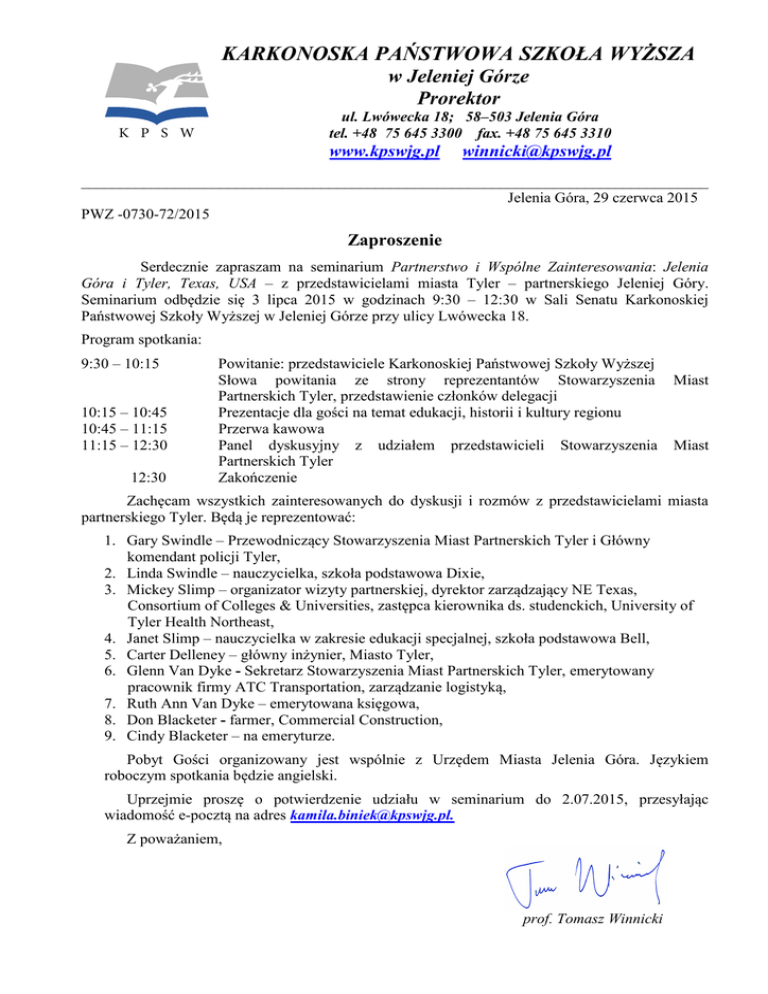 KARKONOSKA PAŃSTWOWA SZKOŁA WYŻSZA w Jeleniej Górze Prorektor ul. Lwówecka 18; 58–503 Jelenia Góra tel. +48 75 645 3300 fax. +48 75 645 3310 www.kpswjg.pl [email protected] _________________________________________________________________________________ Jelenia Góra, 29 czerwca 2015 PWZ -0730-72/2015 Zaproszenie Serdecznie zapraszam na seminarium Partnerstwo i Wspólne Zainteresowania: Jelenia Góra i Tyler, Texas, USA – z przedstawicielami miasta Tyler – partnerskiego Jeleniej Góry. Seminarium odbędzie się 3 lipca 2015 w godzinach 9:30 – 12:30 w Sali Senatu Karkonoskiej Państwowej Szkoły Wyższej w Jeleniej Górze przy ulicy Lwówecka 18. Program spotkania: 9:30 – 10:15 10:15 – 10:45 10:45 – 11:15 11:15 – 12:30 12:30 Powitanie: przedstawiciele Karkonoskiej Państwowej Szkoły Wyższej Słowa powitania ze strony reprezentantów Stowarzyszenia Partnerskich Tyler, przedstawienie członków delegacji Prezentacje dla gości na temat edukacji, historii i kultury regionu Przerwa kawowa Panel dyskusyjny z udziałem przedstawicieli Stowarzyszenia Partnerskich Tyler Zakończenie Miast Miast Zachęcam wszystkich zainteresowanych do dyskusji i rozmów z przedstawicielami miasta partnerskiego Tyler. Będą je reprezentować: 1. Gary Swindle – Przewodniczący Stowarzyszenia Miast Partnerskich Tyler i Główny komendant policji Tyler, 2. Linda Swindle – nauczycielka, szkoła podstawowa Dixie, 3. Mickey Slimp – organizator wizyty partnerskiej, dyrektor zarządzający NE Texas, Consortium of Colleges & Universities, zastępca kierownika ds. studenckich, University of Tyler Health Northeast, 4. Janet Slimp – nauczycielka w zakresie edukacji specjalnej, szkoła podstawowa Bell, 5. Carter Delleney – główny inżynier, Miasto Tyler, 6. Glenn Van Dyke - Sekretarz Stowarzyszenia Miast Partnerskich Tyler, emerytowany pracownik firmy ATC Transportation, zarządzanie logistyką, 7. Ruth Ann Van Dyke – emerytowana księgowa, 8. Don Blacketer - farmer, Commercial Construction, 9. Cindy Blacketer – na emeryturze. Pobyt Gości organizowany jest wspólnie z Urzędem Miasta Jelenia Góra. Językiem roboczym spotkania będzie angielski. Uprzejmie proszę o potwierdzenie udziału w seminarium do 2.07.2015, przesyłając wiadomość e-pocztą na adres [email protected]. Z poważaniem, prof. Tomasz Winnicki