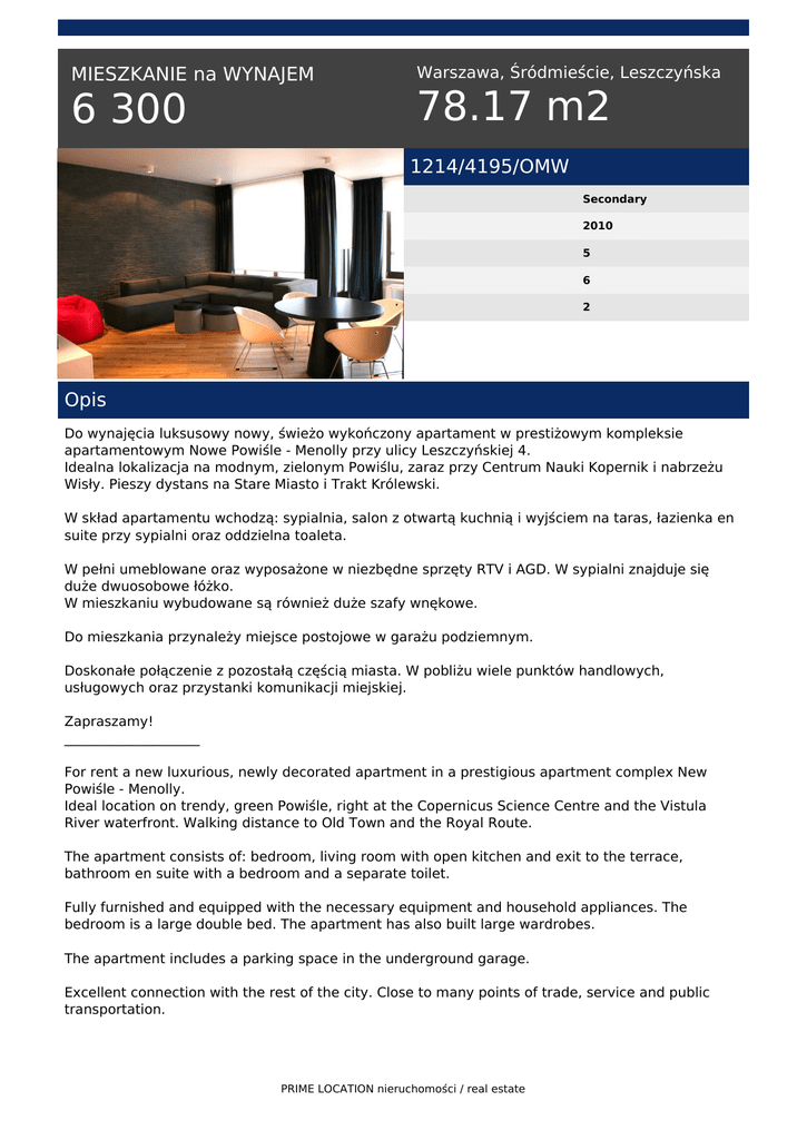 MIESZKANIE na WYNAJEM 6 300 Warszawa, Śródmieście, Leszczyńska 78.17 m2 1214/4195/OMW Secondary 2010 5 6 2 Opis Do wynajęcia luksusowy nowy, świeżo wykończony apartament w prestiżowym kompleksie apartamentowym Nowe Powiśle - Menolly przy ulicy Leszczyńskiej 4. Idealna lokalizacja na modnym, zielonym Powiślu, zaraz przy Centrum Nauki Kopernik i nabrzeżu Wisły. Pieszy dystans na Stare Miasto i Trakt Królewski. W skład apartamentu wchodzą: sypialnia, salon z otwartą kuchnią i wyjściem na taras, łazienka en suite przy sypialni oraz oddzielna toaleta. W pełni umeblowane oraz wyposażone w niezbędne sprzęty RTV i AGD. W sypialni znajduje się duże dwuosobowe łóżko. W mieszkaniu wybudowane są również duże szafy wnękowe. Do mieszkania przynależy miejsce postojowe w garażu podziemnym. Doskonałe połączenie z pozostałą częścią miasta. W pobliżu wiele punktów handlowych, usługowych oraz przystanki komunikacji miejskiej. Zapraszamy! ____________________ For rent a new luxurious, newly decorated apartment in a prestigious apartment complex New Powiśle - Menolly. Ideal location on trendy, green Powiśle, right at the Copernicus Science Centre and the Vistula River waterfront. Walking distance to Old Town and the Royal Route. The apartment consists of: bedroom, living room with open kitchen and exit to the terrace, bathroom en suite with a bedroom and a separate toilet. Fully furnished and equipped with the necessary equipment and household appliances. The bedroom is a large double bed. The apartment has also built large wardrobes. The apartment includes a parking space in the underground garage. Excellent connection with the rest of the city. Close to many points of trade, service and public transportation. PRIME LOCATION nieruchomości / real estate Please do not hesitate to call us and arrange a meeting. Katarzyna Friedel-Udarov tel. +48 604 424 605; +4822 389 75 77 tel. +48 604 424 605 email: [email protected] PRIME LOCATION nieruchomości / real estate Powered by TCPDF (www.tcpdf.org)