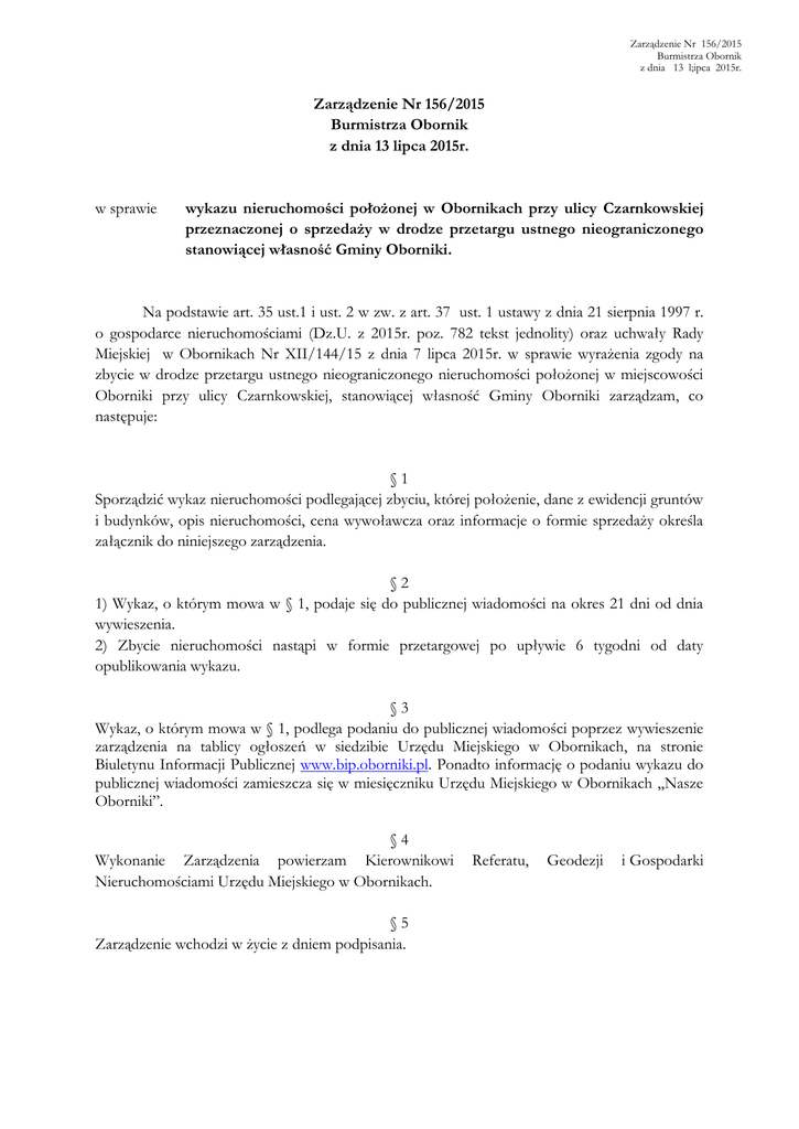 Zarządzenie Nr 156/2015 Burmistrza Obornik z dnia 13 lipca 2015r