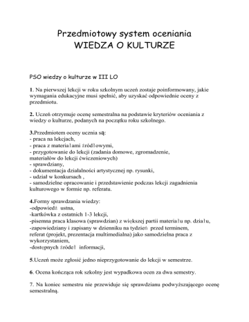 Przedmiotowy system oceniania WIEDZA O KULTURZE PSO wiedzy o kulturze w III LO 1. Na pierwszej lekcji w roku szkolnym uczeń zostaje poinformowany, jakie wymagania edukacyjne musi spełnić, aby uzyskać odpowiednie oceny z przedmiotu. 2. Uczeń otrzymuje ocenę semestralna na podstawie kryteriów oceniania z wiedzy o kulturze, podanych na początku roku szkolnego. 3.Przedmiotem oceny ucznia są: - praca na lekcjach, - praca z materiałami źródłowymi, - przygotowanie do lekcji (zadania domowe, zgromadzenie, materiałów do lekcji ćwiczeniowych) - sprawdziany, - dokumentacja działalności artystycznej np. rysunki, - udział w konkursach , - samodzielne opracowanie i przedstawienie podczas lekcji zagadnienia kulturowego w formie np. referatu. 4.Formy sprawdzania wiedzy: -odpowiedź ustna, -kartkówka z ostatnich 1-3 lekcji, -pisemna praca klasowa (sprawdzian) z większej partii materiału np. działu, -zapowiedziany i zapisany w dzienniku na tydzień przed terminem, referat (projekt, prezentacja multimedialna) jako samodzielna praca z wykorzystaniem, -dostępnych źródeł informacji, 5.Uczeń może zgłosić jedno nieprzygotowanie do lekcji w semestrze. 6. Ocena kończąca rok szkolny jest wypadkowa ocen za dwa semestry. 7. Na koniec semestru nie przewiduje się sprawdzianu podwyższającego ocenę semestralną. 8. Na prośbę ucznia lub jego rodziców (prawnych opiekunów) nauczyciel ustalając ocenę powinien ją uzasadnić. 9. Uczeń ma prawo zgłosić w ciągu semestru 1 nieprzygotowanie. Obejmuje ono odpowiedź ustną lub brak zadania domowego. Nie dotyczy to zapowiedzianych wcześniej lekcji powtórzeniowych, sprawdzianów i prac klasowych. Ocena śródroczna i roczna nie jest średnią arytmetyczną ocen cząstkowych. 10. Wpływ różnych ocen cząstkowych na ocenę śródroczną i końcoworoczną: oceny dydaktyczne: prace klasowe, sprawdziany, wypowiedzi ustne, kartkówki, prezentacja projektów, aktywność – 60% ocena pedagogiczna wspierająca: niewerbalne wytwory pracy, bieżące zadania domowe – 40%. Prace klasowe 1. Nauczyciel jest zobowiązany zapowiedzieć pracę klasową co najmniej 1 tydzień wcześniej. 2. Prace klasowe są obowiązkowe. W każdym semestrze przewiduje się co najmniej 1 prać klasową. 3. jeżeli z przyczyn losowych uczeń nie może napisać pracy klasowej z całą klasą, to powinien to uczynić w terminie uzgodnionym z nauczycielem. W przypadku nieobecności usprawiedliwionej termin zaliczenia wynosi 2 tygodnie od daty napisania pracy klasowej przez klasę, w terminie uzgodnionym z nauczycielem. Przy dłuższej nieobecności ucznia, termin zaliczenia uzgadnia uczeń z nauczycielem. 4. Stosuje się podział na grupy. 5. Nauczyciel jest zobowiązany ocenić i udostępnić uczniom prace klasowe w ciągu 2 tygodni od daty napisania. 6. Prace oceniane są punktowo. Punkty są sumowane i zamieniane na ocenę według następujących wskaźników procentowych: - 0-30% niedostateczny - 31-50% dopuszczający - 51-74% dostateczny - 75-90% dobry - 91-100% bardzo dobry + zadanie dodatkowe – celujący 7. Poprawa prac klasowych jest dobrowolna i uczeń pisze ją w ciągu 2 tygodni od oddania prac, w terminie uzgodnionym z nauczycielem. Uczeń poprawia tylko 1 raz. Obie oceny są tak samo ważne. 8. Jeżeli podczas pracy klasowej uczeń korzysta z niedozwolonych materiałów lub podpowiedzi kolegów, otrzymuje ocenę niedostateczną i traci możliwość poprawy oceny. 9. Sprawdzone i ocenione prace kontrolne nauczyciel przechowuje przez okres 1 roku. Pozostają one do wglądu uczniów , rodziców i prawnych opiekunów. Odpowiedzi ustne 1. Oceniane są na bieżąco z uwzględnieniem indywidualnych możliwości ucznia, zgodnie z wymaganiami na poszczególne oceny. 2. Nauczyciel egzekwuje wiedzę z 3 ostatnich lekcji. 3. Dodatkowe pytania naprowadzające wpływają na obniżenie oceny. Sprawdziany i kartkówki 1. O ilości sprawdzianów i kartkówek decyduje nauczyciel. 2. Zakres materiału: kartkówki – obejmują materiał wyłącznie z ostatniego tematu, piętnastominutowe sprawdziany obejmują zakres materiału z trzech ostatnich lekcji. 3. Nauczyciel ma prawo zrobić sprawdzian i kartkówkę bez zapowiedzi. Ich oceny nie podlegają poprawie. Aktywność na lekcji 1. Nauczyciel ocenia pracę na lekcji. Uczeń gromadzi plusy i minusy, które nauczyciel zamienia na ocenę według następujących zasad: - 3 plusy – bardzo dobry - 3 minusy - niedostateczny Prowadzenie zeszytów przedmiotowych 1. Uczeń zobowiązany jest posiadać zeszyt przedmiotowy i prowadzić go wg wskazań nauczyciela. Każdy brak zeszytu upoważnia nauczyciela do wpisania minusa (-). 2. Zeszyt jest sprawdzany pod względem kompletności notatek, ich poprawności merytorycznej, estetyki i poprawności ortograficznej. Uczeń ma obowiązek uzupełniania notatek za czas nieobecność 3. Uczeń i jego rodzice (prawni opiekunowie) otrzymują informację o Przewidywanym stopniu niedostatecznym (śródrocznym i końcoworocznym) na zasadach określonych w statucie szkoły. Zadawanie i ocena prac domowych i dodatkowych 1. Obowiązkiem ucznia jest systematyczne odrabianie prac domowych. 2. Zadając pracę domową lub zadanie dodatkowe nauczyciel określa wymagania formalne związane z ich wykonaniem, termin oraz sposób ich wykonania. 3. Nauczyciel sprawdza wykonanie wymienionych wyżej prac w określonym terminie. 4. Brak pracy omowej skutkuje ocena niedostateczną. 5. Ocenianie prac może nastąpić natychmiast po upływie terminu ich realizacji lub podczas kontroli zeszytów. 11. Cele edukacyjne nauczania wiedzy o kulturze: ń rozumie treść znaczeniową pojęcia "kultura", relacje kultury z naturą oraz wzajemne stosunki kultury i cywilizacji; ć mapę polskiej kultury, jej wewnętrzne zróżnicowanie; ści narodowe obecne na mapie kulturalnej i potrafi scharakteryzować ich aktywność kulturalną; obserwuje zwłaszcza mniejszości na terenie najbliższego regionu; ć na podstawowe cechy tr