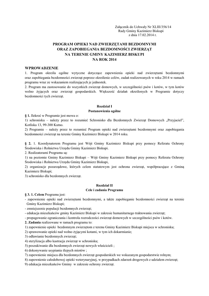 Załącznik do Uchwały Nr XLIII/356/14 Rady Gminy Kazimierz Biskupi z dnia 17.02.2014 r. PROGRAM OPIEKI NAD ZWIERZĘTAMI BEZDOMNYMI ORAZ ZAPOBIEGANIA BEZDOMNOŚCI ZWIERZĄT NA TERENIE GMINY KAZIMIERZ BISKUPI NA ROK 2014 WPROWADZENIE 1. Program określa ogólne wytyczne dotyczące zapewnienia opieki nad zwierzętami bezdomnymi oraz zapobiegania bezdomności zwierząt poprzez określenie celów, zadań realizowanych w roku 2014 w ramach programu wraz ze wskazaniem realizujących je jednostek. 2. Program ma zastosowanie do wszystkich zwierząt domowych, w szczególności psów i kotów, w tym kotów wolno żyjących oraz zwierząt gospodarskich. Większość działań określonych w Programie dotyczy bezdomności tych zwierząt. Rozdział I Postanowienia ogólne § 1. Ilekroć w Programie jest mowa o: 1) schronisku – należy przez to rozumieć Schronisko dla Bezdomnych Zwierząt Domowych „Przyjaciel”, Kotliska 13, 99-300 Kutno. 2) Programie – należy przez to rozumieć Program opieki nad zwierzętami bezdomnymi oraz zapobiegania bezdomności zwierząt na terenie Gminy Kazimierz Biskupi w 2014 roku. § 2. 1. Koordynatorem Programu jest Wójt Gminy Kazimierz Biskupi przy pomocy Referatu Ochrony Środowiska i Rolnictwa Urzędu Gminy Kazimierz Biskupi. 2. Realizatorami Programu są: 1) na poziomie Gminy Kazimierz Biskupi – Wójt Gminy Kazimierz Biskupi przy pomocy Referatu Ochrony Środowiska i Rolnictwa Urzędu Gminy Kazimierz Biskupi, 2) organizacje pozarządowe, których celem statutowym jest ochrona zwierząt, współpracujące z Gminą Kazimierz Biskupi; 3) schronisko dla bezdomnych zwierząt. Rozdział II Cele i zadania Programu § 3. 1. Celem Programu jest: - zapewnienie opieki nad zwierzętami bezdomnymi, a także zapobieganie bezdomności zwierząt na terenie Gminy Kazimierz Biskupi; - zmniejszenie populacji bezdomnych zwierząt; - edukacja mieszkańców gminy Kazimierz Biskupi w zakresie humanitarnego traktowania zwierząt; - propagowanie ograniczania i kontrola rozrodczości zwierząt domowych w szczególności psów i kotów. 2. Zadania realizowane w ramach programu to: 1) zapewnienie opieki bezdomnym zwierzętom z terenu Gminy Kazimierz Biskupi miejsca w schronisku; 2) sprawowanie opieki nad wolno żyjącymi kotami, w tym ich dokarmianie; 3) odławianie bezdomnych zwierząt; 4) sterylizacja albo kastracja zwierząt w schronisku; 5) poszukiwanie dla bezdomnych zwierząt nowych właścicieli ; 6) dokonywanie usypiania ślepych miotów ; 7) zapewnienie miejsca dla bezdomnych zwierząt gospodarskich we wskazanym gospodarstwie rolnym; 8) zapewnienie całodobowej opieki weterynaryjnej, w przypadkach zdarzeń drogowych z udziałem zwierząt; 9) edukacja mieszkańców Gminy w zakresie ochrony zwierząt. Rozdział III Realizacja zadań § 4. Zapewnienie opieki bezdomnym zwierzętom z terenu Gminy Kazimierz Biskupi realizują: 1) Schronisko - na zlecenie Gminy przyjmuje i zapewnia opiekę bezdomnym zwierzętom domowym z terenu Gminy Kazimierz Biskupi zgłaszanych przez Policję lub właściwą komórkę organizacyjną Urzędu Gminy oraz poprzez zapewnienie zwierzętom bezterminowej opieki, w tym weterynaryjnej; 2) organizacje pozarządowe realizujące zadania publiczne obejmujące opiekę nad zwierzętami bezdomnymi. § 5. Sprawowanie opieki nad wolno żyjącymi kotami, w tym ich dokarmianie realizują: 1. Wójt Gminy poprzez: 1) zakup i wydawanie karmy opiekunom społecznym (karmicielom) kotów wolno żyjących oraz ograniczanie ich rozrodczości (usypianie ślepych miotów, sterylizacja na koszt gminy – umowa zlecenie z lekarzem weterynarii); 2) podejmowanie interwencji w sprawach kotów wolno żyjących przy udziale organizacji pozarządowych lub/i przedstawiciela Urzędu; 3) wyszukiwanie i wskazywanie miejsc bezpiecznych zapewniających bezpieczeństwo kotom wolno żyjącym. 2. Organizacje pozarządowe: 1) poprzez realizację zadań publicznych obejmujących opiekę nad kotami wolno żyjącymi oraz podejmowanie interwencji w sprawach kotów wolno żyjących. § 6. Odławianie i transport bezdomnych zwierząt z terenu Gminy Kazimierz Biskupi prowadzić będzie podmiot posiadający wymagane prawem uprawnienia, na podstawie zawartej umowy z Wójtem Gminy Kazimierz Biskupi. W roku 2014 podmiotem, z którym podpisano umowę w zakresie odławiania i transportu bezdomnych zwierząt z: F.U. HERKULES, 95-100 Zgierz, Gdańska 107 § 7. Obligatoryjną sterylizację albo kastrację zwierząt realizuje Schronisko poprzez przeprowadzanie zabiegów sterylizacji i kastracji zwierząt przyjętych do Schroniska, z wyjątkiem zwierząt u których istnieją przeciwwskazania do wykonania tych zabiegów, z uwagi na stan zdrowia i/lub wiek; § 8. Poszukiwanie dla bezdomnych zwierząt nowych właścicieli realizują: 1) Schronisko poprzez prowadzenie działań zmierzających do pozyskiwania nowych właścicieli i oddawania do adopcji bezdomnych zwierząt osobom zainteresowanym i zdolnym zapewnić im należyte warunki bytowania; 2) Wójt Gminy poprzez promocję adopcji zwierząt ze Schroniska; sprawowanie opieki nad bezdomnymi zwierzętami, poprzez dążenie do pozyskania nowych właścicieli np. poprzez umieszczenie ogłoszeń o adopcji na stronie internetowej Urzędu Gminy; prowadzenie akcji adopcyjnych i promocyjnych; 3) Organizacje pozarządowe poprzez prowadzenie akcji adopcyjnych i promocyjnych. § 9. Usypianie ślepych miotów zwierząt realizują: 1) Schronisko poprzez dokonywanie przez lekarza weterynarii zabiegów usypiania ślepych miotów z terenu Gminy Kazimierz Biskupi przebywających w schronisku; 2) Wójt Gminy poprzez zawieranie umów z zakładami leczniczymi dla zwierząt w stosunku do zwierząt bezdomnych. W roku 2014 podpisano umowę z: Całodobowa Lecznica dla zwierząt Lekarz weterynarii - Andrzej Kwiatkowski ul. Słowackiego 6, 62-590 Golina § 10. 1. Wskazanie gospodarstwa rolnego w celu zapewnienia miejsca dla zwierząt gospodarskich następuje na podstawie umowy zawartej pr
