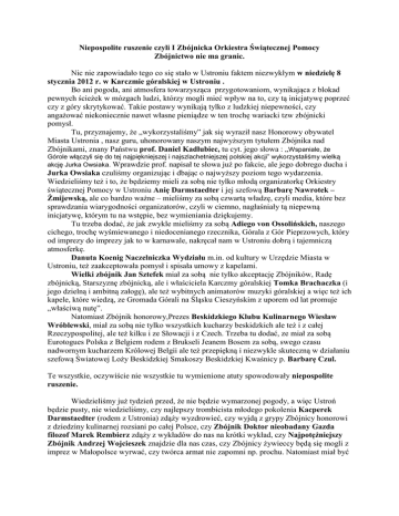 Niepospolite ruszenie czyli I Zbójnicka Orkiestra Świątecznej Pomocy Zbójnictwo nie ma granic. Nic nie zapowiadało tego co się stało w Ustroniu faktem niezwykłym w niedzielę 8 stycznia 2012 r. w Karczmie góralskiej w Ustroniu . Bo ani pogoda, ani atmosfera towarzysząca przygotowaniom, wynikająca z blokad pewnych ścieżek w mózgach ludzi, którzy mogli mieć wpływ na to, czy tą inicjatywę poprzeć czy z góry skrytykować. Takie postawy wynikają tylko z ludzkiej niepewności, czy angażować niekoniecznie nawet własne pieniądze w ten trochę wariacki tzw zbójnicki pomysł. Tu, przyznajemy, że „wykorzystaliśmy” jak się wyraził nasz Honorowy obywatel Miasta Ustronia , nasz guru, uhonorowany naszym najwyższym tytułem Zbójnika nad Zbójnikami, znany Państwu prof. Daniel Kadłubiec, tu cyt. jego słowa : „Wspaniale, że Górole włączyli się do tej najpiękniejszej i najszlachetniejszej polskiej akcji” wykorzystaliśmy wielką akcję Jurka Owsiaka. Wprawdzie prof. napisał te słowa już po fakcie, ale jego dobrego ducha i Jurka Owsiaka czuliśmy organizując i dbając o najwyższy poziom tego wydarzenia. Wiedzieliśmy też i to, że będziemy mieli za sobą nie tylko młodą organizatorkę Orkiestry świątecznej Pomocy w Ustroniu Anię Darmstaedter i jej szefową Barbarę Nawrotek – Żmijewską, ale co bardzo ważne – mieliśmy za sobą czwartą władzę, czyli media, które bez sprawdzania wiarygodności organizatorów, czyli w ciemno, nagłaśniały tą niepewną inicjatywę, którym tu na wstępie, bez wymieniania dziękujemy. Tu trzeba dodać, że jak zwykle mieliśmy za sobą Adiego von Ossolińskich, naszego cichego, trochę wyśmiewanego i niedocenianego rzecznika, Górala z Gór Pieprzowych, który od imprezy do imprezy jak to w karnawale, nakręcał nam w Ustroniu dobrą i tajemniczą atmosferkę. Danuta Koenig Naczelniczka Wydziału m.in. od kultury w Urzędzie Miasta w Ustroniu, też zaakceptowała pomysł i spisała umowy z kapelami. Wielki zbójnik Jan Sztefek miał za sobą nie tylko akceptację Zbójników, Radę zbójnicką, Starszyznę zbójnicką, ale i właściciela Karczmy góralskiej Tomka Brachaczka (i jego dzielną i ambitną załogę), ale też wybitnych animatorów muzyki góralskiej a więc też ich kapele, które wiedzą, ze Gromada Górali na Śląsku Cieszyńskim z uporem od lat promuje „właściwą nutę”. Natomiast Zbójnik honorowy,Prezes Beskidzkiego Klubu Kulinarnego Wiesław Wróblewski, miał za sobą nie tylko wszystkich kucharzy beskidzkich ale też i z całej Rzeczypospolitej, ale też kilku i ze Słowacji i z Czech. Trzeba tu dodać, ze miał za sobą Eurotogues Polska z Belgiem rodem z Brukseli Jeanem Bosem za sobą, swego czasu nadwornym kucharzem Królowej Belgii ale też przepiękną i niezwykle skuteczną w działaniu szefową Światowej Loży Beskidzkiej Smakoszy Beskidzkiej Kwaśnicy p. Barbarę Czul. Te wszystkie, oczywiście nie wszystkie tu wymienione atuty spowodowały niepospolite ruszenie. Wiedzieliśmy już tydzień przed, że nie będzie wymarzonej pogody, a więc Ustroń będzie pusty, nie wiedzieliśmy, czy najlepszy trombicista młodego pokolenia Kacperek Darmstaedter (rodem z Ustronia) zdąży wyzdrowieć, czy wyjdą z grypy Zbójnicy honorowi z dziedziny kulinarnej rozsiani po całej Polsce, czy Zbójnik Doktor nieobadany Gazda filozof Marek Rembierz zdąży z wykładów do nas na krótki wykład, czy Najpotężniejszy Zbójnik Andrzej Wojcieszek znajdzie dla nas czas, czy Zbójnicy żywieccy będą się mogli z imprez w Małopolsce wyrwać, czy twórca armat nie zapomni np. prochu. Natomiast miał być na pewno Najwybitniejszy i Najbarwniejszy Zbójnik Lubo Kubla ze Słowacji co też dodawało nam sił. . Owszem, możemy się teraz przyznać, że osób niepewnych i niezbyt szczerych nie słuchaliśmy i można było odnieść wrażenie, że je lekceważyliśmy, co nie jest do końca prawdą. Przeszkód było oczywiście dużo więcej, chociażby widmo klapy przy licytacji, ale o tym zapomina się, gdy odniesie się sukces. Gdy była plajta – skazanych i wieszanych na przysłowiowym haku za poślednie ziebro byłoby dwóch ☺ Po tym rozbudowanym i nieco emocjonalnym, kwiecistym wstępie, wracamy do konkretów czyli opisu I Zbójnickiej Orkiestry Świątecznej Pomocy. Od godz. 8 rano paliła się watra pod kotłem z wodą firmy „Kubala”. Palić trzeba było ostro, bo od rana jak nie siąpiło to padał deszcz. Od godz. 10 wraz z przyjazdem głównych organizatorów i pierwszych młodych kucharzy zaczęła się krzątania wokół kotła i stoisk gastronomicznych m.in. Leszek Młodzianowski ze www.zbojnickiszlak.pl. O 11 z nagłośnieniem i namiotami przyjechał Zbójnik honorowy Zdzisław Brachaczek. Niespodziewanie pojawiła się TVP Katowice i Najpotężniejszy zbójnik Andrzej Wojcieszek, tryskający jak zwykle energią i dowcipami. Zbigniew Śliwiński właściciel zajazdu „Horolna” przywiózł ze sobą na licytację nie tylko 2,5 m długą i potężną wiosło - łyżkę, którą mieszano największe kotły z kwaśnicą, pieczarkową, żurku i śląskiej parzybrody potwierdzone w Światowej Księdze Rekordów Guinessa., ale też zespół PEPESONG z Żywca, który natychmiast chciał grać i to grać do północy a może i do samego rana ☺ Musieli jednak trochę ostudzić swoje emocje i ochłonąć, bo nie zabrali ze sobą wszystkich kabli i montaż trochę czasu potrwał, ale udało się. W międzyczasie wszyscy panowie pobiegli pod telewizor, by zobaczyć zwycięstwo Justyny Kowalczyk w Tour de Ski. Styl w jakim Justyna wygrała w tym biegu dodał nam wszystkim dodatkową siłę i entuzjazm. Zaraz potem, Zespół Pepesong zaczął grać ostro, ściągając pod karczmę niezbyt licznych w tym dniu spacerowiczów. Pojawiły się więc natychmiast dzieci z puszkami na datki. Doszedł Jacek Piechocki z kamerą oraz młodzi ludzie związani z portalem Nasz Ustroń z Andrzejem