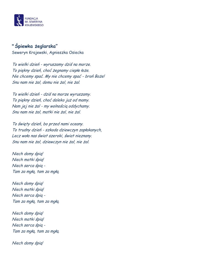 " Śpiewka żeglarska” Seweryn Krajewski, Agnieszka Osiecka To wielki dzień - wyruszamy dziś na morze. To piękny dzień, choć żegnamy ciepłe łoże. Nie chcemy spać. My nie chcemy spać - broń Boże! Snu nam nie żal, domu nie żal, nie żal. To wielki dzień - dziś na morze wyruszamy. To piękny dzień, choć daleko już od mamy. Nam jej nie żal - my wolnością oddychamy. Snu nam nie żal, matki nie żal, nie żal. To święty dzień, bo przed nami oceany. To trudny dzień - szkoda dziewczyn zapłakanych, Lecz woła nas świat szeroki, świat nieznany. Snu nam nie żal, dziewczyn nie żal, nie żal. Niech domy śpią! Niech matki śpią! Niech serca śpią Tam za mgłą, tam za mgłą. Niech domy śpią! Niech matki śpią! Niech serca śpią Tam za mgłą, tam za mgłą. Niech domy śpią! Niech matki śpią! Niech serca śpią Tam za mgłą, tam za mgłą. Niech domy śpią! Niech matki śpią! Niech serca śpią Tam za mgłą, tam za mgłą. Niech domy śpią! Niech matki śpią! Niech serca śpią Tam za mgłą, tam za mgłą. Niech domy śpią! Niech matki śpią! Niech serca śpią Tam za mgłą, tam za mgłą.