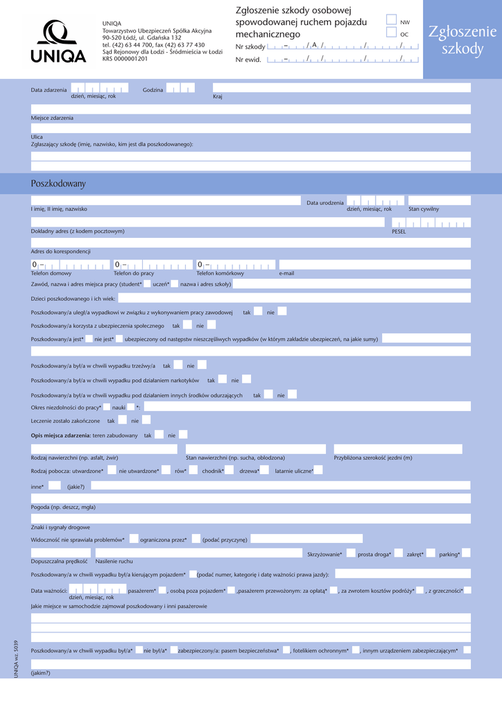 Zg³oszenie szkody osobowej spowodowanej ruchem pojazdu mechanicznego UNIQA Towarzystwo Ubezpieczeñ Spó³ka Akcyjna 90-520 £ódŸ, ul. Gdañska 132 tel. (42) 63 44 700, fax (42) 63 77 430 S¹d Rejonowy dla £odzi - Œródmieœcia w £odzi KRS 0000001201 Data zdarzenia Godzina dzieñ, miesi¹c, rok Nr szkody Nr ewid. NW OC - / A / / / - / / / / Zg³oszenie szkody Kraj Miejsce zdarzenia Ulica Zg³aszaj¹cy szkodê (imiê, nazwisko, kim jest dla poszkodowanego): Poszkodowany Data urodzenia I imiê, II imiê, nazwisko Stan cywilny dzieñ, miesi¹c, rok Dok³adny adres (z kodem pocztowym) PESEL Adres do korespondencji 0 0 0 Telefon domowy Telefon do pracy Telefon komórkowy Zawód, nazwa i adres miejsca pracy (student* uczeñ* e-mail nazwa i adres szko³y) Dzieci poszkodowanego i ich wiek: Poszkodowany/a uleg³/a wypadkowi w zwi¹zku z wykonywaniem pracy zawodowej Poszkodowany/a korzysta z ubezpieczenia spo³ecznego Poszkodowany/a jest* nie jest* tak tak nie ubezpieczony od nastêpstw nieszczêœliwych wypadków (w którym zak³adzie ubezpieczeñ, na jakie sumy) Poszkodowany/a by³/a w chwili wypadku trzeŸwy/a tak nie Poszkodowany/a by³/a w chwili wypadku pod dzia³aniem narkotyków tak nie Poszkodowany/a by³/a w chwili wypadku pod dzia³aniem innych œrodków odurzaj¹cych Okres niezdolnoœci do pracy* Leczenie zosta³o zakoñczone nauki tak nie nie tak nie Rodzaj nawierzchni (np. asfalt, ¿wir) inne* tak *: Opis miejsca zdarzenia: teren zabudowany Rodzaj pobocza: utwardzone* nie Stan nawierzchni (np. sucha, oblodzona) nie utwardzone* rów* chodnik* drzewa* Przybli¿ona szerokoœæ jezdni (m) latarnie uliczne* (jakie?) Pogoda (np. deszcz, mg³a) Znaki i sygna³y drogowe Widocznoœæ nie sprawia³a problemów* ograniczona przez* (podaæ przyczynê) Skrzy¿owanie* Dopuszczalna prêdkoœæ Poszkodowany/a w chwili wypadku by³/a kieruj¹cym pojazdem* Data wa¿noœci: prosta droga* zakrêt* parking* Nasilenie ruchu dzieñ, miesi¹c, rok pasa¿erem* (podaæ numer, kategoriê i datê wa¿noœci prawa jazdy): , osob¹ poza pojazdem* ,pasa¿erem przewo¿onym: za op³at¹* , za zwrotem kosztów podró¿y* , z grzecznoœci* UNIQA wz. S039 Jakie miejsce w samochodzie zajmowa³ poszkodowany i inni pasa¿erowie Poszkodowany/a w chwili wypadku by³/a* (jakim?) nie by³/a* zabezpieczony/a: pasem bezpieczeñstwa* , fotelikiem ochronnym* , innym urz¹dzeniem zabezpieczaj¹cym* Szczegó³owy opis przebiegu zdarzenia oraz szkic sytuacyjny Odniesione obra¿enia: Uszkodzenia cia³a istniej¹ce przed wypadkiem: Choroby istniej¹ce przed wypadkiem: * w³aœciwe zakreœliæ Uszkodzone mienie (kiedy kupione i za jak¹ kwotê): Kiedy (data, godz.), gdzie i kto udzieli³ pierwszej pomocy bezpoœrednio po wypadku: tak Poszkodowany/a przebywa³/a w szpitalu, klinice itp.: Powiadomiono policjê: tak nie Data nie dzieñ, miesi¹c, rok Data zdarzenia dzieñ, miesi¹c, rok Godzina (jak d³ugo?) Która jednostka: Godzina Kto zosta³ uznany winnym: Sprawca ukarany mandatem: tak nie Sprawê rozpatruje S¹d Grodzki: tak nie Prokuratura: tak nie S¹d: tak nie Adres S¹du Grodzkiego, prokuratury lub s¹du Szczegó³owe dane œwiadków zdarzenia (lub innych uczestników): W³aœciciel/e pojazdu sprawcy imiona, nazwiska lub nazwy firm Adres zamieszkania 0 0 0 Telefon domowy Telefon do pracy Telefon komórkowy Polisa OC seria Okres wa¿noœci od nr e-mail zawarta w dzieñ, miesi¹c, rok do dzieñ, miesi¹c, rok Kieruj¹cy (sprawca) w trakcie zdarzenia imiê, nazwisko Adres zamieszkania 0 0 0 Telefon domowy Telefon do pracy Telefon komórkowy Kieruj¹cy by³ trzeŸwy: tak* Kieruj¹cy lub w³aœciciel pojazdu jest* nie* nie wiem* nie jest* e-mail Rodzaj i marka pojazdu sprawcy: osob¹ obc¹ dla poszkodowanego (podaæ stopieñ pokrewieñstwa lub znajomoœci): Oœwiadczam, ¿e powy¿sze informacje poda³em/am zgodnie z prawd¹ i najlepsz¹ wiedz¹. * Potwierdzam zgodnoœæ podpisu miejscowoœæ, data i podpis zg³aszaj¹cego szkodê data, piecz¹tka i podpis przyjmuj¹cego zg³oszenie szkody nazwa i nr dowodu to¿samoœci (PESEL) w³aœciwe zakreœliæ