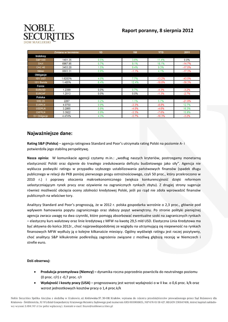 Raport poranny, 8 sierpnia 2012 Najważniejsze dane: Rating S&P (Polska) – agencja ratingowa Standard and Poor’s utrzymała rating Polski na poziomie A- i potwierdziła jego stabilną perspektywę. Nasza opinia: W komunikacie agencji czytamy m.in.: „według naszych kryteriów, postrzegamy monetarną elastyczność Polski oraz dążenie do trwałego zredukowania deficytu budżetowego jako siły”. Agencja nie wyklucza podwyżki ratingu w przypadku szybszego ustabilizowania państwowych finansów (spadek długu publicznego w relacji do PKB poniżej pierwszego progu ostrożnościowego, czyli 50 proc., który przekroczono w 2010 r.) i poprawy otoczenia makroekonomicznego (większa konkurencyjność dzięki reformom uelastyczniającym rynek pracy oraz ożywienie na zagranicznych rynkach zbytu). Z drugiej strony sugeruje również możliwość obcięcia oceny zdolności kredytowej Polski, jeśli po rząd nie zdoła wprowadzić finansów publicznych na właściwe tory. Analitycy Standard and Poor’s prognozują, że w 2012 r. polska gospodarka wzrośnie o 2,3 proc., głównie pod wpływem hamowania popytu zagranicznego oraz słabszy popyt wewnętrzny. Po stronie polityki pieniężnej agencja zwraca uwagę na dwa czynniki, które pomogą absorbować ewentualne szoki na zagranicznych rynkach – elastyczny kurs walutowy oraz linie kredytową z MFW na kwotę 29,5 mld USD. Elastyczna Linia Kredytowa ma być aktywna do końca 2012r., choć najprawdopodobniej ze względu na utrzymującą się niepewność na rynkach finansowych MFW wydłuży ją o kolejne kilkanaście miesięcy. Ogólny wydźwięk ratingu jest raczej pozytywny, choć analitycy S&P kilkukrotnie podkreślają zagrożenia związane z możliwą głębszą recesję w Niemczech i strefie euro. Dziś obserwuj: Produkcja przemysłowa (Niemcy) – dynamika roczna poprzednio powróciła do neutralnego poziomu (0 proc. r/r) z -0,7 proc. r/r Wydajność i koszty pracy (USA) – prognozowany jest wzrost wydajności o w II kw. o 0,6 proc. k/k oraz wzrost jednostkowych kosztów pracy o 1,4 proc.k/k Analiza techniczna: GPW WIG20 Po udanym domknięciu luki bessy z połowy lipca indeks kontynuuje dynamiczny ruch w górę. Od 25 lipca WIG20 pokonał dystans ponad 150 pkt. i w najbliższych dniach do głosu mogą dojść inwestorzy realizujący zyski. Na wysokości 2290 pkt. – 2300 pkt. koncentrują się dwa poziomy oporu, które mogą przemawiać za takim scenariuszem: lokalny szczyt z początku lipca oraz średnioterminowa linia trendu spadkowego. Pozytywnym sygnałem jest zwrócenie się w górę średniej kroczącej z 50 sesji. Atrakcyjnych punktów wejścia na rynku można będzie szukać w jej okolicy (ok. 2200 pkt.). Netia Niewielka korekta w ciągu ostatnich dwóch tygodni uformowała krótkotreminową linię trendu spadkowego. Jej przebicie powinno otworzyć drogę do pierwszego istotnego oporu leżącego w okolicy 6,10 PLN. Ustawienie zlecenia obronnego poniżej 5,80 PLN daje transakcję o atrakcyjnym stosunku potencjalnego zysku do ryzyka. Za kontynuacją trendu wzrostowego w średnim terminie przemawia korzystny układ średnich z 20, 50 i 200 sesji. Tauron Średnie kroczące z 20 i 50 sesji zwróciły się ku górze i są o krok od wskazania sygnału kupna. Podczas wczorajszej sesji kurs wybił się powyżej średnioterminową linię trendu spadkowego poprowadzoną przez wierzchołki z lutego i czerwca. Takie zachowanie kursu wskazuje na możliwość domknięcia luki bessy z końca czerwca. Pierwszym poziomem docelowym są ostatnie lokalne szczyty (ok. 4,80 PLN). Analiza techniczna: Waluty EUR/GBP Kurs dotarł do ciekawego miejsca przy którym ma szansę zakończyć korektę za czym przemawiać mogą: - równość ostatnich korekt (zielone prostokąty) - 50% ostatniego impulsu spadkowego - opór wynikający z przebitego dołka z 15 i 16 maja (pomarańczowa linia) - linia trendu spadkowego - dotarcie do okolic górnej wstęgi Bollingera Pierwszym poziomem do którego kurs może zmierzać jest 0,7836 (61,8% ostatniej korekty). Negacją powyższego scenariusza byłoby rozszerzenie korekty i trwałe wybicie linii trendu spadkowego. USD/PLN Kurs zareagował na wspomnianą w poprzedniej analizie linię trendu wzrostowego przy której wyrysował formację objęcia hossy i obecnie ma szansę na kontynuację wzrostów do okolic 3,3191-3256, przy których znajdują się najbliższe punkty oporu wynikające z wcześniej przebitych dołków (zielona strefa). W tych okolicach warto szukać potencjalnych pro spadkowych sygnałów, gdyż jest to także miejsce równości ostatnich korekt (niebieskie prostokąty). Sygnałem do silniejszego umocnienia się złotego byłoby dopiero silne przebicie wspomnianej linii trendu spadkowego, która obecnie stanowi najbliższy punkt wsparcia. Departament Analiz Rynkowych Noble Securities S.A. Najważniejsze wydarzenia, Analiza techniczna – GPW: Łukasz Wróbel , Główny Analityk [email protected] Tel: +48 600 942 105 Analiza techniczna – waluty: Dominik Łebek, Departament Rynków Zagranicznych [email protected] Tel: +48 22 212 54 35 Jeżeli nie życzą sobie Państwo otrzymywać codziennego Przeglądu Rynków Noble Securities S.A., prosimy o odesłanie pustego maila z tematem "Wypisz_mnie". Niniejsze opracowanie jest jedynie materiałem informacyjnym do użytku odbiorcy. Materiał został przygotowany z należytą starannością i rzetelnością, na podstawie ogólnodostępnych informacji, ale ani autor, ani Noble Securities S.A. nie gwarantują jego kompletności i dokładności. Wszystkie opinie i prognozy przedstawione w tym opracowaniu są jedynie wyrazem opinii autora (autorów) w dniu publikacji i i nie są to opinie czy prognozy Noble Securities S.A., a opinie te lub prognozy mogą ulec zmianie bez zapowiedzi. Materiał nie został sporządzony zgodnie z wymogami określonymi w Rozporządzeniu Ministra Finansów z dnia 19 października 2005r. w sprawie informacji stanowiących rekomendacje doty