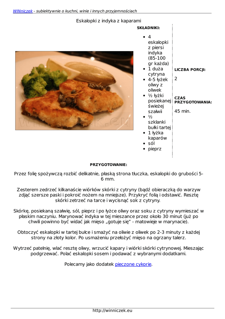 WINniczek - subiektywnie o kuchni, winie i innych przyjemnościach Eskalopki z indyka z kaparami SKŁADNIKI: 4 eskalopki z piersi indyka (85-100 gr każda) 1 duża cytryna 4-5 łyżek oliwy z oliwek ½ łyżki posiekanej świeżej szałwii ½ szklanki bułki tartej 1 łyżka kaparów sól pieprz LICZBA PORCJI: 2 CZAS PRZYGOTOWANIA: 45 min. PRZYGOTOWANIE: Przez folię spożywczą rozbić delikatnie, płaską strona tłuczka, eskalopki do grubości 56 mm. Zesterem zedrzeć kilkanaście wiórków skórki z cytryny (bądź obieraczką do warzyw zdjąć szersze paski i pokroić nożem na mniejsze). Przykryć folią i odstawić. Resztę skórki zetrzeć na tarce i wycisnąć sok z cytryny. Skórkę, posiekaną szałwię, sól, pieprz i po łyżce oliwy oraz soku z cytryny wymieszać w płaskim naczyniu. Marynować indyka w tej mieszance przez około 30 minut (już po chwili powinno być widać jak mięso „gotuje się” - matowieje w marynacie). Obtoczyć eskalopki w tartej bułce i smażyć na oliwie z oliwek po 2-3 minuty z każdej strony na złoty kolor. Po usmażeniu przełożyć mięso na ogrzany talerz. Wytrzeć patelnię, wlać resztę oliwy, wrzucić kapary i wiórki skórki cytrynowej. Mieszając podgrzewać. Polać eskalopki sosem i podawać z wybranymi dodatkami. Polecamy jako dodatek pieczone cykorie. http://winniczek.eu WINniczek - subiektywnie o kuchni, winie i innych przyjemnościach „Wyśmienita Kuchnia Francuska” Carole Clemente i Elizabeth Wolf-Cohen http://winniczek.eu