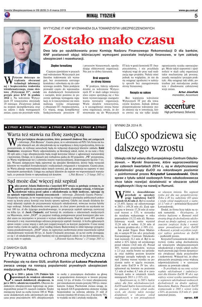 Gazeta Ubezpieczeniowa nr 09 (829) 3–9 marca 2015 www.gu.com.pl MINĄŁ TYDZIEŃ 5 WYTYCZNE IT KNF WYZWANIEM DLA TOWARZYSTW UBEZPIECZENIOWYCH Zostało mało czasu Dwa lata po opublikowaniu przez Komisję Nadzoru Finansowego Rekomendacji D dla banków, KNF postanowił objąć bliźniaczymi wymogami pozostałe instytucje finansowe, w tym zakłady ubezpieczeń i reasekuracji. Zbędne formalizmy ytyczne dotyczące zarządzania obszarami technologii informacyjnej i bezpieczeństwa środowiska teleinformatycznego, zwane skrótowo „Wytycznymi IT”, zostały przyjęte przez KNF 16 grudnia 2014 r. Na wdrożenie Wytycznych IT towarzystwa otrzymały 24 miesiące. Zważywszy jednak na stopień skomplikowania oraz na zakres i skalę wymaganych zmian, czasu nie pozostało wiele. W Częstym zjawiskiem w pracach nad wdrożeniem Wytycznych jest literalne traktowanie ich wymagań, bez zrozumienia szerszego kontekstu i odwołania się do całościowego modelu. Takie podejście prowadzi często do wprowadzania dodatkowych formalizmów i narzędzi, które pomimo że pozornie spełniają wymagania regulacji, to w rzeczywistości nie minimalizują ryzyka związanego z obszarami IT i bezpieczeństwa. Co więcej, mogą komplikować funkcjonowanie procesów IT i procesów biznesowych, upośledzając efektywność organizacji. Nie jest to dobry kierunek. Brak wsparcia ze strony biznesu W praktyce, liderzy odpowiedzialni za wdrożenie Wytycznych IT w skali całego towarzystwa często spotykają się z brakiem wystarczającego zaangażowania wewnątrz organizacji. Wiele działów towarzystwa, a w szczególności strona biznesowa organizacji, uważa, że dostosowanie się do Wytycznych ● Z PRASY ● Z PRASY ● Z PRASY ● Z PRASY ● Z PRASY ● Z PRASY ● Z PRASY Warta też stawia na flotę zastępczą arta jest kolejnym ubezpieczycielem, który postanowił zbudować flotę aut zastępczych – informuje „Puls Biznesu”. Gazeta pisze, że w odróżnieniu od PZU SA firma nie kupiła własnych aut, ale zdecydowała się na współpracę z dużą wypożyczalnią, która zagwarantowała, że wybrane samochody będą do wyłącznej dyspozycji klientów zakładu. Rafał Stankiewicz, wiceprezes Warty odpowiedzialny za likwidację szkód, mówi, że na razie z floty 40 opli astra z logo ubezpieczyciela będą mogli korzystać klienci z aglomeracji warszawskiej i katowickiej. Dodaje, że w planach jest rozbudowa parku do 80 pojazdów. „PB” przypomina, że Warta współpracuje też z czterema innymi wypożyczalniami, dysponującymi łącznie 5 tys. aut. Wozami zastępczymi będą zajmować się specjalni likwidatorzy, którzy będą wyręczali klientów we wszelkich formalnościach i rozliczeniach związanych z wynajmem. Gazeta pisze, że Warta planuje wprowadzenie także innych nowości, jak np. gwarancja na naprawy w sieci warsztatów partnerskich. Usługa ma zachęcić klientów do napraw we wspomnianych warsztatach, co pomoże firmie w optymalizacji ich kosztów. („Puls Biznesu” z 25 lutego 2015 r.) W Sąd może dać więcej niż szpital adca prawny Jolanta Budzowska z kancelarii BFP uważa za patologię systemu to, że państwo godzi się na ponoszenie podwójnych kosztów, akceptując sytuację, w której poszkodowani walczą przed sądem o odszkodowania za błędy medyczne, opierając się na opiniach wojewódzkich komisji orzeczniczych – informuje „Dziennik Gazeta Prawna”. Ekspertka wskazuje, że we wspomnianej na wstępie sytuacji z pieniędzy publicznych pokrywane są koszty pracy komisji oraz koszty sprawy sądowej. Gdyby zaś zasady działania komisji skłaniały szpitale do przyznawania wyższych odszkodowań, wówczas można byłoby tego uniknąć. Jolanta Budzowska mówi gazecie, że choć prawo pozwala na uzyskanie nawet 100 tys. zł dla żyjącego poszkodowanego, to propozycje szpitali opiewają zazwyczaj na kilka tys. zł. Jacek Chojnacki, szef komisji ds. orzekania o zdarzeniach medycznych na Mazowszu, mówi „DGP”, że pacjenci traktują postępowanie przed komisjami jako sondaż szans na zwycięstwo w procesie o wyższe odszkodowanie. Stąd też nawet 40% poszkodowanych z woj. mazowieckiego odrzuca propozycje szpitali i komisji. A liczba zgłaszanych spraw rośnie i coraz więcej z nich jest rozpatrywanych na korzyść pacjentów. Coraz mniej spraw trafia z kolei do sądów, choć według Jolanty Budzowskiej to efekt lepszego przygotowania poszkodowanych. „DGP” pisze, że najwyższe zaoferowane przez mazowiecki szpital odszkodowanie wyniosło 80 tys. zł. Jacek Chojnacki przyznaje, że są też osoby domagające się 1 zł odszkodowania, gdyż bardziej niż na pieniądzach zależy im na dowiedzeniu się, co się stało w szpitalu. („Dziennik Gazeta Prawna” z 25 lutego 2015 r.) R Z DANYCH GUS Prywatna ochrona medyczna Powołując się na dane GUS, analityk Bankier.pl Łukasz Piechowiak zwraca uwagę na rosnącą popularność prywatnych ubezpieczeń medycznych w Polsce. ile w 2010 r. jedynie 3,9% Polaków było uprawnionych do świadczeń zdrowotnych w ramach dodatkowych ubezpieczeń, to już w 2013 r. odsetek ten wynosił 6%. Obecnie dodatkowym ubezpieczeniem legitymuje się prawdopodobnie ponad 8% naszych rodaków. Średni miesięczny koszt na osobę wynosi 100 zł. Większość dodatkowych polis zdrowotnych jest opłacana przez pracodawców. 60% ubezpieczonych O to osoby z przeciętnym dochodem na głowę w gospodarstwie domowym w kwocie przynajmniej 1,6 tys. zł brutto. Co trzeci ubezpieczony jest mieszkańcem miasta powyżej 500 tys. mieszkańców. Łukasz Piechowiak zwraca uwagę, że wg danych GUS gospodarstwa domowe wydają bezpośrednio na ochronę zdrowia 25 mld zł rocznie (średnio 60 zł mies./os). Z tej kwoty 70% to wydatki na leki i artykuły medyczne. ■ IT leży w gestii komórek IT i bezpieczeństwa, i nie przykłada większej wagi do prac nad realizacją tego projektu. Należy mieć jednak na względzie, że nie da się osiągnąć zgodności w nale