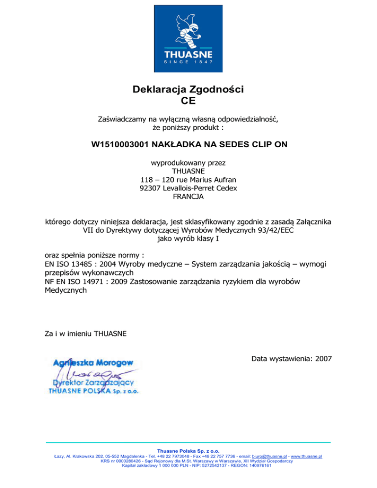 Deklaracja Zgodności CE Zaświadczamy na wyłączną własną odpowiedzialność, że poniższy produkt : W1510003001 NAKŁADKA NA SEDES CLIP ON wyprodukowany przez THUASNE 118 – 120 rue Marius Aufran 92307 Levallois-Perret Cedex FRANCJA którego dotyczy niniejsza deklaracja, jest sklasyfikowany zgodnie z zasadą Załącznika VII do Dyrektywy dotyczącej Wyrobów Medycznych 93/42/EEC jako wyrób klasy I oraz spełnia poniższe normy : EN ISO 13485 : 2004 Wyroby medyczne – System zarządzania jakością – wymogi przepisów wykonawczych NF EN ISO 14971 : 2009 Zastosowanie zarządzania ryzykiem dla wyrobów Medycznych Za i w imieniu THUASNE Data wystawienia: 2007 Thuasne Polska Sp. z o.o. Łazy, Al. Krakowska 202, 05-552 Magdalenka - Tel. +48 22 7973048 - Fax +48 22 757 7736 - email: [email protected] - www.thuasne.pl KRS nr 0000280426 - Sąd Rejonowy dla M.St. Warszawy w Warszawie, XII Wydział Gospodarczy Kapitał zakładowy 1 000 000 PLN - NIP: 5272542137 - REGON: 140976161