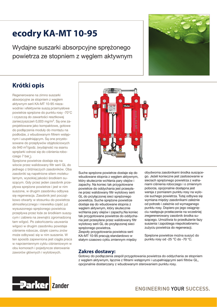 ecodry KA-MT 10-95 Wydajne suszarki absorpcyjne sprężonego powietrza ze stopniem z węglem aktywnym Krótki opis Regenerowane na zimno suszarki absorpcyjne ze stopniem z węglem aktywnym serii KA-MT 10-95 niezawodnie i efektywnie suszą przemysłowe powietrze sprężone do punktu rosy -70°C i czyszczą do zawartości resztkowej zanieczyszczeń 0,003 mg/m³. Są one zaprojektowane jako kompaktowe, gotowe do podłączenia moduły do montażu na podłodze, z wbudowanym filtrem wstępnym i uzupełniającym. Są one przystosowane do przepływów objętościowych do 940 m³/godz. (wydajność na ssaniu spręźarki odnosi się do ciśnienia roboczego 7 bare). Sprężone powietrze dostaje się na wlocie przez walidowany filtr serii GL do jednego z bliźniaczych zasobników. Oba zasobniki są napełnione sitem molekularnym, wysokiej jakości środkiem suszącym. Gdy przez jeden zasobnik przepływa sprężone powietrze i jest w nim suszone, w drugim zasobniku odbywa się regeneracja. Zasobnik jest początkowo otwarty w stosunku do powietrza atmosferycznego i niewielka część już wysuszonego sprężonego powietrza przepływa przez łoże ze środkiem suszącym i zabiera na zewnątrz zgromadzoną tam wilgoć. Po zakończeniu usuwania wilgoci w drugim zasobniku powstaje ciśnienie robocze, dzięki czemu znów może odbywać się w nim suszenie. W ten sposób zapewniona jest ciągła praca w naprzemiennym cyklu ciśnieniowym w obu komorach i pojedyncze sterowanie zaworów głównych i wylotowych. Suche sprężone powietrze dostaje się do wbudowane stopnia z węglem aktywnym, który skutecznie wchłania pary olejów i zapachy. Na koniec tak przygotowane powietrze do oddychania jest przesyłane przez walidowany filtr wylotowy serii GL do przyłączonej sieci sprężonego powietrza. Suche sprężone powietrze dostaje się do wbudowane stopnia z węglem aktywnym, który skutecznie wchłania pary olejów i zapachy.Na koniec tak przygotowane powietrze do oddychania jest przesyłane przez walidowany filtr wylotowy serii GL do przyłączonej sieci sprężonego powietrza. Zespoły przygotowania powietrza serii KA-MT 10-95 pracują standardowo w stałym czasowo cyklu zmiennym między obydwoma zasobnikami środka suszącego. Jeżeli konieczne jest zastosowanie w sieciach sprężonego powietrza z wahaniami ciśnienia roboczego i o zmiennym poborze, opcjonalnie dostępna jest wersja z pomiarem punktu rosy na wylocie suchego powietrza. Tutaj odbywa się wymiana między zasobnikami zależnie od potrzeb i zależnie od wymaganego punktu rosy. Dopiero po jego osiągnięciu następuje przełaczenie na wcześniej zregerenerowany zasobnik środka suszącego. Umożliwia to przedłużenie fazy suszenia i zapobiega niepotrzebnemu zużyciu powietrza do regeneracji. Sprężone powietrze można suszyć do punktu rosy od -25 °C do -70 °C. Zakres dostawy: Gotowy do podłączenia zespół przygotowania powietrza do oddychania ze stopniem z węglem aktywnym, łącznie z filtrami wstępnymi i uzupełniającymi serii filtrów GL, opcjonalnie dostarczany z wbudowanym sterowaniem punktu rosy. Dane techniczne produktu Zespół przygotowania powietrza serii ecodry KA-MT 10-95 Dane katalogowe i dane wydajności Model Nr katalogowy Moc1) w m3/h Średnica znamionowa2) Filtr wstępny Filtr uzupełniający Ciśnienie znamionowe w barach Temperatura znamionowa w °C KA-MT 10 K10/16DA2-G230M 105 1 GL9XLD GL9ZLDH 16 50 KA-MT 15 K15/16DA2-G230M 145 1 GL9XLD GL9ZLDH 16 50 KA-MT 20 K20/16DA2-G230M 200 1 GL9XLD GL9ZLDH 16 50 KA-MT 25 K25/16DA2-G230M 255 1 1/2 GL11XLD GL11ZLDH 16 50 KA-MT 35 K35/16DA2-G230M 350 1 1/2 GL11XLD GL11ZLDH 16 50 KA-MT 45 K45/16DA2-G230M 420 1 1/2 GL12XLD GL12ZLDH 16 50 KA-MT 60 K60/16DA2-G230M 620 2 GL13XLD GL13ZLDH 16 50 KA-MT 75 K75/16DA2-G230M 750 2 GL13XLD GL13ZLDH 16 50 KA-MT 95 K95/16DA2-G230M 940 2 1/2 GL14XLD GL14ZLDH 16 50 1) m³ w odniesieniu do 1 bara i 20 °C; w odniesieniu do mocy zasilania sprężarki, sprężanie do 7 barów i 35 °C temperatury wejściowej suszarki przy 100 % wilgotności względnej; do punktów rosy od -25 do -40 °C. 2) w odniesieniu do DIN ISO 228 (BSP-P). Zakres zastosowań Miejsce ustawienia W pomieszczeniach zamkniętych bez temperatur poniżej zera C, w nieagresywnej atmosferze Temperatura otoczenia 1,5 do 50 °C Temperatura wejściowa sprężonego powietrza 25 do 50 °C Ciśnienie robocze 5 do 16 barów Medium przepływowe Sprężone powietrze i azot w postaci gazowej Opcjonalnie zamontowany czujnik punktu rosy ZHM100 -40 °C ustawiony fabrycznie; ustawiany w menu od -25 do -70 °C w krokach co 5 stopni. Ciśnienie punktu rosy w odniesieniu do 7 barów Połączenie elektryczne Standardowe napięcie zasilania 230 V, 50-60 Hz Klasa ochrony IP65 Materiały Filtr Patrz dane techniczne produktów filtr typu GL XL i GL ZL Zbiornik Normalna stal, spawana Blok zaworów Aluminium Orurowanie Stal, ocynkowana Uszczelki NBR Środek suszący 100% sito molekularne (środek suszący), 100% węgiel aktywny (środek czyszczący) Dopuszczenia dla urządzeń ciśnieniowych EU Dopuszczenie do grupy cieczy 2 zgodnie z dyrektywą w sprawie urządzeń ciśnieniowych 97/23/WE, moduł B+D: Wielkość KA-MT 10 do 35 zgodnie z kategorią II; wielkośćKA-MT 45 do 95 zgodnie z kategorią III. AUS AS1210 GUS TR (dawniej GOST-R) Dane techniczne produktu Zespół przygotowania powietrza serii ecodry KA-MT 10-95 Wymiary (mm) i masy (kg) Model A B C D E Masa KA-MT 10 1170 1420 490 1070 1070 161 KA-MT 15 1170 1750 490 1320 1320 193 KA-MT 20 970 1530 490 1170 1170 193 KA-MT 25 970 1760 530 1320 1320 234 KA-MT 35 1260 1810 585 1320 1320 283 KA-MT 45 1290 1820 605 1320 1320 334 KA-MT 60 1350 1870 635 1320 1320 428 KA-MT 75 1500 2000 635 1515 1515 555 KA-MT 95 1550 2020 670 1515 1515 698 C A B E D Zapewnienie jakości Konstrukcja/produkcja DIN EN ISO 9001, DIN EN ISO 14001 Współczynniki korekcyjne f zgodnie z rzeczywistym minimalnym ciśnieniem zakładowym w bare Dla punktu rosy -25°C i -40°C Temperatura na