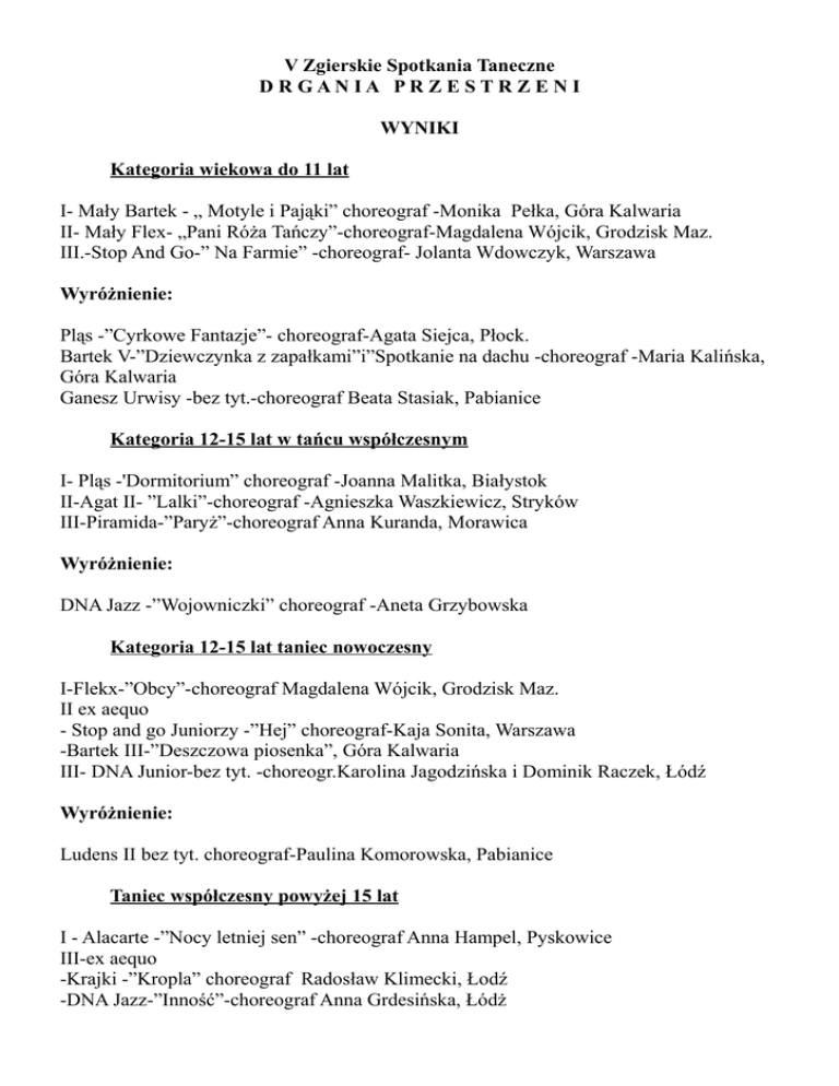 V Zgierskie Spotkania Taneczne DRGANIA PRZE STRZ ENI WYNIKI Kategoria wiekowa do 11 lat I- Mały Bartek - „ Motyle i Pająki” choreograf -Monika Pełka, Góra Kalwaria II- Mały Flex- „Pani Róża Tańczy”-choreograf-Magdalena Wójcik, Grodzisk Maz. III.-Stop And Go-” Na Farmie” -choreograf- Jolanta Wdowczyk, Warszawa Wyróżnienie: Pląs -”Cyrkowe Fantazje”- choreograf-Agata Siejca, Płock. Bartek V-”Dziewczynka z zapałkami”i”Spotkanie na dachu -choreograf -Maria Kalińska, Góra Kalwaria Ganesz Urwisy -bez tyt.-choreograf Beata Stasiak, Pabianice Kategoria 12-15 lat w tańcu współczesnym I- Pląs -'Dormitorium” choreograf -Joanna Malitka, Białystok II-Agat II- ”Lalki”-choreograf -Agnieszka Waszkiewicz, Stryków III-Piramida-”Paryż”-choreograf Anna Kuranda, Morawica Wyróżnienie: DNA Jazz -”Wojowniczki” choreograf -Aneta Grzybowska Kategoria 12-15 lat taniec nowoczesny I-Flekx-”Obcy”-choreograf Magdalena Wójcik, Grodzisk Maz. II ex aequo - Stop and go Juniorzy -”Hej” choreograf-Kaja Sonita, Warszawa -Bartek III-”Deszczowa piosenka”, Góra Kalwaria III- DNA Junior-bez tyt. -choreogr.Karolina Jagodzińska i Dominik Raczek, Łódź Wyróżnienie: Ludens II bez tyt. choreograf-Paulina Komorowska, Pabianice Taniec współczesny powyżej 15 lat I - Alacarte -”Nocy letniej sen” -choreograf Anna Hampel, Pyskowice III-ex aequo -Krajki -”Kropla” choreograf Radosław Klimecki, Łodź -DNA Jazz-”Inność”-choreograf Anna Grdesińska, Łódż Wyróżnienie: KIE-”Drzewo życia”- Katarzyna Korzeniewska Killo, Łęczyca Taniec nowoczesny powyżej 15 lat I-DNA CREW-bez tyt. choreograf-Klaudia Olszewska i Karolina Jagodzińska, Łodź II- Ludens I- bez tyt. choreograf-Paulina Komorowska, Pabianice. III-Sparta Crew Łódź -choreografia zbiorowa, Łódź Wyróżnienie : Projekt Siedem -bez tyt. choreograf -praca grupowa, Białystok FROM THE TOP CREW-” Fire”-choreograf -Sylwia Michalak, Konin. Nagroda specjalna Prezesa Zgierskiej Spółdzielni Mieszkaniowej za indywidualność sceniczną : do 11 lat- STOP AND GO -Warszawa Osobowość sceniczna: - FROM THE TOP SQUAD-Angelika Wilhelm - Konin Nagroda specjalna dla choreografa - Pląs -”Dormitorium”- Joanna Malitka