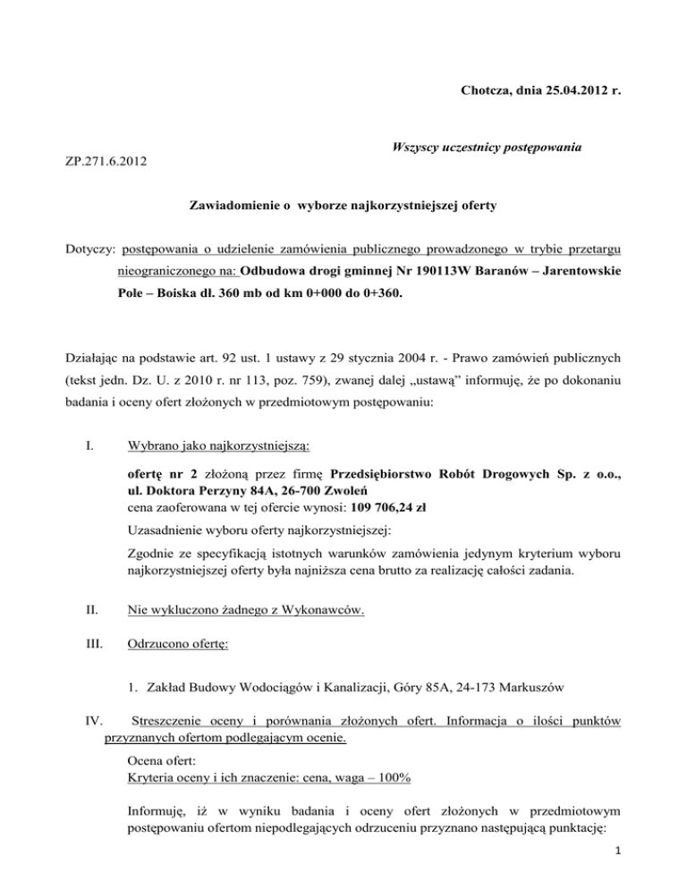 Chotcza, dnia 25.04.2012 r. Wszyscy uczestnicy postępowania ZP.271.6.2012 Zawiadomienie o wyborze najkorzystniejszej oferty Dotyczy: postępowania o udzielenie zamówienia publicznego prowadzonego w trybie przetargu nieograniczonego na: Odbudowa drogi gminnej Nr 190113W Baranów – Jarentowskie Pole – Boiska dł. 360 mb od km 0+000 do 0+360. Działając na podstawie art. 92 ust. 1 ustawy z 29 stycznia 2004 r. - Prawo zamówień publicznych (tekst jedn. Dz. U. z 2010 r. nr 113, poz. 759), zwanej dalej „ustawą” informuję, że po dokonaniu badania i oceny ofert złożonych w przedmiotowym postępowaniu: I. Wybrano jako najkorzystniejszą: ofertę nr 2 złożoną przez firmę Przedsiębiorstwo Robót Drogowych Sp. z o.o., ul. Doktora Perzyny 84A, 26-700 Zwoleń cena zaoferowana w tej ofercie wynosi: 109 706,24 zł Uzasadnienie wyboru oferty najkorzystniejszej: Zgodnie ze specyfikacją istotnych warunków zamówienia jedynym kryterium wyboru najkorzystniejszej oferty była najniższa cena brutto za realizację całości zadania. II. Nie wykluczono żadnego z Wykonawców. III. Odrzucono ofertę: 1. Zakład Budowy Wodociągów i Kanalizacji, Góry 85A, 24-173 Markuszów IV. Streszczenie oceny i porównania złożonych ofert. Informacja o ilości punktów przyznanych ofertom podlegającym ocenie. Ocena ofert: Kryteria oceny i ich znaczenie: cena, waga – 100% Informuję, iż w wyniku badania i oceny ofert złożonych w przedmiotowym postępowaniu ofertom niepodlegających odrzuceniu przyznano następującą punktację: 1 Firma (nazwa) lub nazwisko oraz adres wykonawcy Liczba pkt w kryterium cena PHU TRAN-MAR ul. Polna 38/1 26-600 Radom 93,42 Przedsiębiorstwo Robót Drogowych Sp. z o.o. ul. Doktora Perzyny 84A 26-700 Zwoleń 100,00 PHU Ryszard Kiełbiowski Gołębiów 109 27-300 Lipsko 67,58 STRABAG Sp. z o.o. ul. Parzniewska 10 05-800 Pruszków 87,43 Przedsiębiorstwo Robót Drogowych Puławy S.A. ul. Składowa 1 24-100 Puławy 77,64 Zakład Budowy Wodociągów i Kanalizacji Góry 85A 24-173 Markuszów Oferta odrzucona Jednocześnie informuję, że zgodnie z art. 94 ust. 1 pkt. 1 / 2 umowa w sprawie zamówienia publicznego może być zawarta po upływie 10 dni od przesłania niniejszego zawiadomienia. ..................................................... (podpis kierownika Zamawiającego) 2