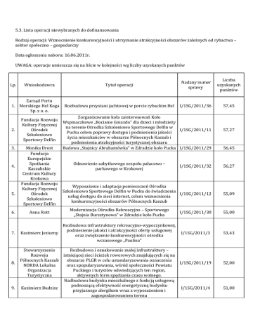 5.3. Lista operacji niewybranych do dofinansowania Rodzaj operacji: Wzmocnienie konkurencyjności i utrzymanie atrakcyjności obszarów zależnych od rybactwa – sektor społeczno – gospodarczy Data ogłoszenia naboru: 16.06.2011r. UWAGA: operacje umieszcza się na liście w kolejności wg liczby uzyskanych punktów Lp. Wnioskodawca Zarząd Portu 1. Morskiego Hel Koga Sp. z o. o. 2. 3. 4. 5. 6. 7. 8. 9. Fundacja Rozwoju Kultury Fizycznej Ośrodek Szkoleniowo Sportowy Delfin Monika Drost Fundacja Europejskie Spotkania Kaszubskie Centrum Kultury Krokowa Fundacja Rozwoju Kultury Fizycznej Ośrodek Szkoleniowo Sportowy Delfin Anna Rott Tytuł operacji Nadany numer sprawy Liczba uzyskanych punktów Rozbudowa przystani jachtowej w porcie rybackim Hel I/1SG/2011/36 57,45 Zorganizowanie koła zainteresowań Koło Wspinaczkowe „Bocianie Gniazdo” dla dzieci i młodzieży na terenie Ośrodka Szkoleniowo Sportowego Delfin w I/1SG/2011/11 Pucku celem poprawy dostępu i podniesienia jakości życia mieszkańców w obszarze Północnych Kaszub i podniesienia atrakcyjności turystycznej obszaru Budowa „Stajnicy Abrahamówka” w Zdradzie koło Pucka I/1SG/2011/29 Odnowienie zabytkowego zespołu pałacowo – parkowego w Krokowej 57,27 56,45 I/1SG/2011/32 56,27 Wyposażenie i adaptacja pomieszczeń Ośrodka Szkoleniowo Sportowego Delfin w Pucku do świadczenia I/1SG/2011/12 usług dostępu do sieci internet, celem wzmocnienia konkurencyjności obszarów Północnych Kaszub 55,09 Modernizacja Ośrodka Rekreacyjno – Sportowego „Stajnia Bursztynowa” w Zdradzie koło Pucka Rozbudowa infrastruktury rekreacyjno-wypoczynkowej, podniesienie jakości i atrakcyjności oferty usługowej Kazimierz Jeziorny oraz zwiększenie konkurencyjności ośrodka wczasowego „Paulina” Stowarzyszenie Rozbudowa i oznakowanie małej infrastruktury – Rozwoju istniejącej sieci ścieżek rowerowych znajdujących się na Północnych Kaszub obszarze PLGR w celu ustandaryzowania oznaczenia NORDA Lokalna oraz spopularyzowania, wśród społeczności Powiatu Organizacja Puckiego i turystów odwiedzjących ten region, Turystyczna aktywnych form spędzania czasu wolnego. Nadbudowa budynku mieszkalnego z funkcją usługową podnoszącą efektywność energetyczną budynku Kazimierz Budzisz przyjaznego alergikom wraz z wyposażeniem i zagospodarowaniem terenu I/1SG/2011/30 55,00 I/1SG/2011/3 53,43 I/1SG/2011/19 52,00 I/1SG/2011/4 51,00 10. Polskie Stowarzyszenie Klasy „Puck” Zakup sprzętu dla koła żeglarskiego rozpoczynającego działalność na Jeziorze Żarnowieckim I/1SG/2011/28 50,82 Parafia Rzymskokatolicka Remont zabytkowego muru wokół kościoła 11. I/1SG/2011/39 pw św Apostołów Rzymskokatolickiego pw. Św. Ap. Piotra i Pawła w Pucku Piotra i Pawła Puck 50,82 12. Zbigniew Skowronek 13. Łukasz Konkol 14. Yacht Klub „Stal” Gdynia 15. Gabriela Budzisz 16. Tomasz Staszewski 17. Witold Wojak Parafia Rzymskokatolicka 18. p.w. Narodzenia Najświętszej Marii Panny w Swarzewie 19. Jadwiga Piernicka 20. Alina AszendorfKlimczuk 21. Media Kaszebe Sp. z o. o. 22. Szymon Tabakiernik 23. Waldemar Będziński 24. Janusz Kamiński Budowa i wyposażenie hotelu „Dom Kuracyjny” we Władysławowie celem wdrożenie nowych usług szansą I/1SG/2011/20 na poprawę konkurencyjności firmy oraz zwiększenie atrakcyjności turystycznej Władysławowa Przebudowa budynku wchodzącego w skład układu I/1SG/2011/6 urbanistycznego miasta Pucka Organizacja żeglarskich kół zainteresowań dla dzieci i młodzieży na terenie powiatu puckiego przez Yacht Klub I/1SG/2011/31 Stal Gdynia Rozbudowa i remont obiektu turystycznego drogą do podwyższenia standardu świadczonych usług oraz wprowadzenia innowacyjnych usług turystycznych Chata solna i przygoda z pomerankami Budowa internetowego serwisu turystycznego, zawierającego szereg innowacyjnych rozwiązań, celem promocji regionu Powiatu Puckiego Rewitalizacja elementów zabytkowego Kościoła p.w. Narodzenia Najświętszej Marii Panny w Swarzewie narzędziem do wzmocnienia ducha tradycji Ziemi Kaszubskiej 49,27 49,18 I/1SG/2011/13 49,18 I/1SG/2011/10 49,00 I/1SG/2011/26 47,27 I/1SG/2011/38 Promocja Wsi w Dębogórze, gminy Kosakowo oraz całego regionu ziemi puckiej. Rozpowszechnianie kultury kaszubskiej oraz tradycji produkcji oraz I/1SG/2011/18 używania tabaki poprzez organizację festynu rodzinnego – III Dębogórskiego Święta Tabaki. „Morze żywi i bogaci” – promocja obszaru oddziaływania LSROR dla Pólnocnokaszubskiej Lokalnej I/1SG/2011/27 Grupy Rybackiej Budowa kompleksu domków letniskowych przyjaznych alergikom wraz z wyposażeniem i zagospodarowaniem terenu 50,27 I/1SG/2011/8 Ocalić od zapomnienia – utworzenie izby pamięci – I/1SG/2011/5 regionalnej kaszubskiej Budowa centrum pobytowego dla wędkarzy i ich rodzin celem wzrostu konkurencyjności regionu poprzez rozszerzenie oferty noclegowej dla mieszkańców gminy, I/1SG/2011/17 Północnokaszubskiej Lokalnej Grupy Rybackiej oraz turystów odwiedzjących region Moje miejsce na mapie Kaszub – kampania promocyjna 50,55 I/1SG/2011/1 43,27 43,09 42,45 41,36 40,36 39,71 25. Lokalna Grupa Działania „Kaszubska Droga” 26. Tomasz Cieślak 27. Wojciech Miłosz 28. Katarzyna Sędek 29. 30. 31. 32. 33. 34. 35. 36. 37. Pomorski Park Wodniacki – budowa rekreacyjnoedukacyjnej bazy turystycznej przeznaczonej do aktywnego wypoczynku nad wodą Rozwój infrastruktury turystycznej oraz propagowanie ekoturystyki poprzez budowę zespołu ogólnodostępnych całorocznych domków pełniących I/1SG/2011/15 funkcję domków letniskowych pn. „Ostoja na Kaszubach” Wakacje z tradycją w Chłapowie I/1SG/2011/25 Kampania promocyjna „Net w toni” – cykl trzech 30 min filmów dokumentalno promocyjnych ukazujących historię i tradycję połowów rybackich i rybackich rodów z obszaru Północnokaszubskiej Lokalnej Grupy I/1SG/2011/34 Rybackiej, do emisji na antenie TVP Gdańsk i TVP1 i do umieszczania w int