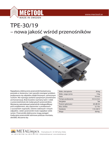 www.mectool.se MADE IN SWEDEN TPE-30/19 – nowa jakość wśród przenośników Napędzany elektrycznie przenośnik beztaśmowy pozwala w skuteczny i tani sposób rozwiązać problem pozbywania się odpadów dzięki liniowym, rytmicznym ruchom. Nie wymaga zasilania sprężonym powietrzem ani konserwacji. Brak kosztów wymiany taśm i rolek w przeciwieństwie do tradycyjnych przenośników. pod urządzeniem, aby zapomnieć o problemach z usuwaniem wyprasek, wiórów stalowych i innych odpadów. Jeden przenośnik może napędzać wiele rynien. Przenośniki elektryczne mogą zastąpić tradycyjne przenośniki taśmowe podczas montażu, obróbki, tłoczenia itp. Maks. obciążenie Maks. waga rynny Skok Tempo podawania Inicjator Poziom głośności Moc silnika Zasilanie Waga Przemysłowa 55 · 43-100 Tychy, Polska tel. +48 32 780 19 80 · fax +48 32 780 19 81 · [email protected] · www.metalimpex.pl 30 kg 5 kg 19 mm 4-8 m/min Tak 60 dB (A) 0,1 Kw 110-240 V 8,8 kg
